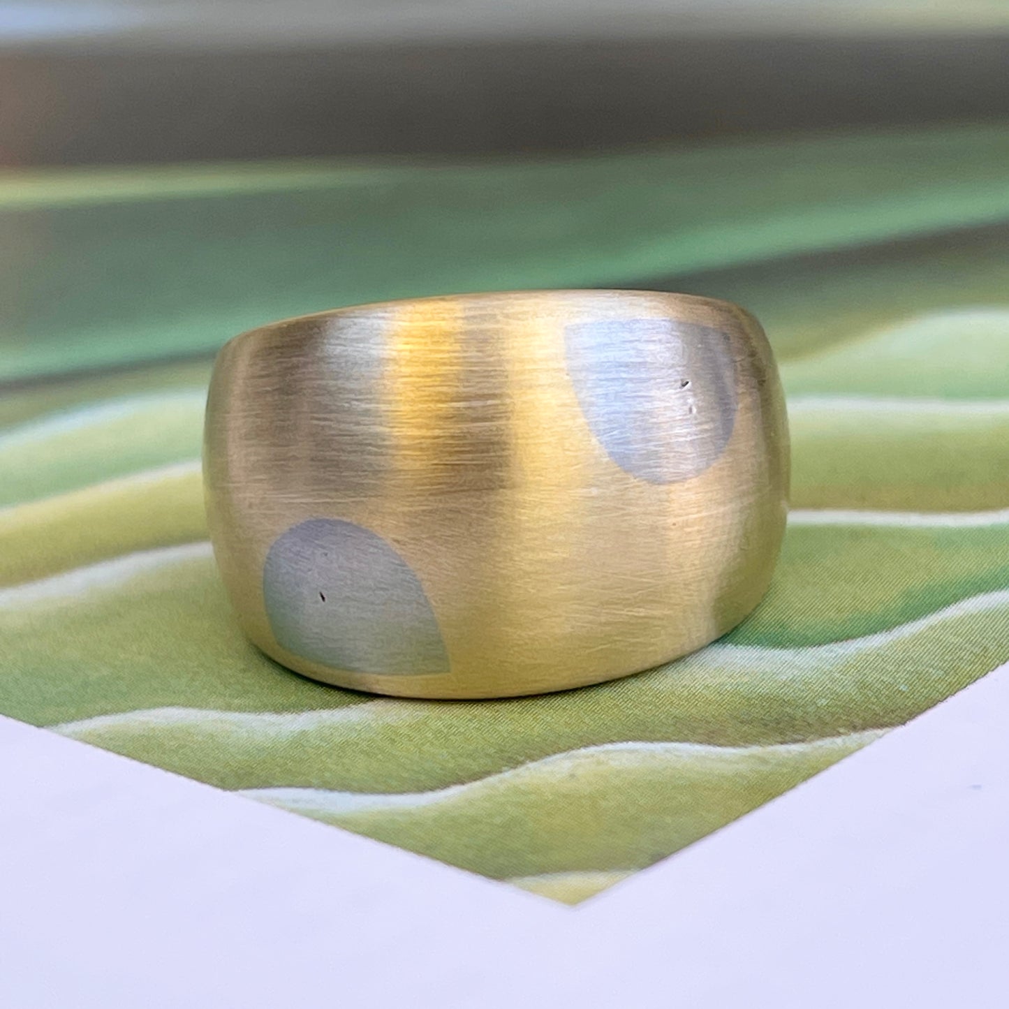 Vintage 18KT yellow gold + white gold mid-century modernist domed cigar band ring with circles design. Matte-finished, dual metal gold, with yellow gold band and white gold circles. A rare, absolutely statement-getting piece made in high-quality 18K gold! A ring with pedigree- originally purchased from premier Minneapolis, MN jeweler, Morgan Jeweler's, circa 1970's. Coordinating bracelet sold separately. Beautiful, chunkiness to this piece!