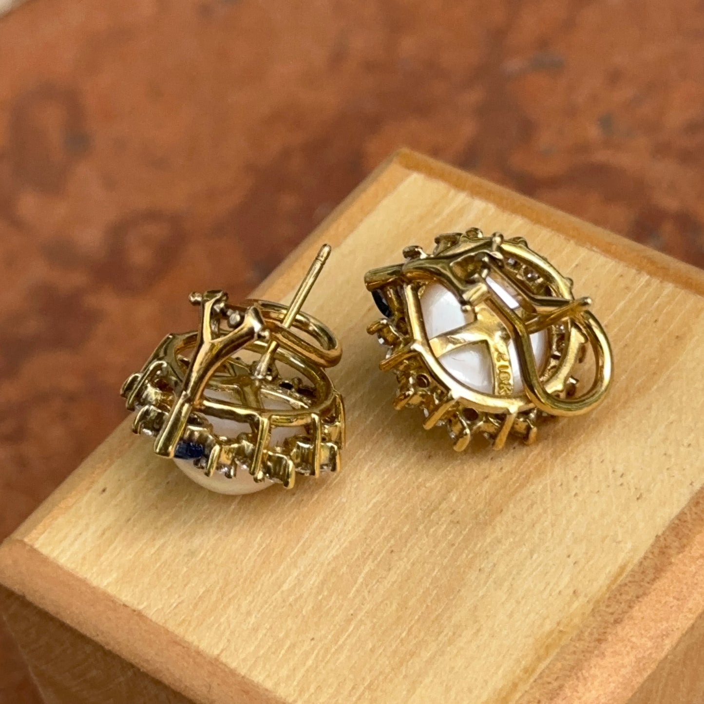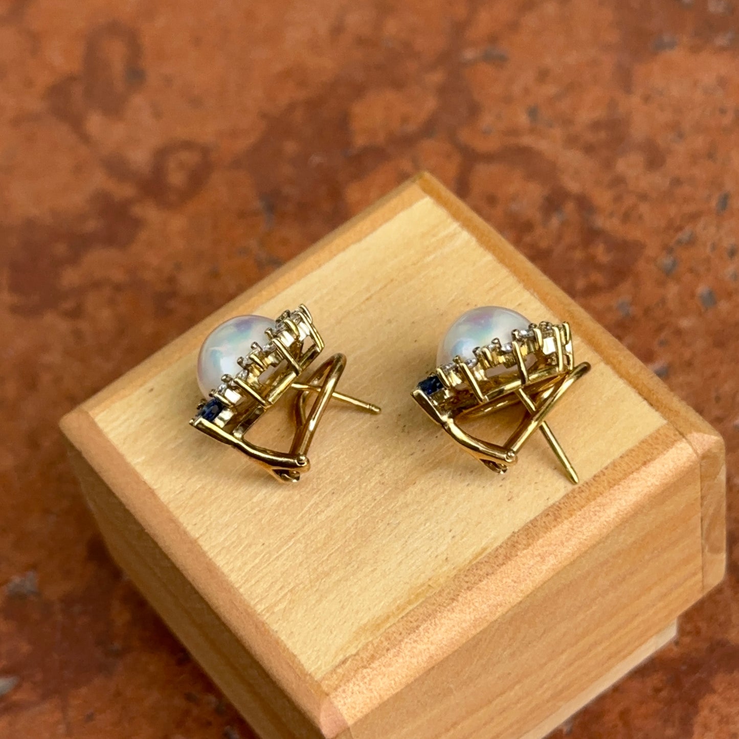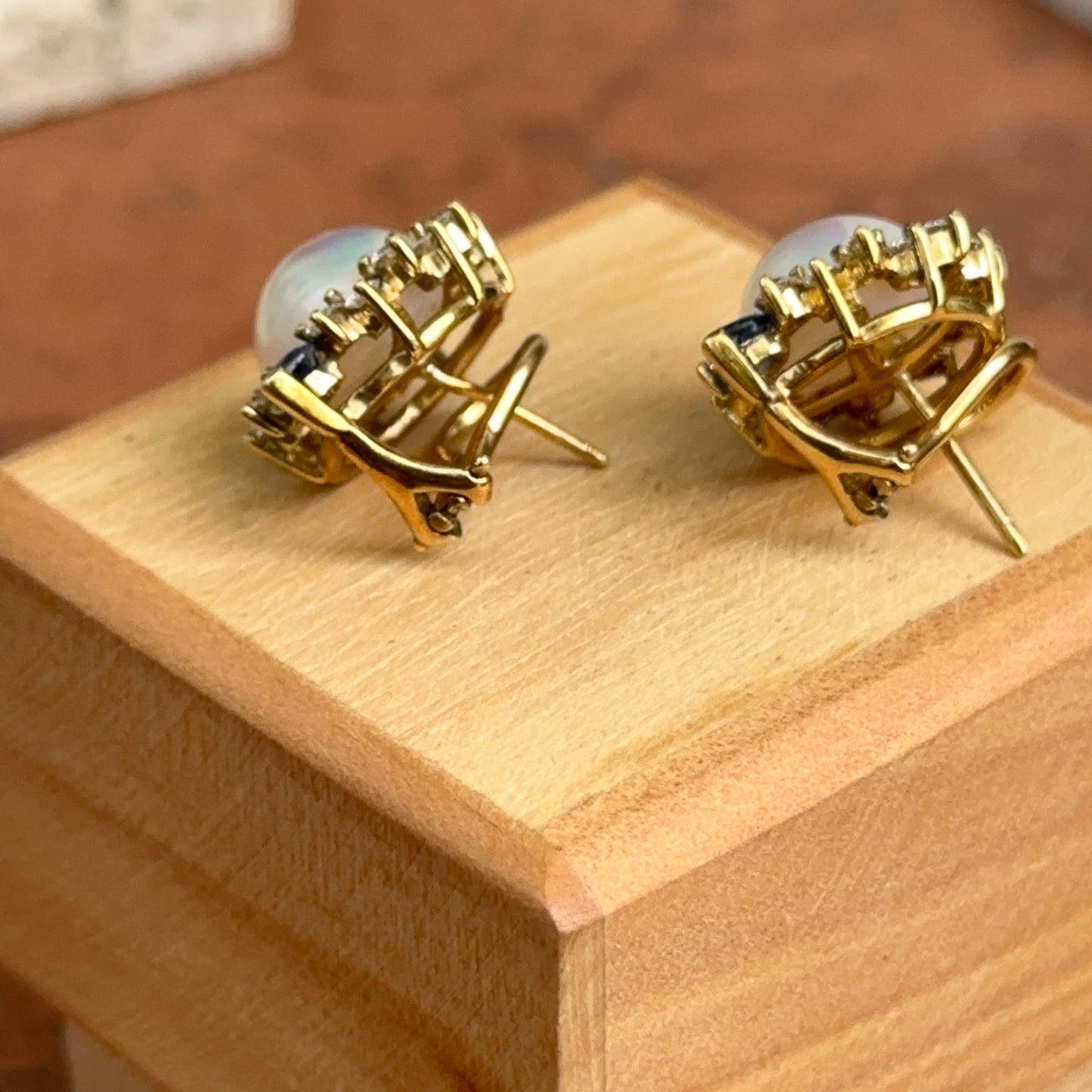 Estate 18KT Yellow Gold Mabe Pearl + Diamond Sapphire Halo Omega Earrings