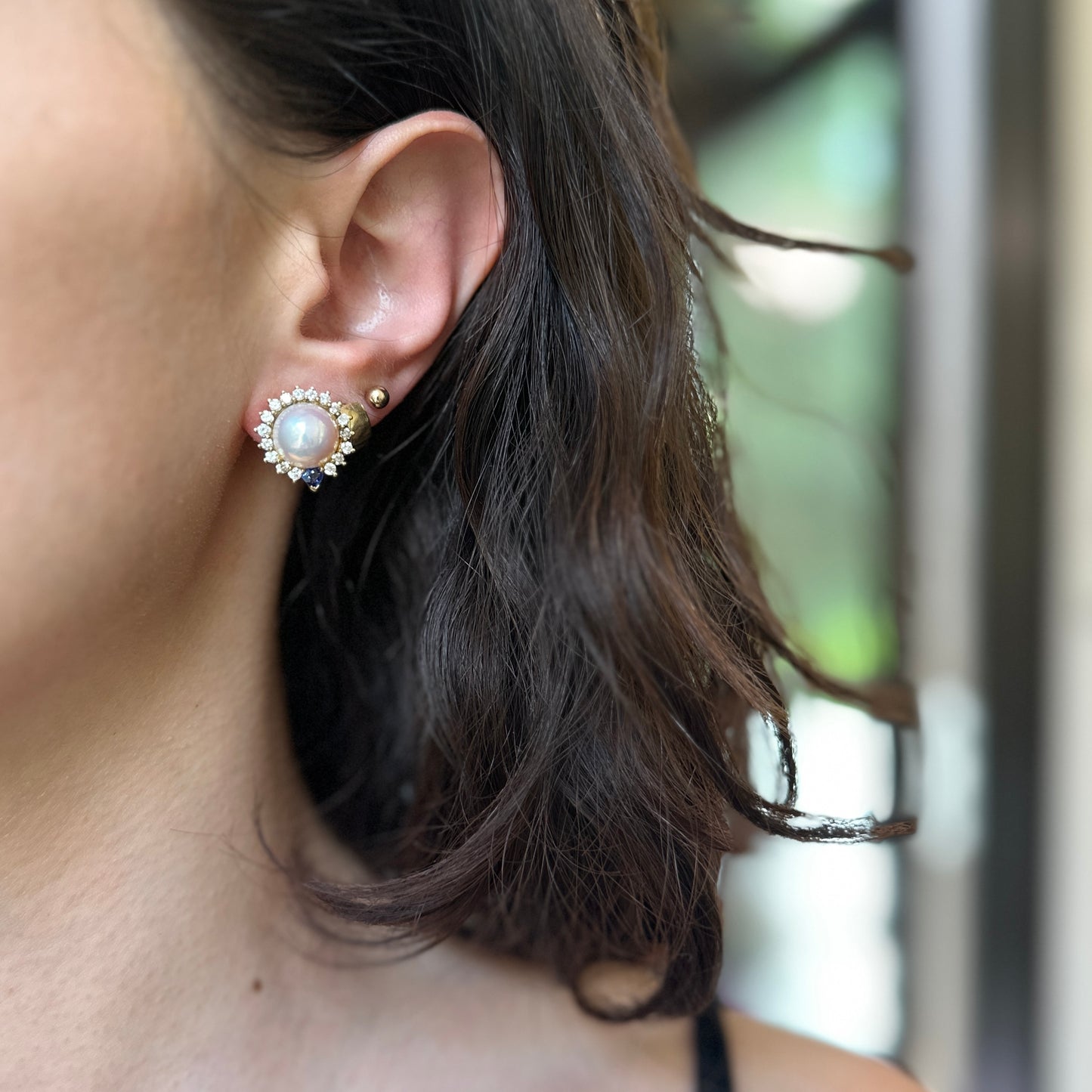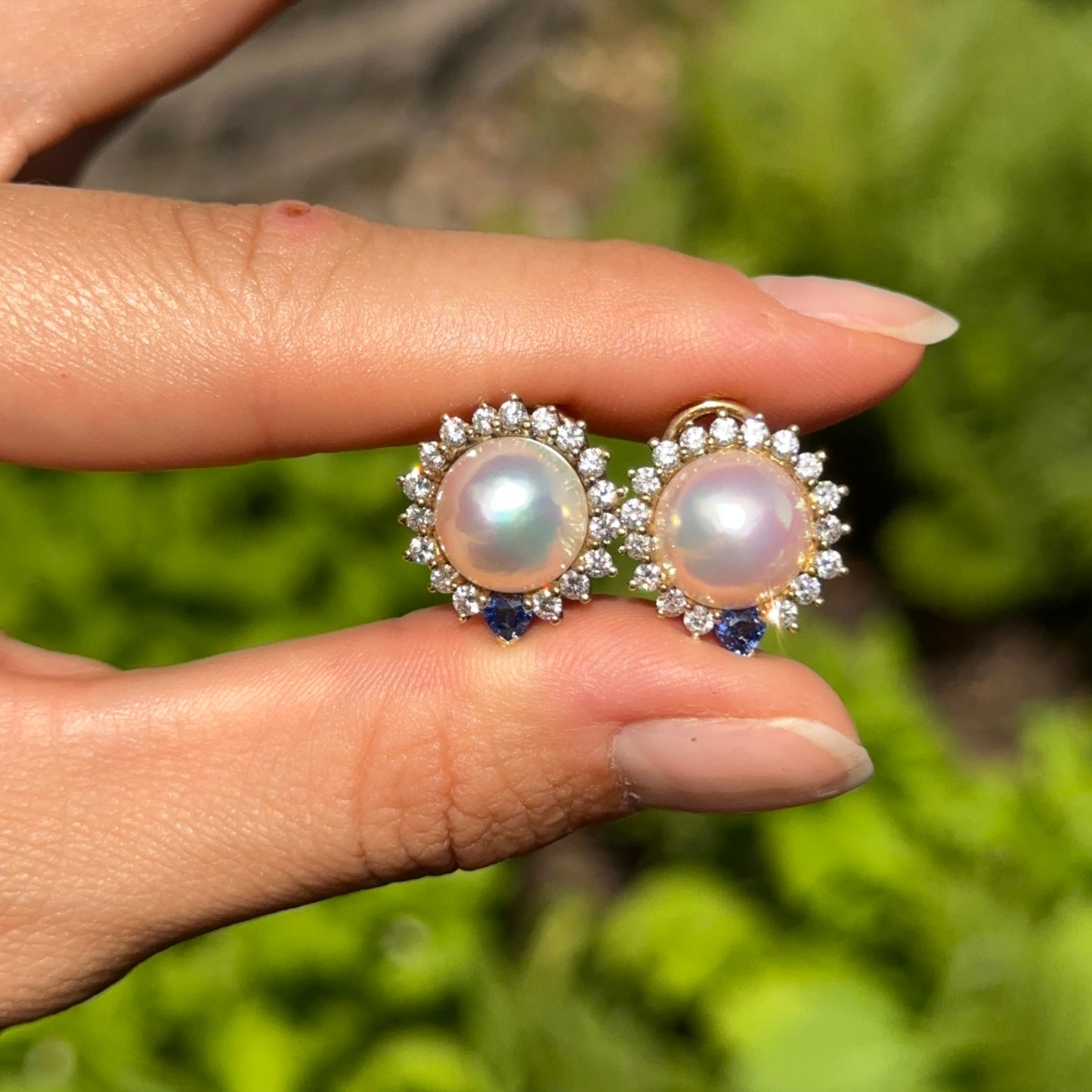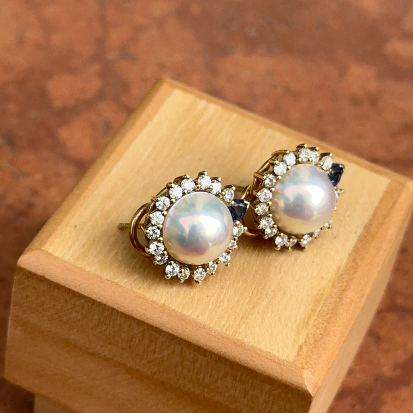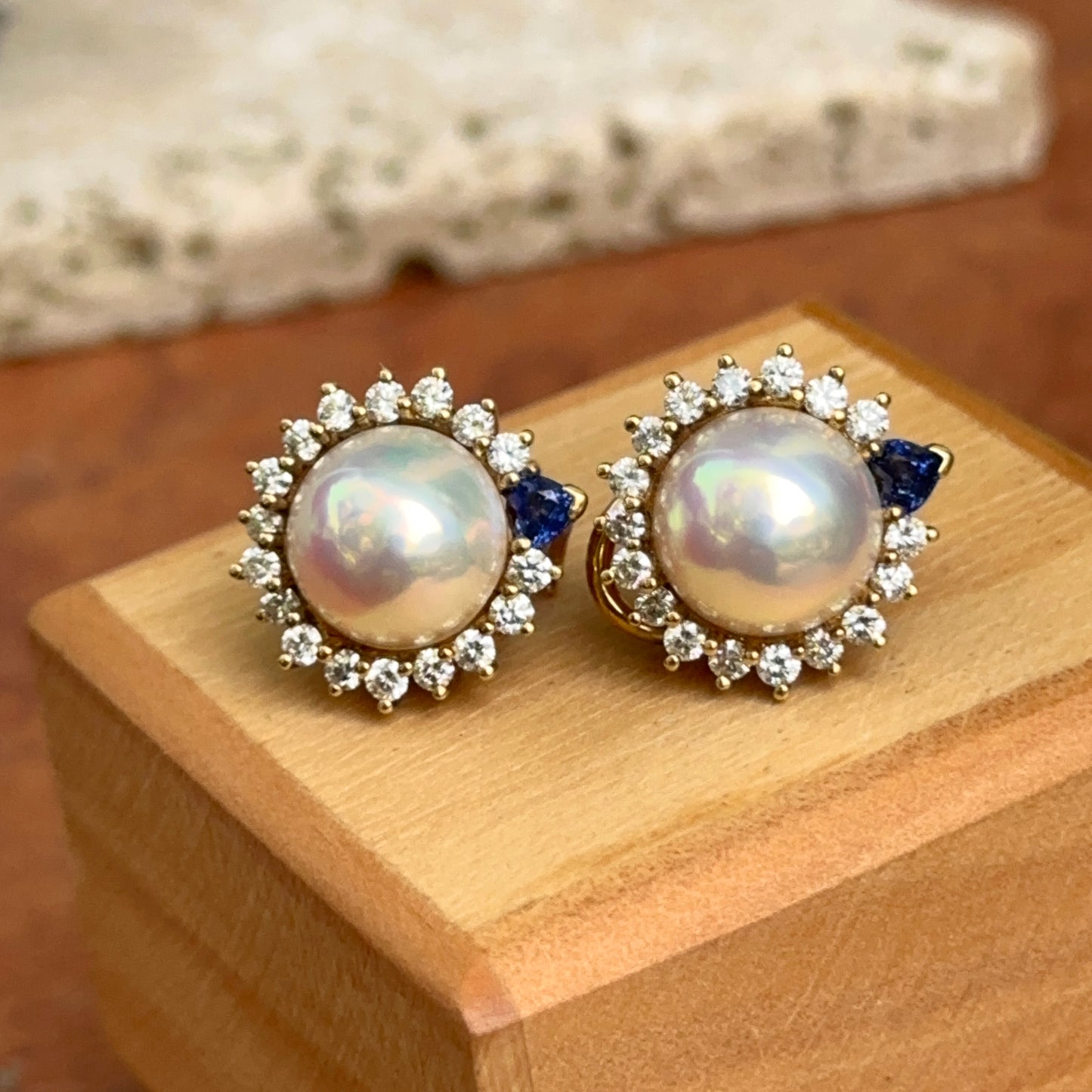 Estate 18KT Yellow Gold Mabe Pearl + Diamond Sapphire Halo Omega Earrings