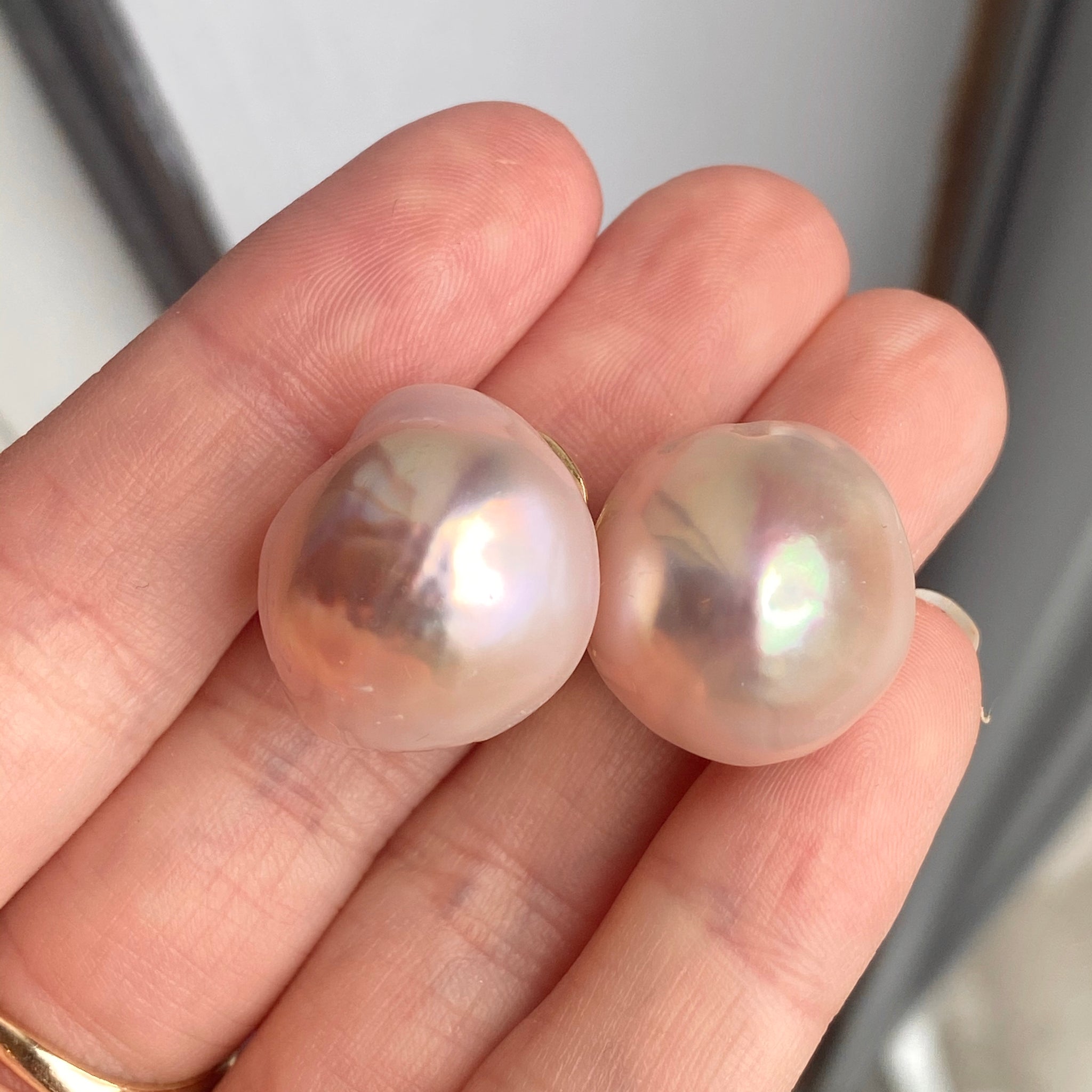 Estate/ Vintage Designer, YVEL, 18KT yellow gold large, pink, South Sea baroque shape pearl clip on earrings. Absolutely stunning and classy pair of large pearl earrings with light pink almost iridescent coloring. These pretties will definitely call all the attention!