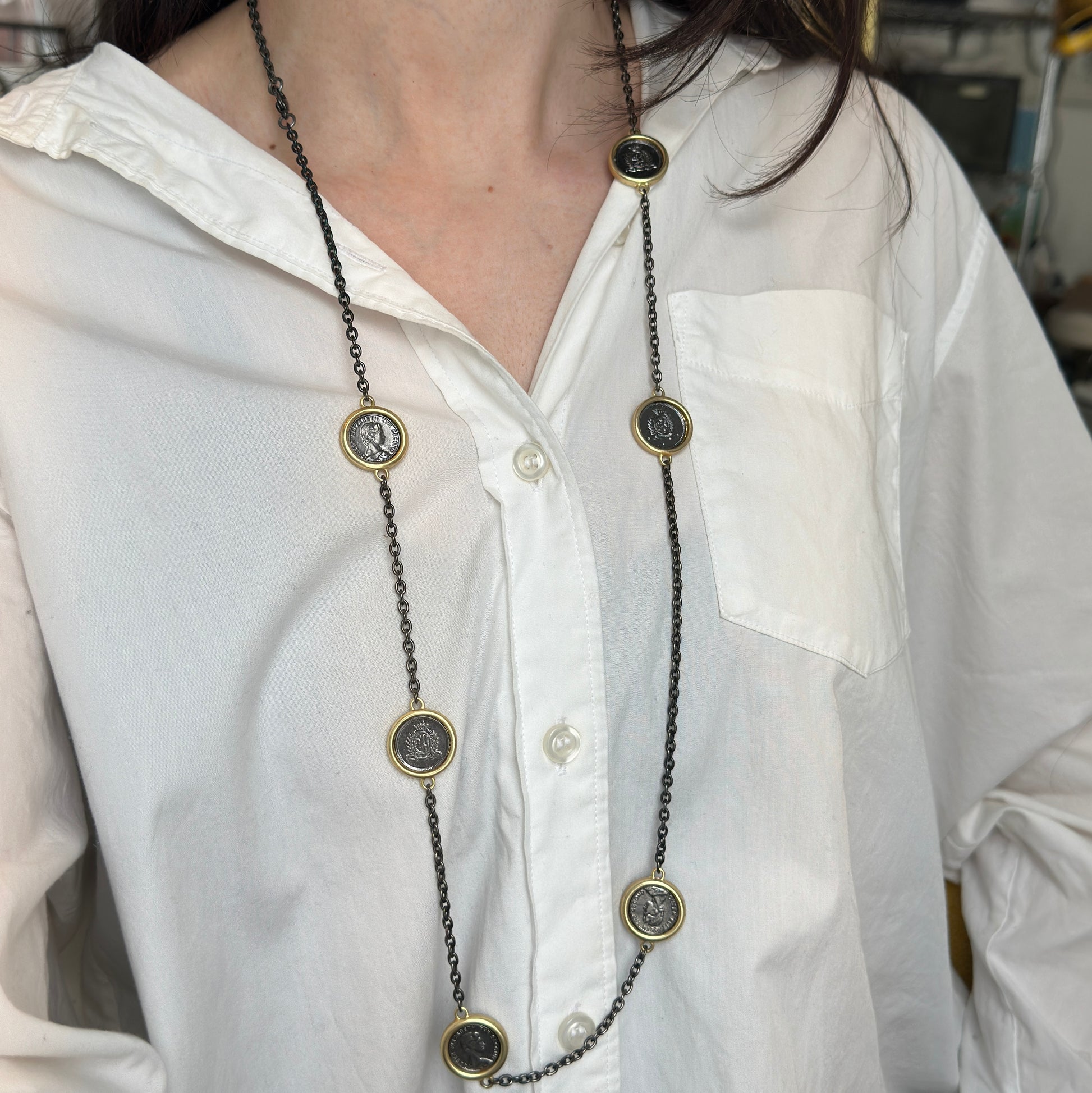 Vintage Estate Gold-Plated Replica Reversible Queen Elizabeth II Coin 36” Blackened Chain Necklace