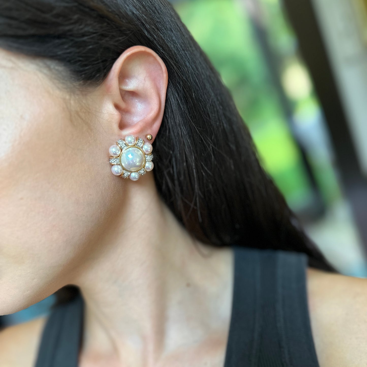 Estate Rita Tubus 14KT Yellow Gold Pearl + Pave Diamond Clip-On Earrings