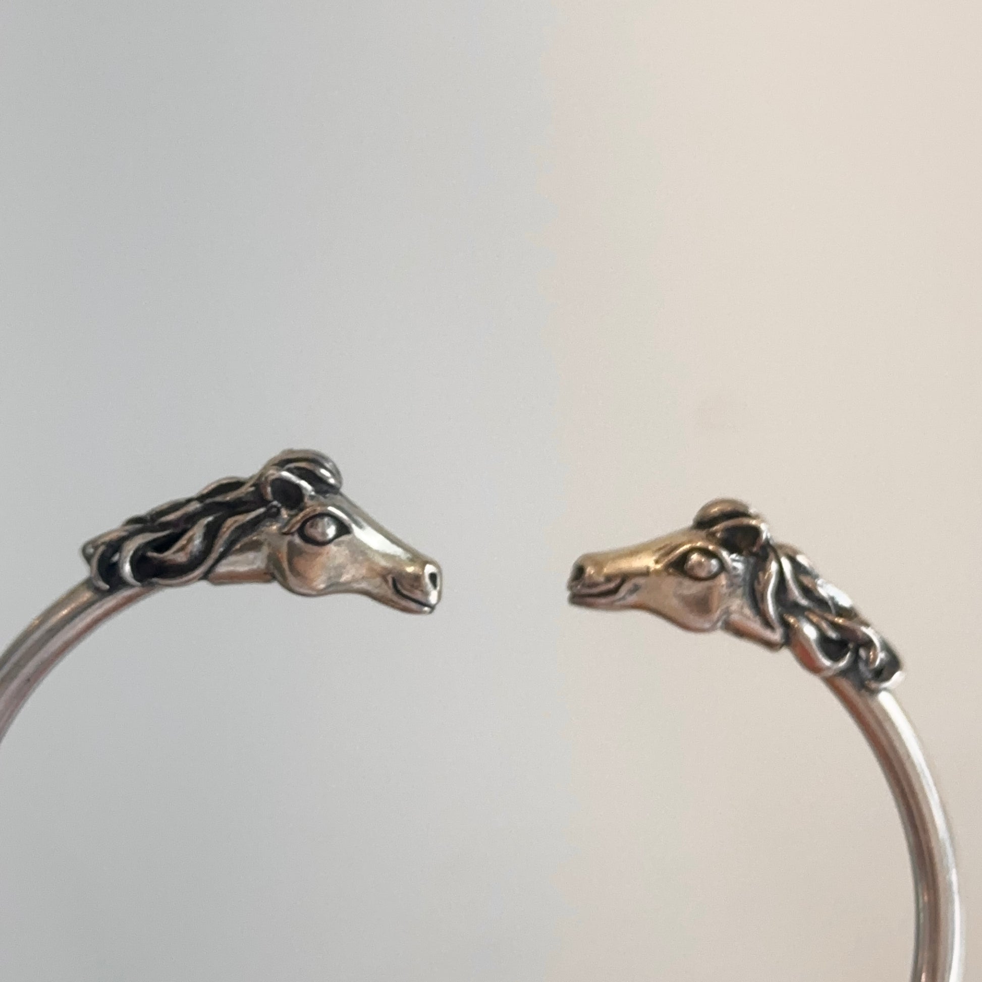 Estate Sterling Silver Antiqued Two Horse Head Open Cuff Bracelet