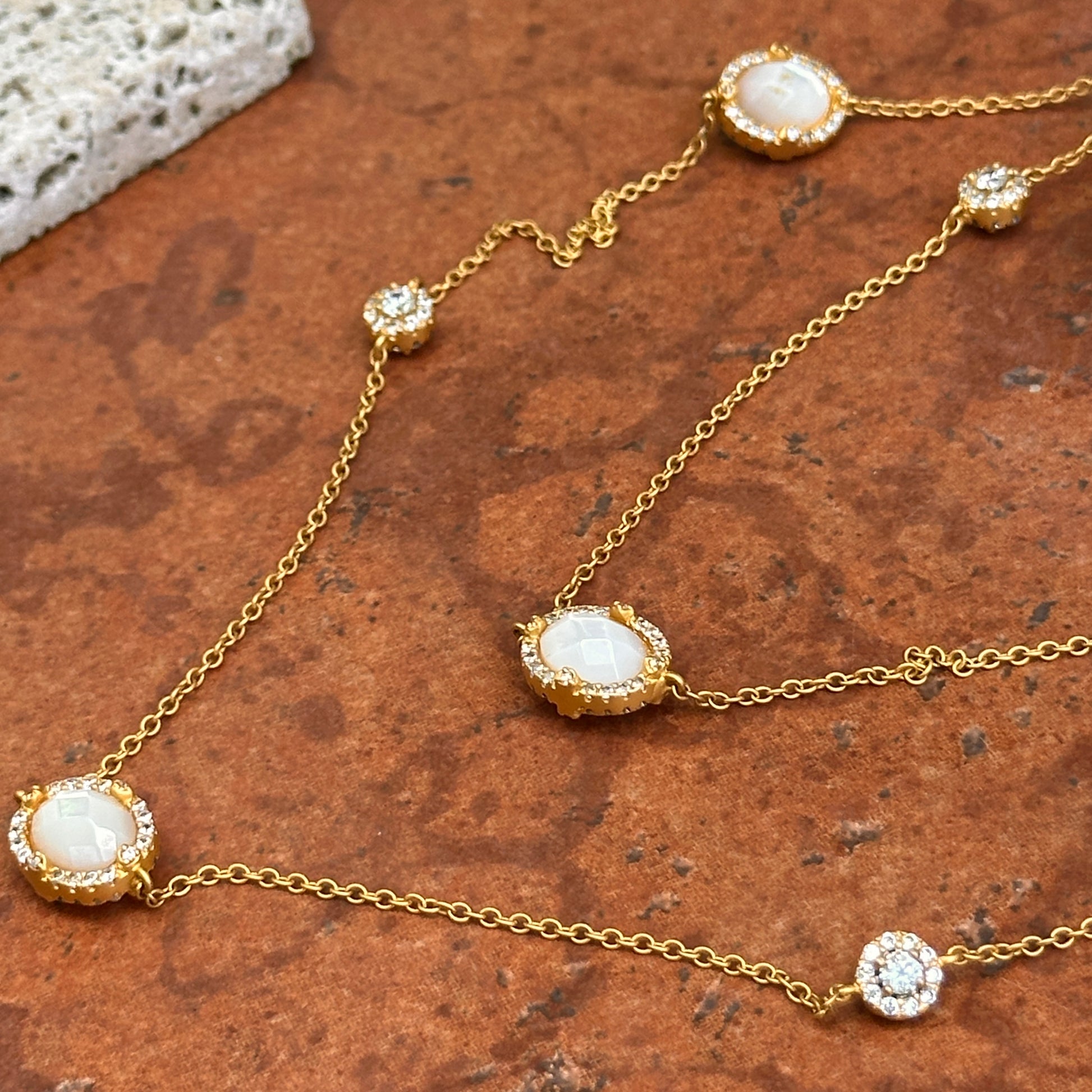 Estate Sterling Silver Yellow Gold Plated Mother of Pearl + Cubic Zirconia Freida Rothman Station Necklace 36"