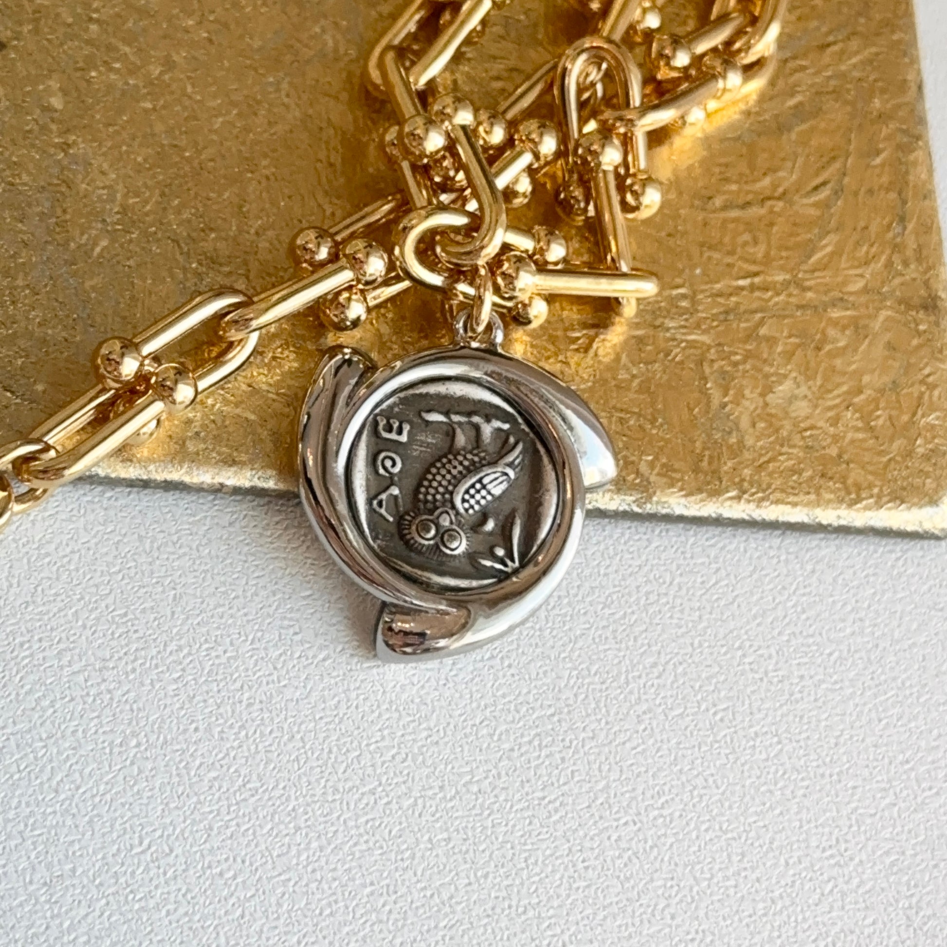 Vintage Gold-Tone Chain Ancient Replica Roman Coin + White Stones Bezel Necklace 19" Length