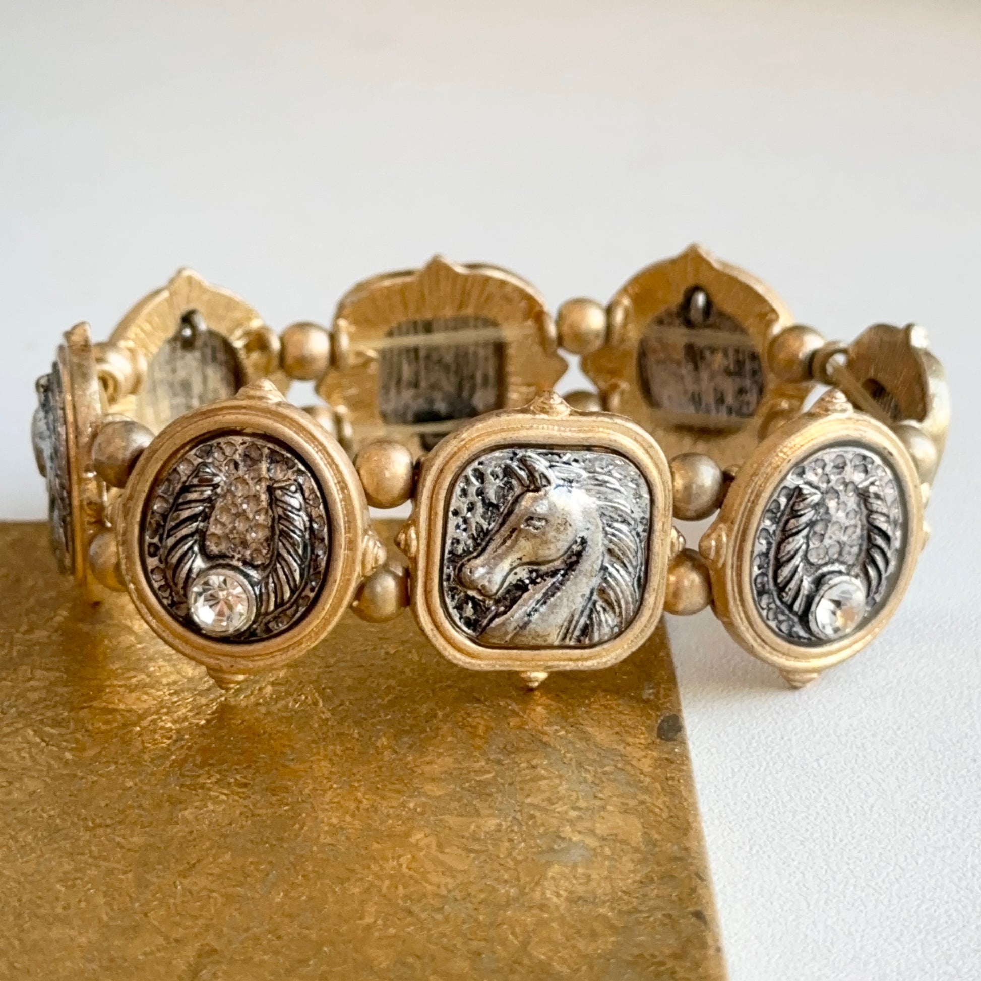 Estate Yellow Gold Tone Moveable Stretch Horse + Horseshoe Link Bracelet