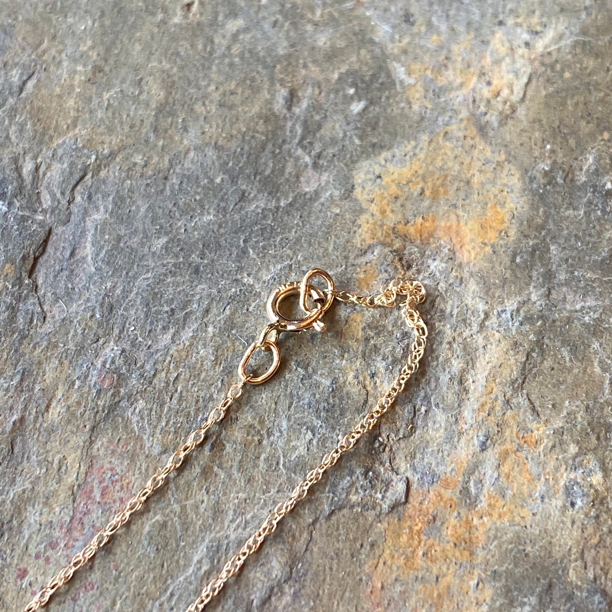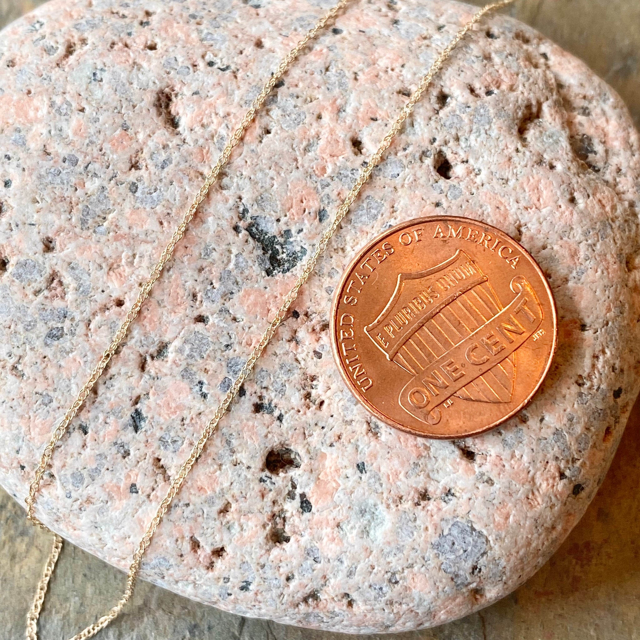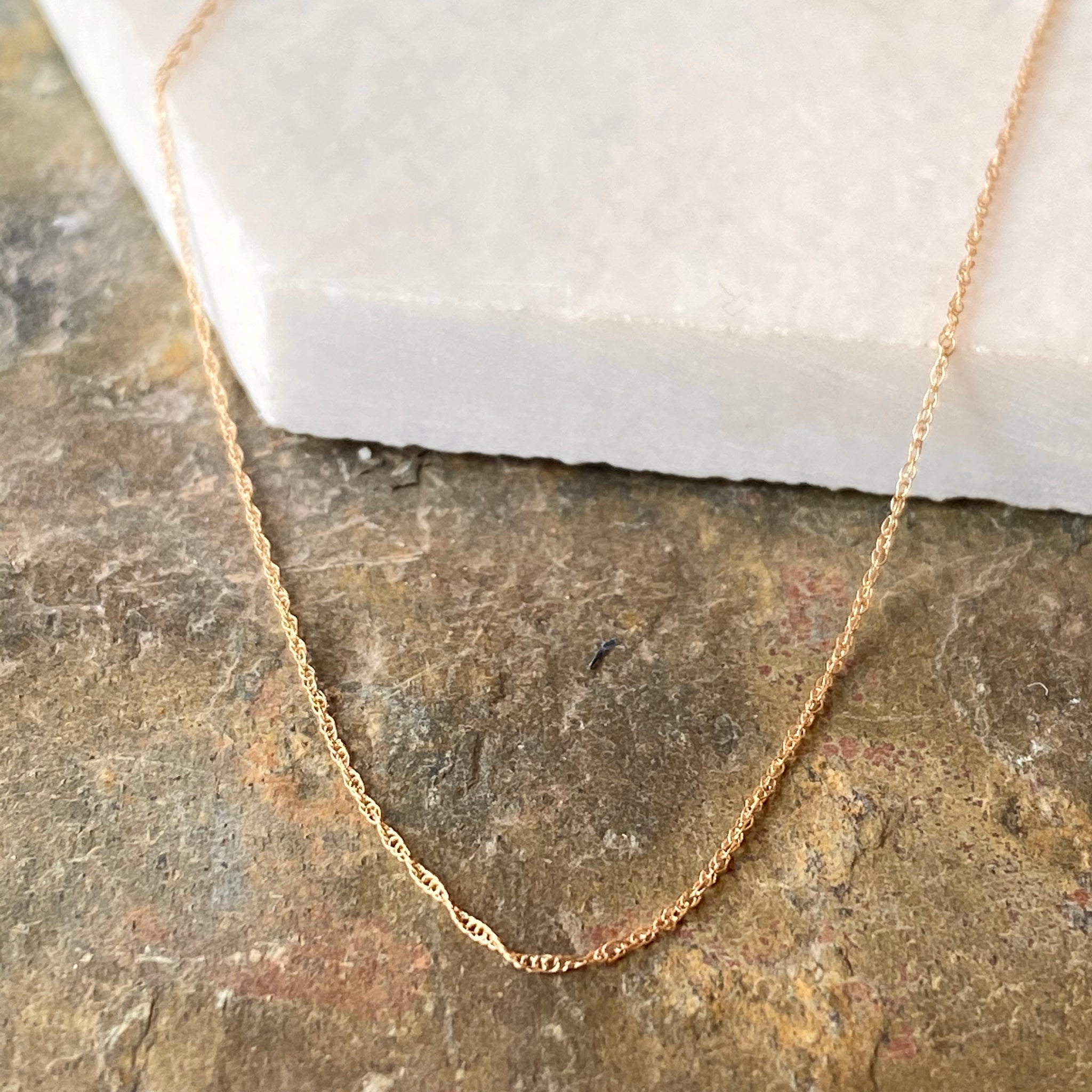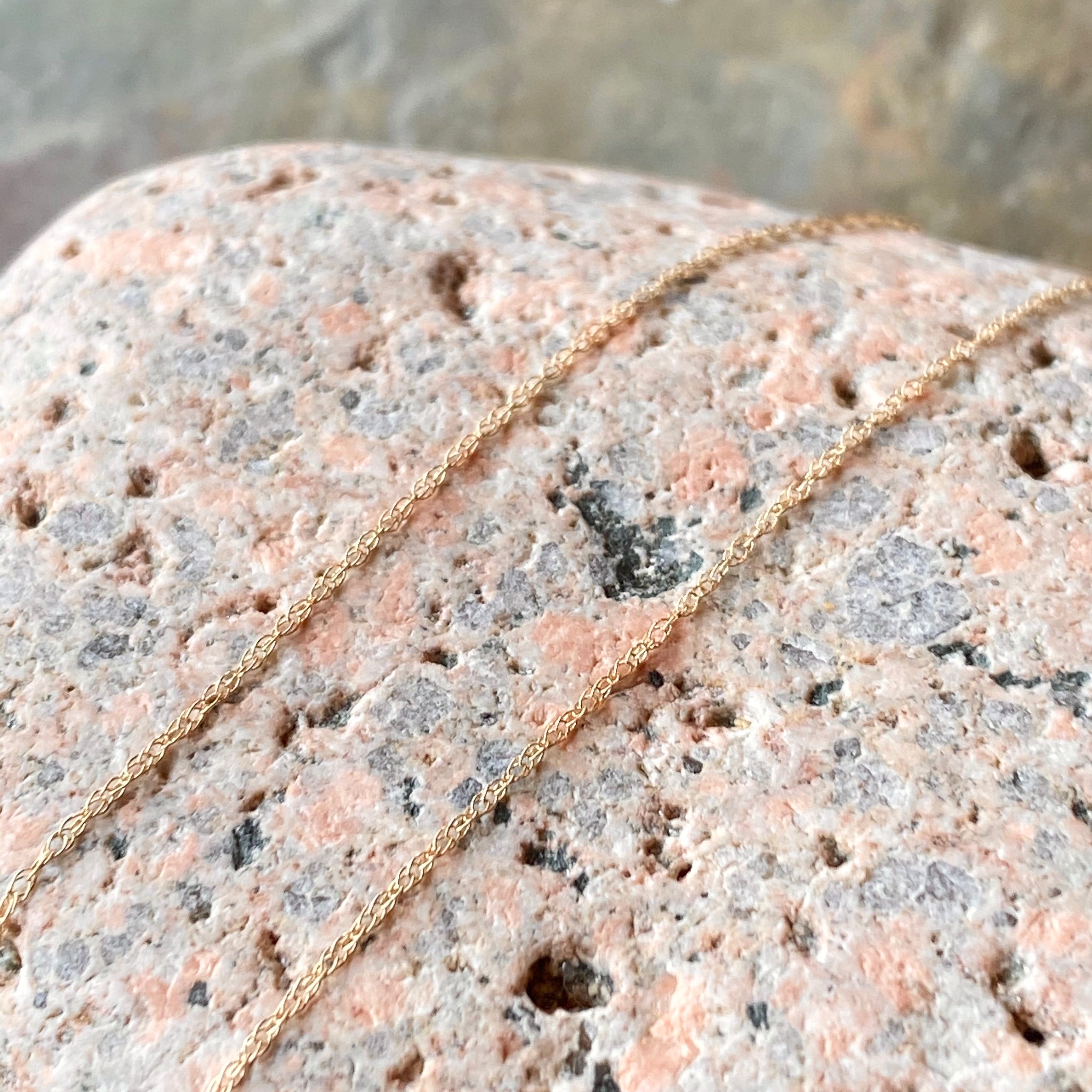 10KT yellow gold thin + super fine rope chain. Very fine + delicate chain. An everyday rope chain necklace pairs well with any pendant. Also available in 14K gold.