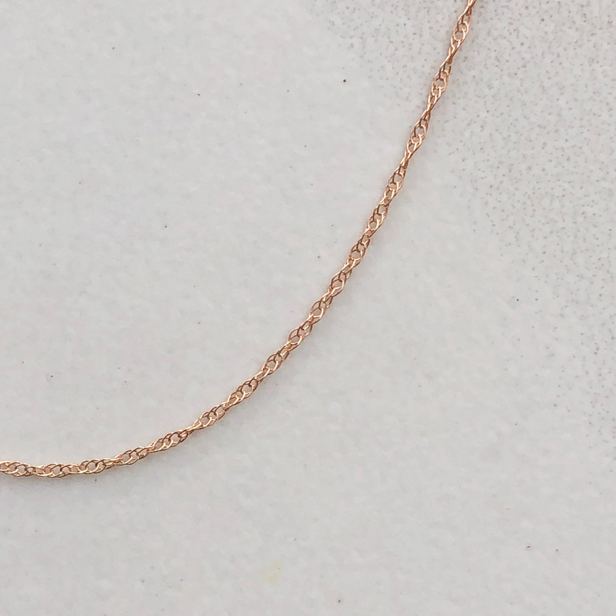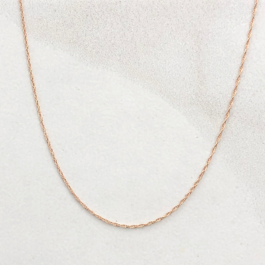10KT rose gold super fine baby rope link cable chain. Called a "Baby Rope" because it is the thinnest of all rope chains available. Perfect for a light look or to pair with a pendant!
