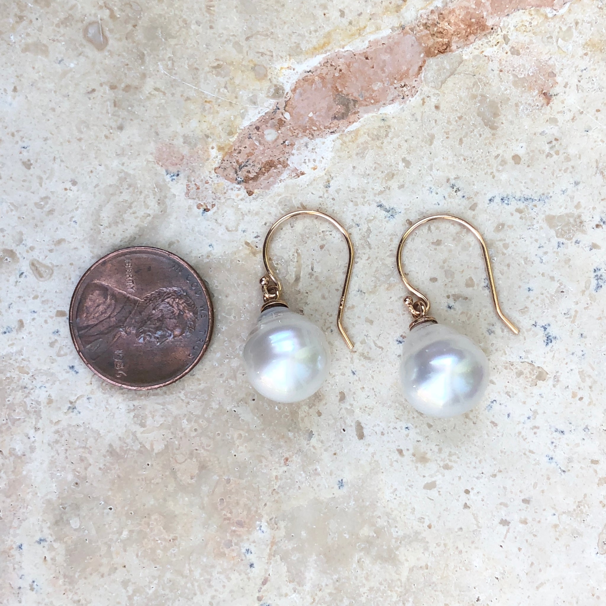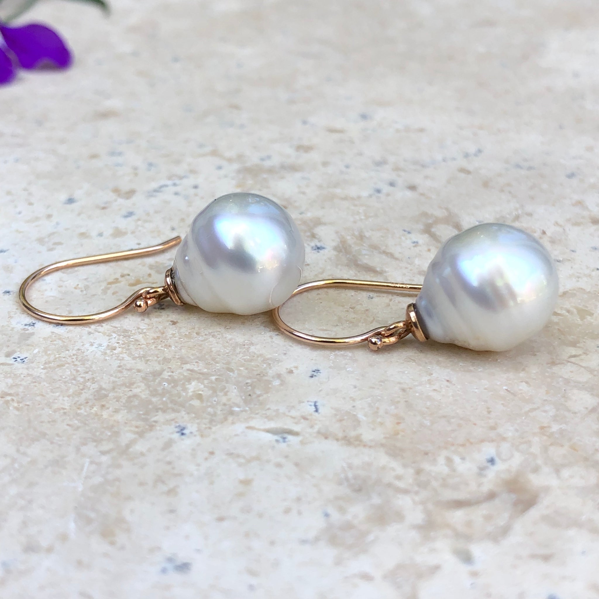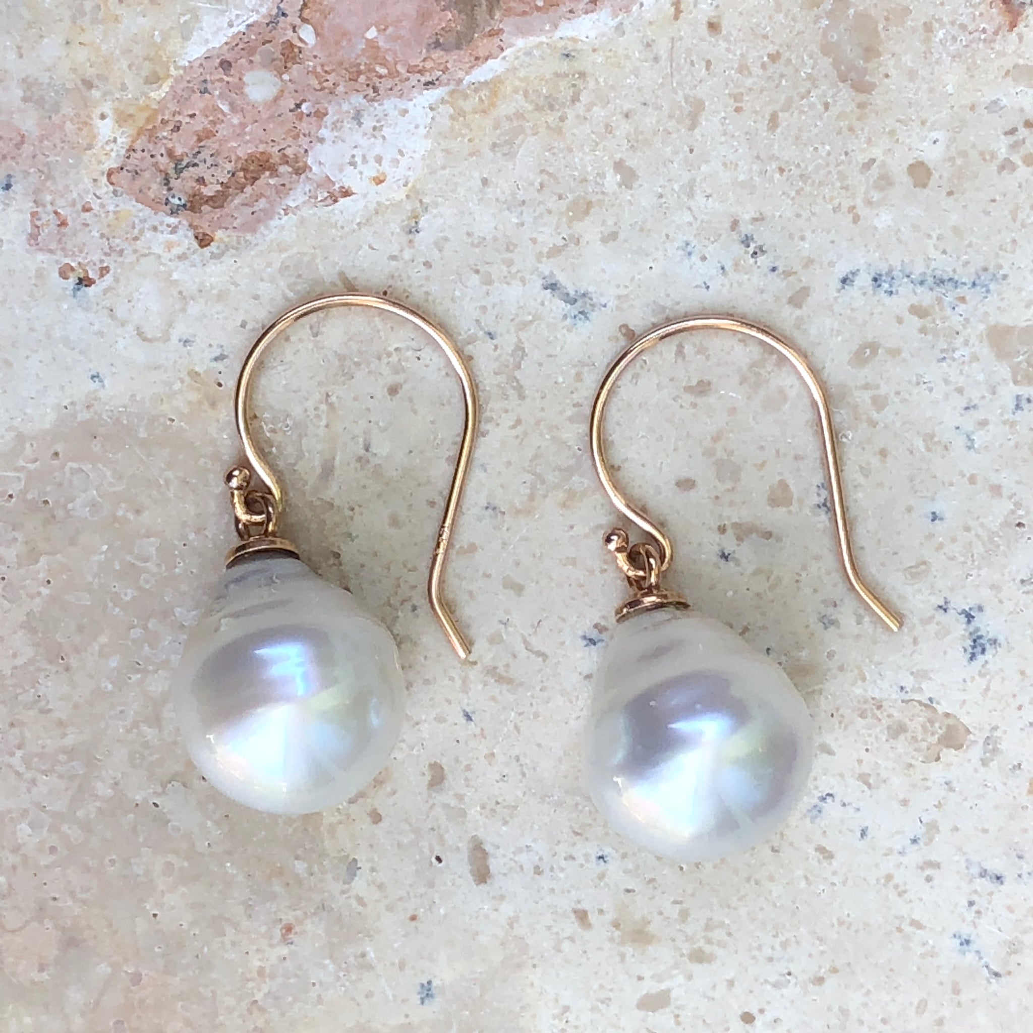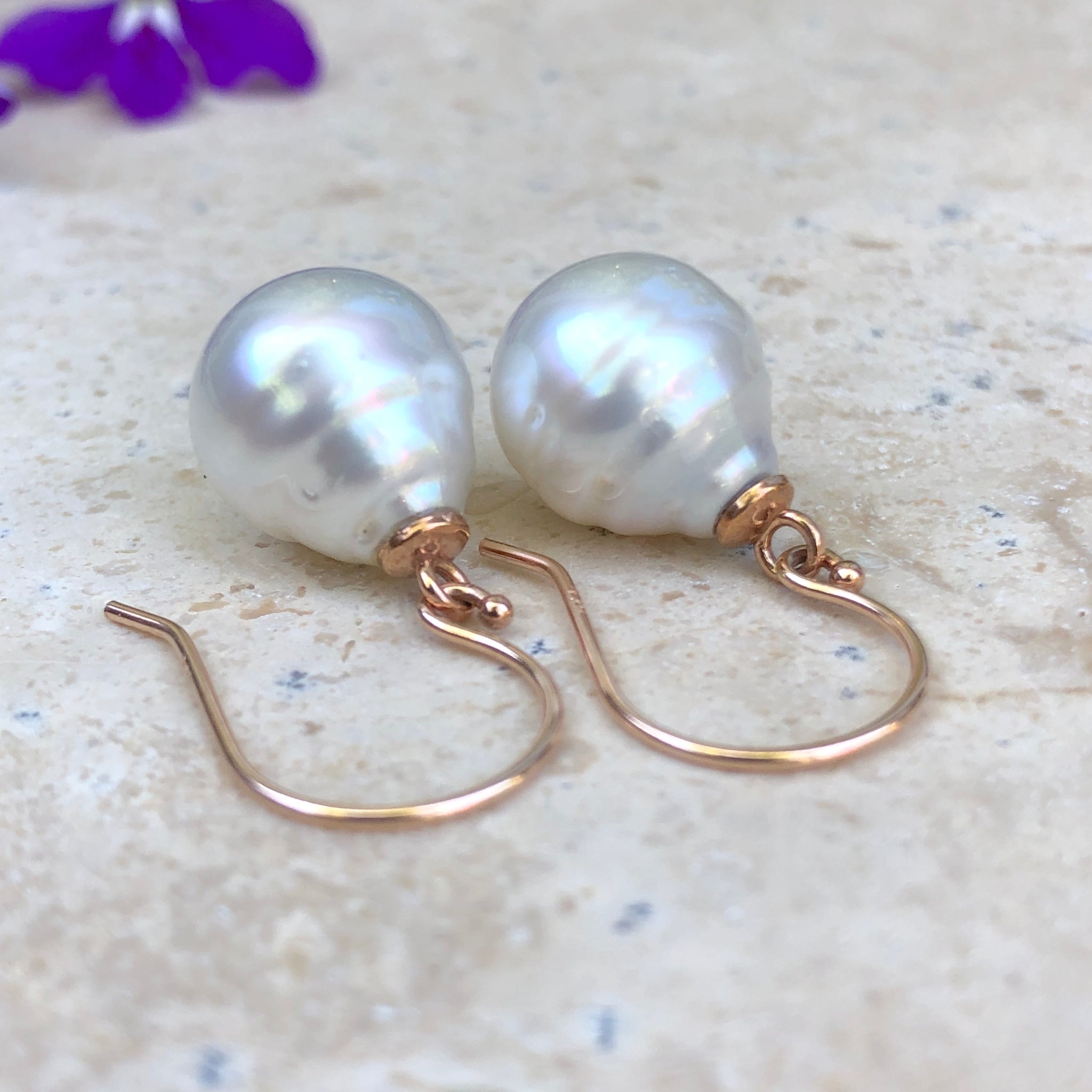 14KT rose gold + Paspaley South Sea Pearl dangle/drop earrings on Euro-wire. These are a great versatile item. The Pearls can be removed from the ear wires + worn with other earrings, etc, and the ear wires can be worn with other charms.