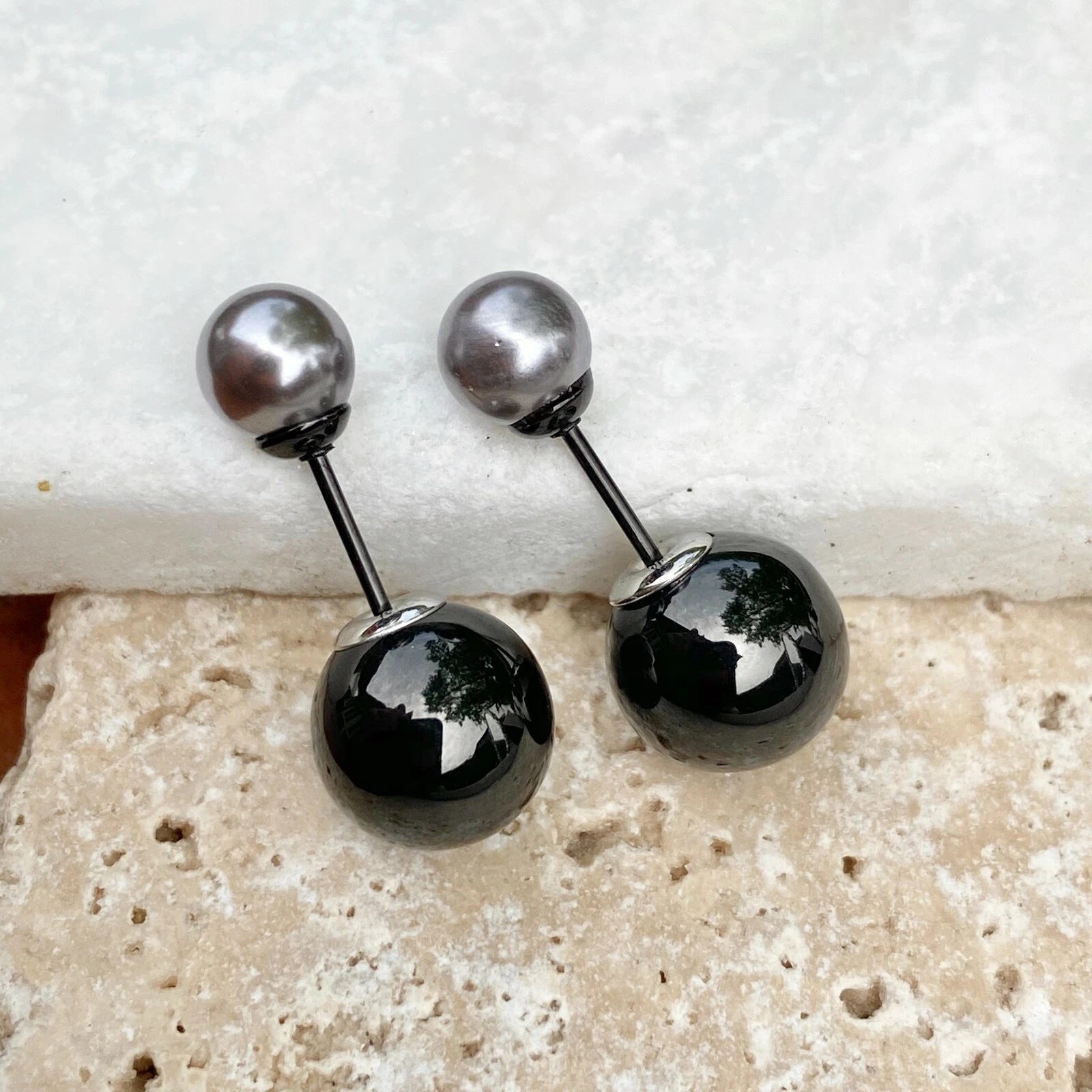 These double-ended stainless steel earrings feature two round balls differing in size—a 6mm simulated gray pearl on the front post, and a 10mm black stainless steel ball that attaches to the ear post at the back of the ear.