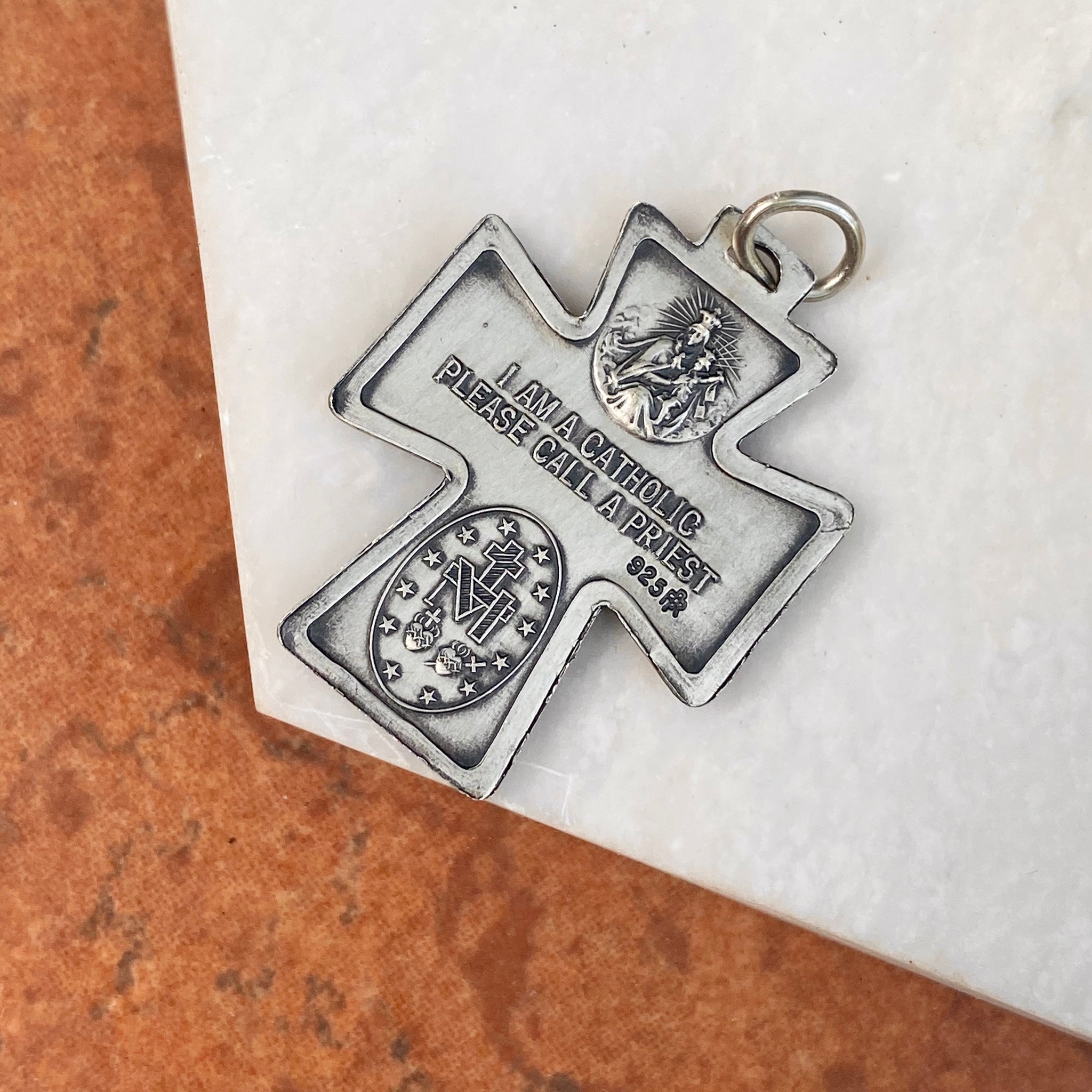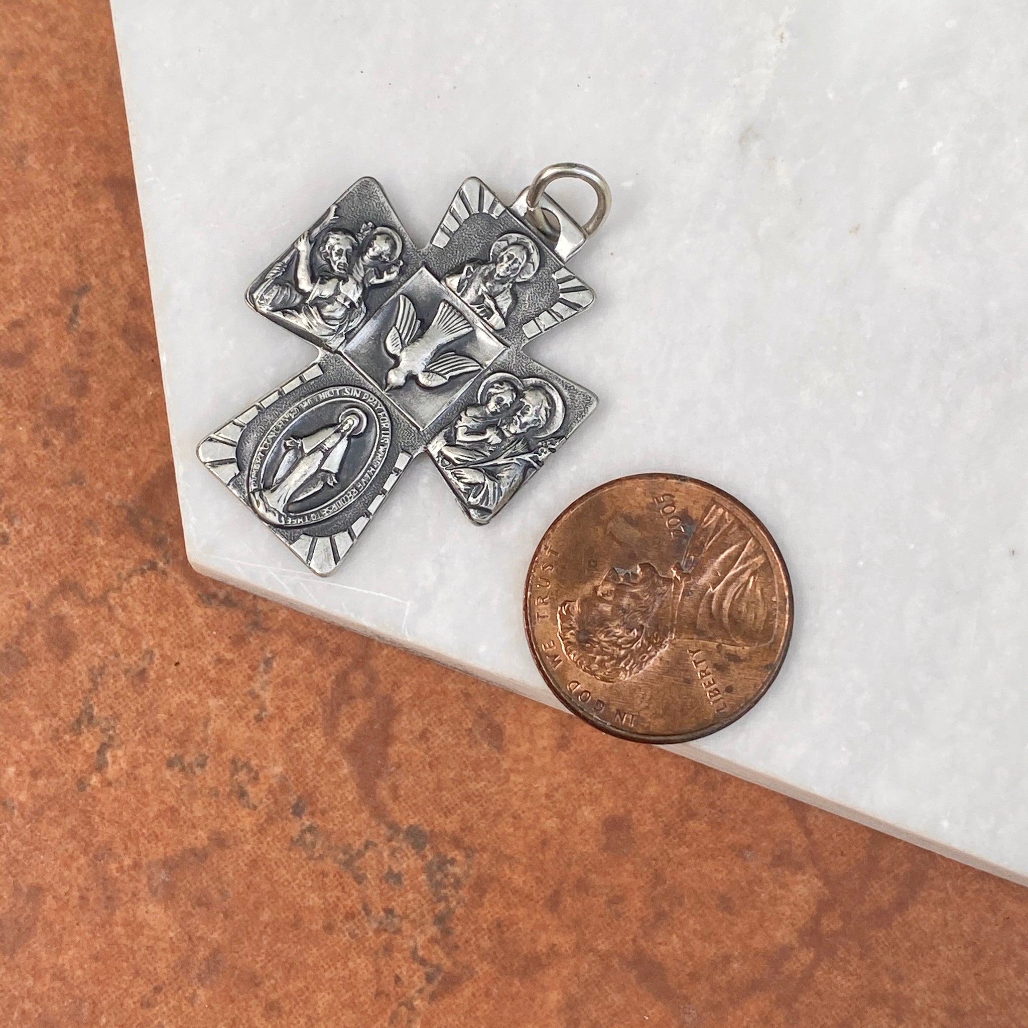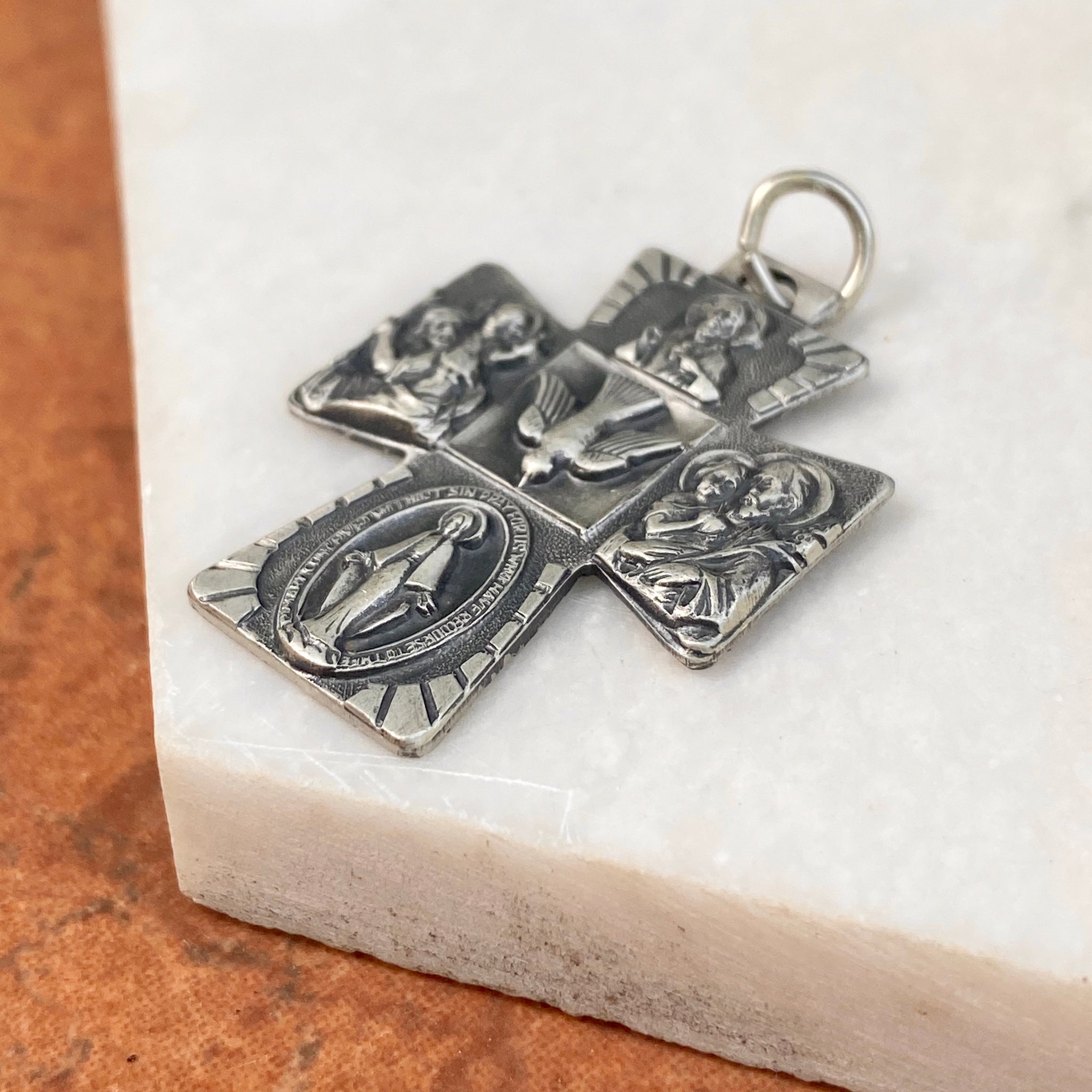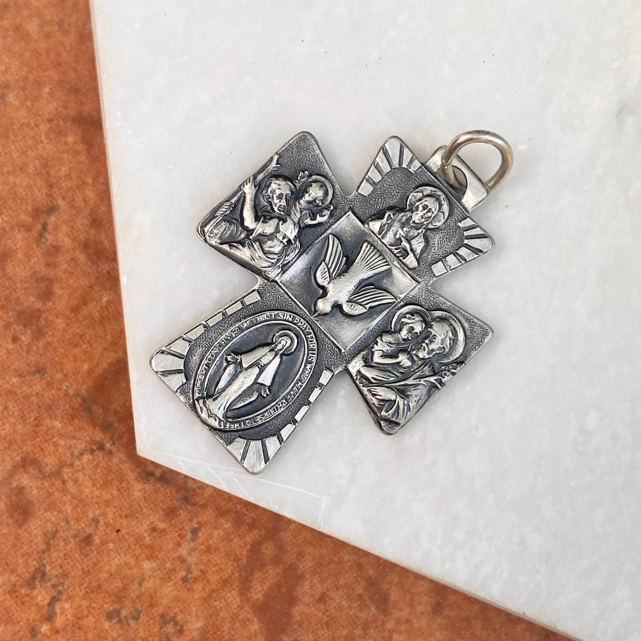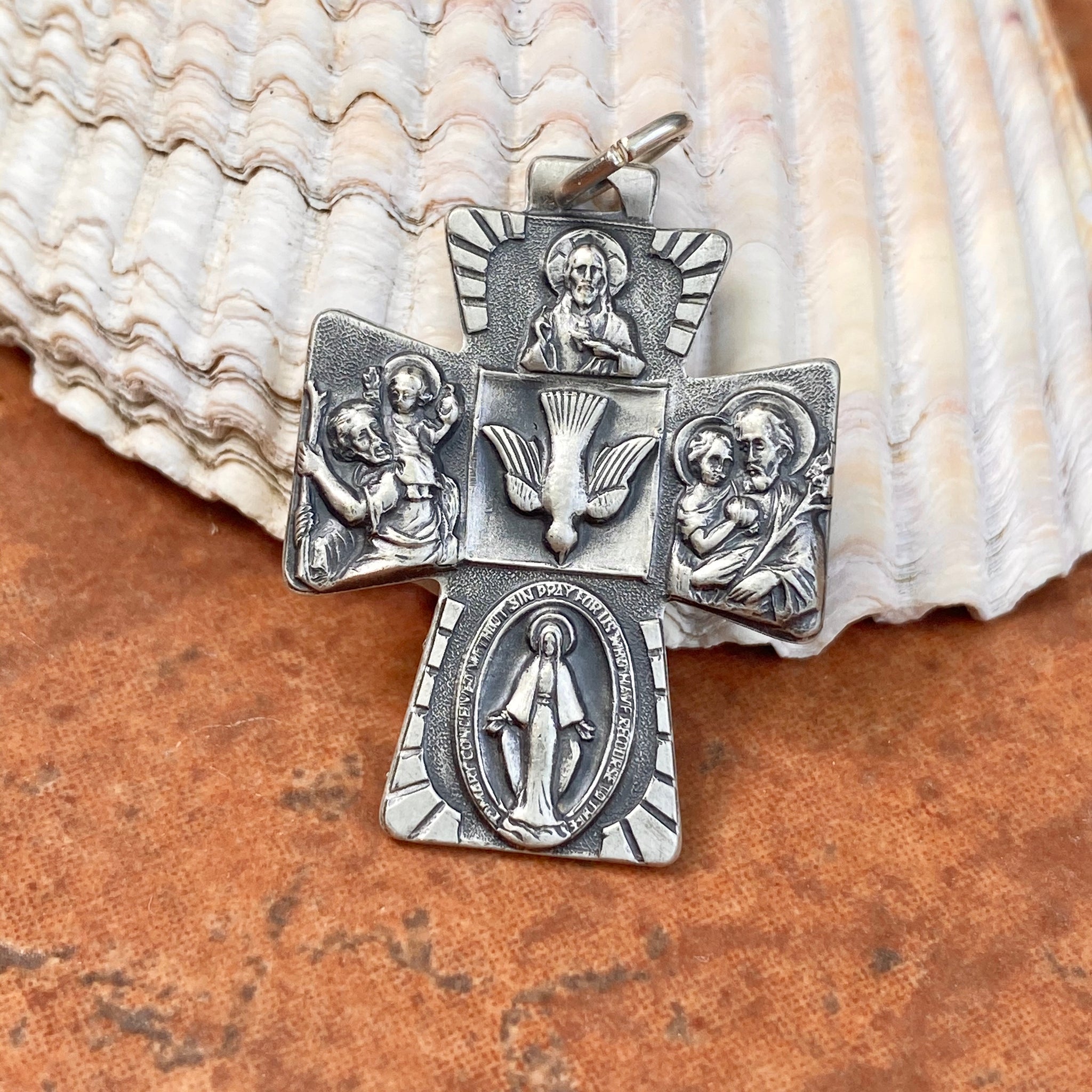 Sterling silver antiqued-finish engraved four-way Catholic cross medal pendant. Antiqued-finish really shows off the details on the cross! The Four Way Cross Medal includes the Sacred Heart at the top, St.Christopher on the right, Miraculous Mary on the bottom, and St.Joseph on the left. Also known as a cruciform. Wear this medal on a silver chain necklace or cord necklace.