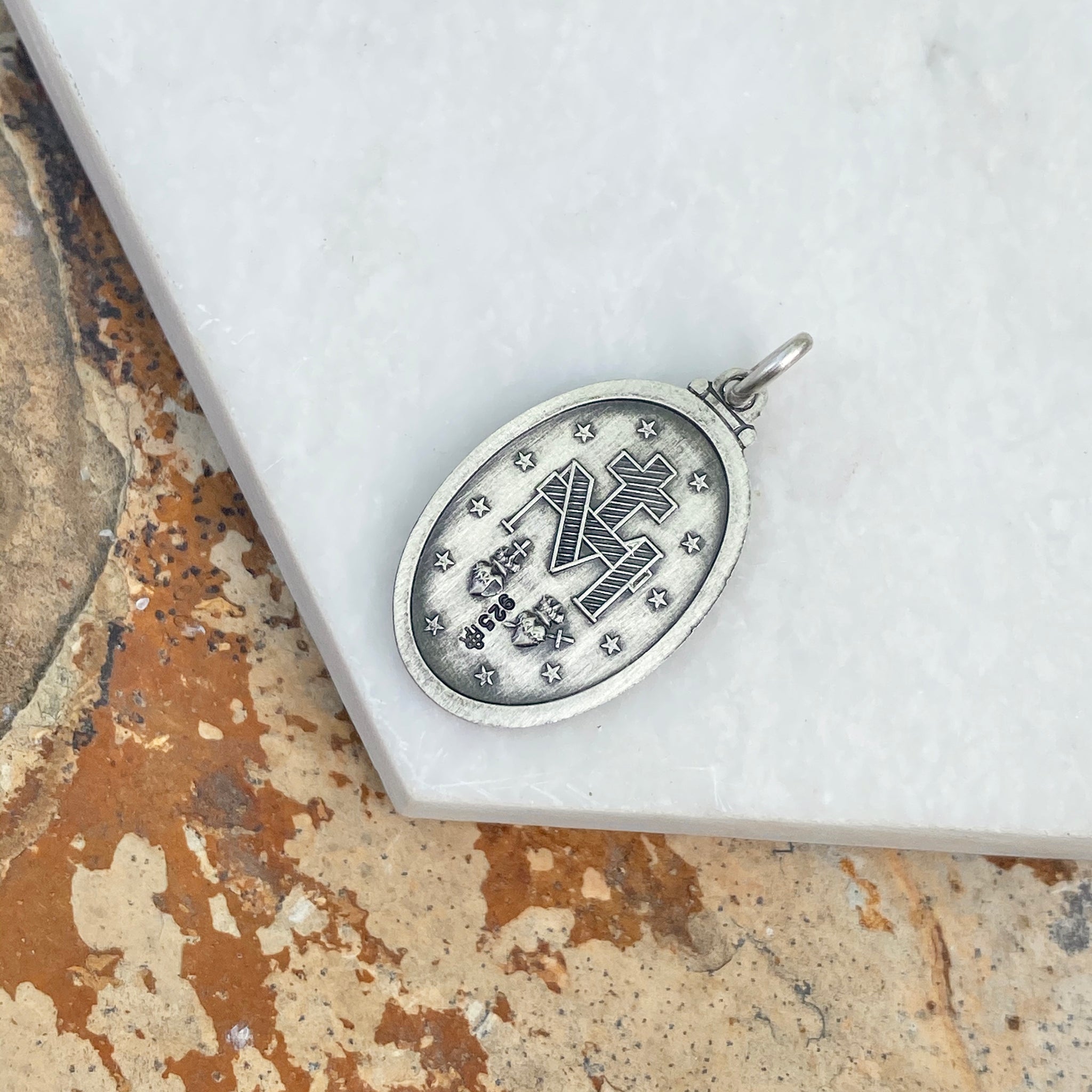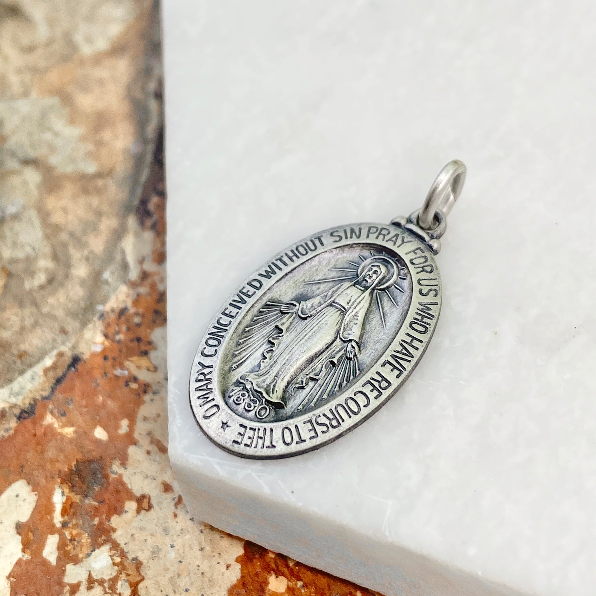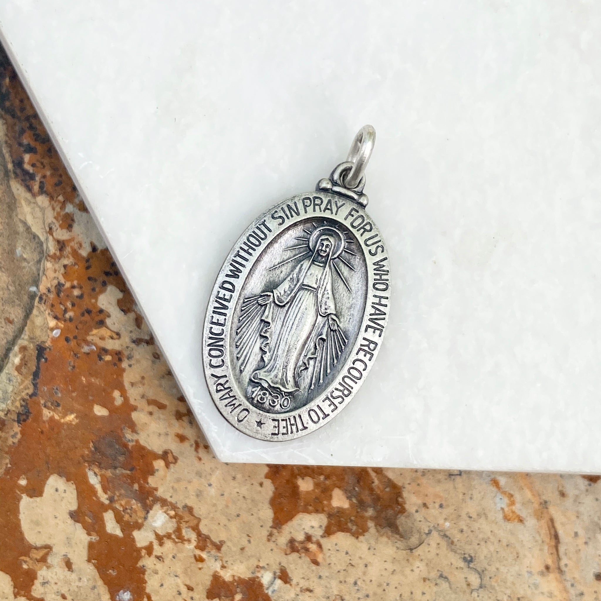 Sterling Silver Antiqued Miraculous Medal Oval Pendant 28mm