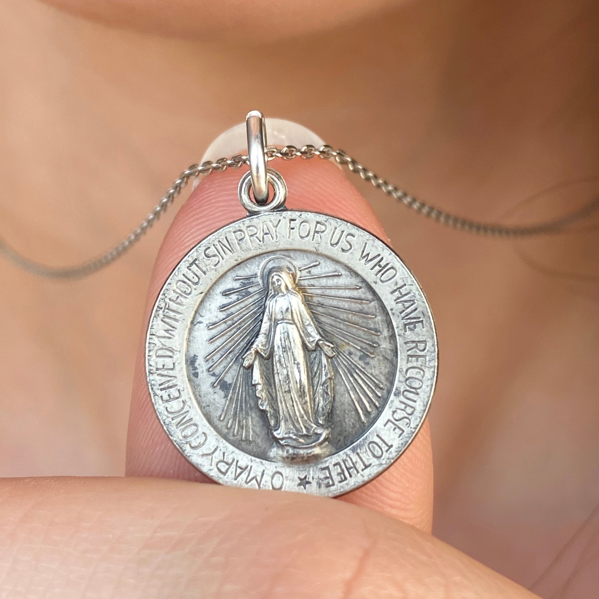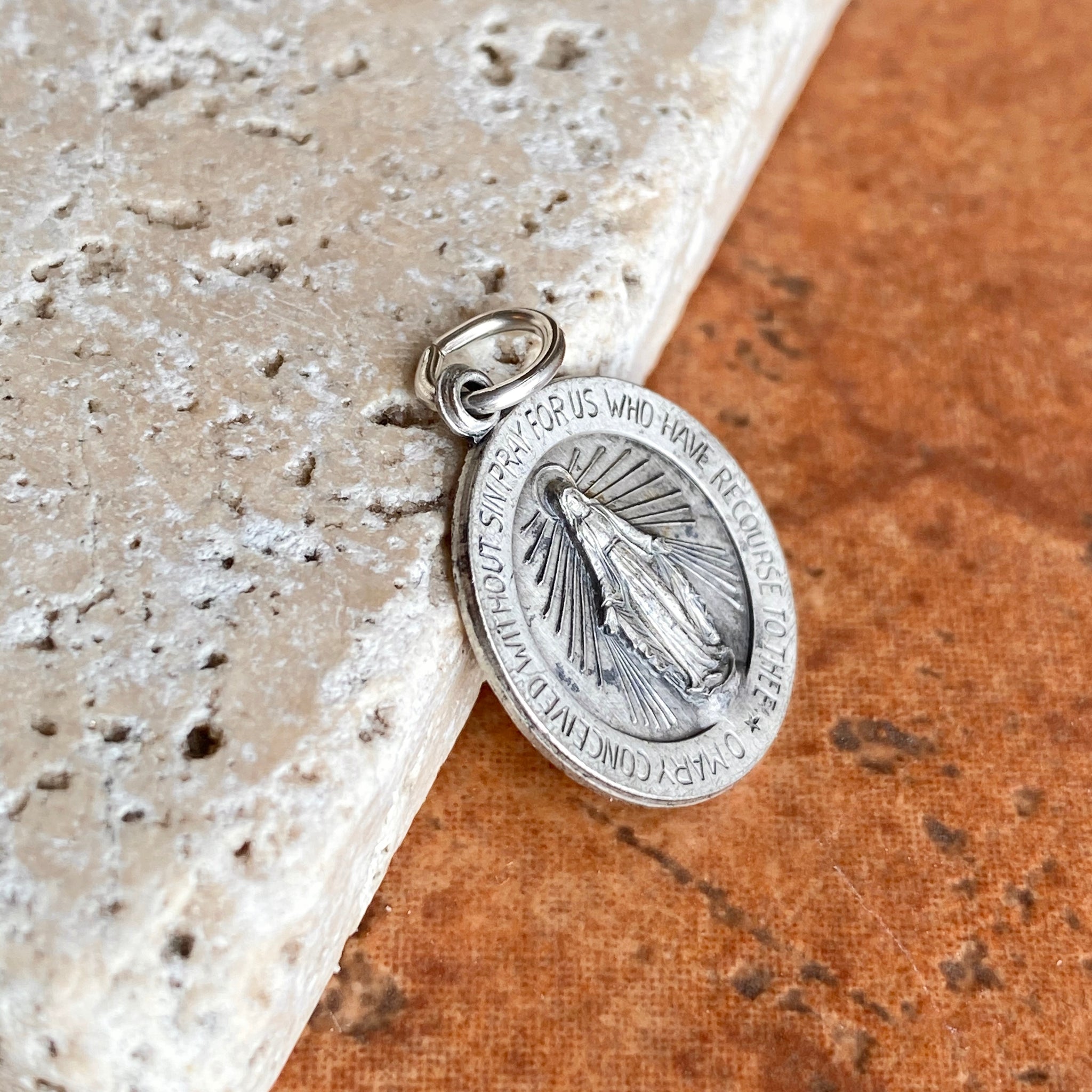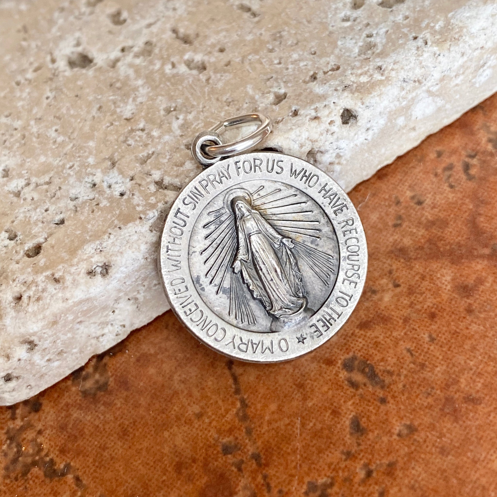 Antiqued-finish/oxidized Miraculous Mary Medal round pendant. Reversible pendant with Miraculous Medal stamping on the backside. Simply pair it with one of our sterling silver chain necklaces.
