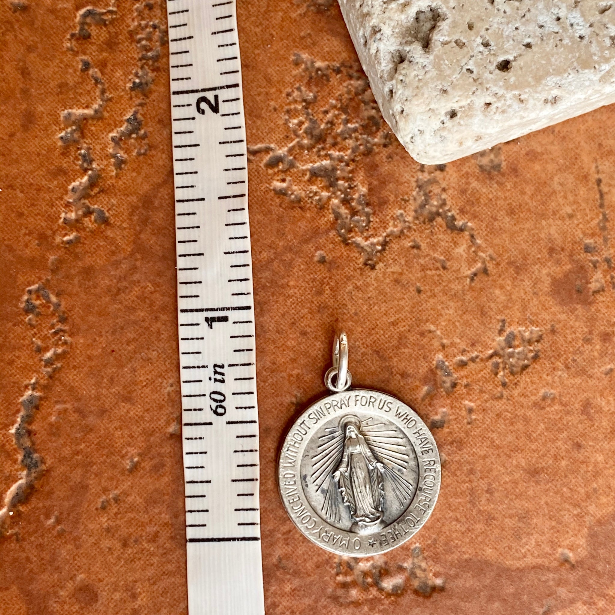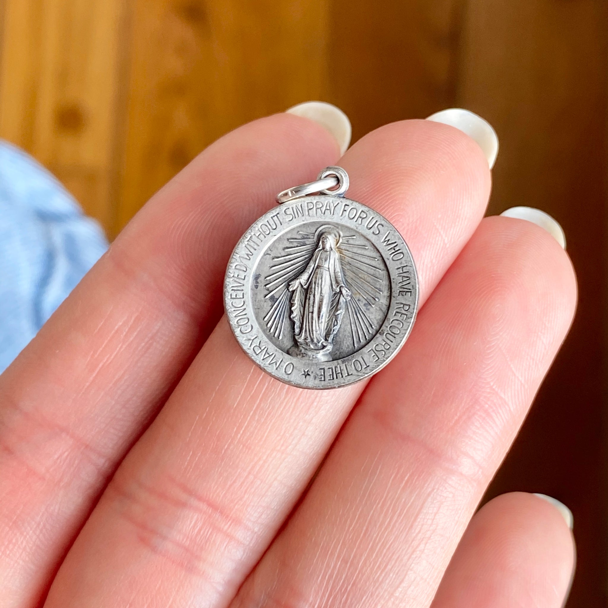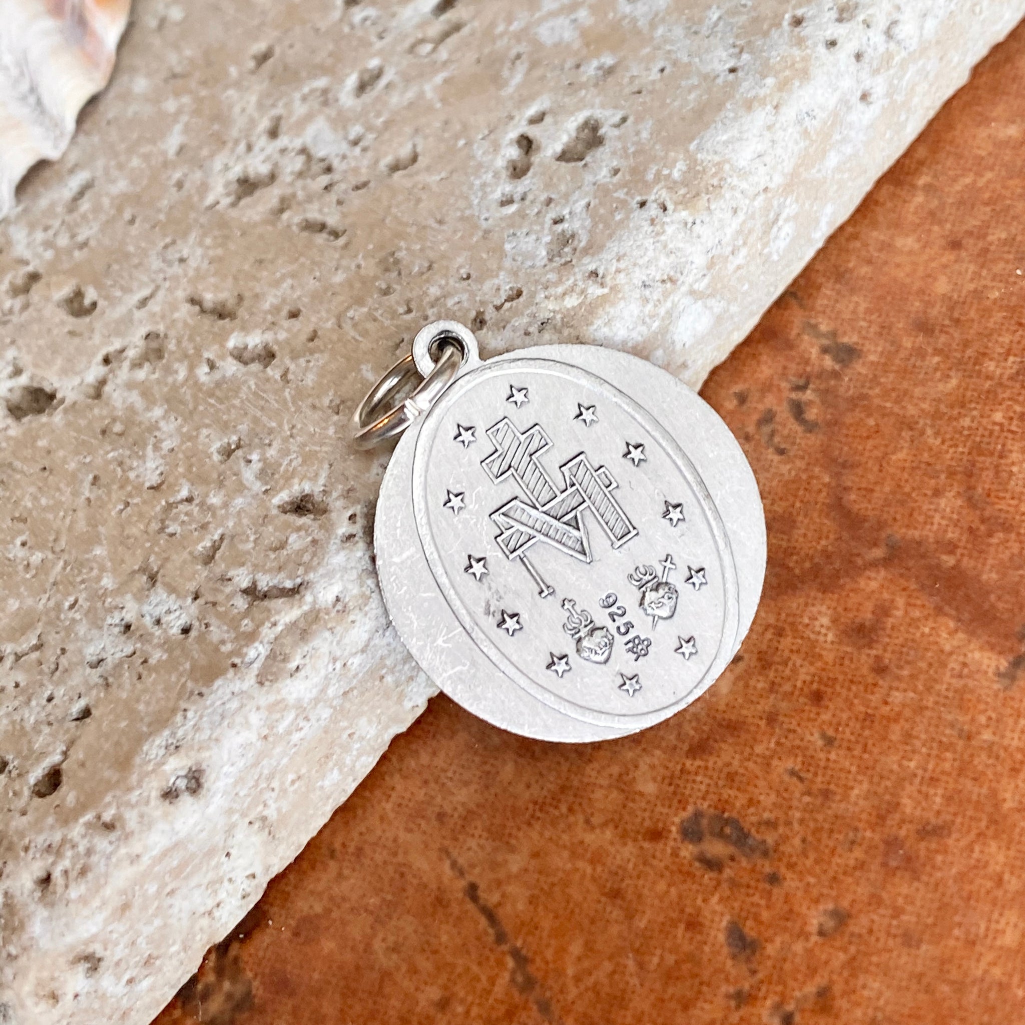 Antiqued-finish/oxidized Miraculous Mary Medal round pendant. Reversible pendant with Miraculous Medal stamping on the backside. Simply pair it with one of our sterling silver chain necklaces.