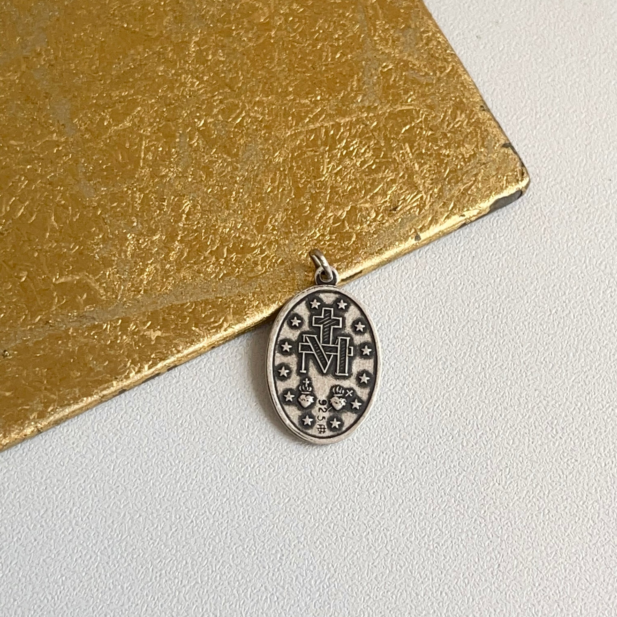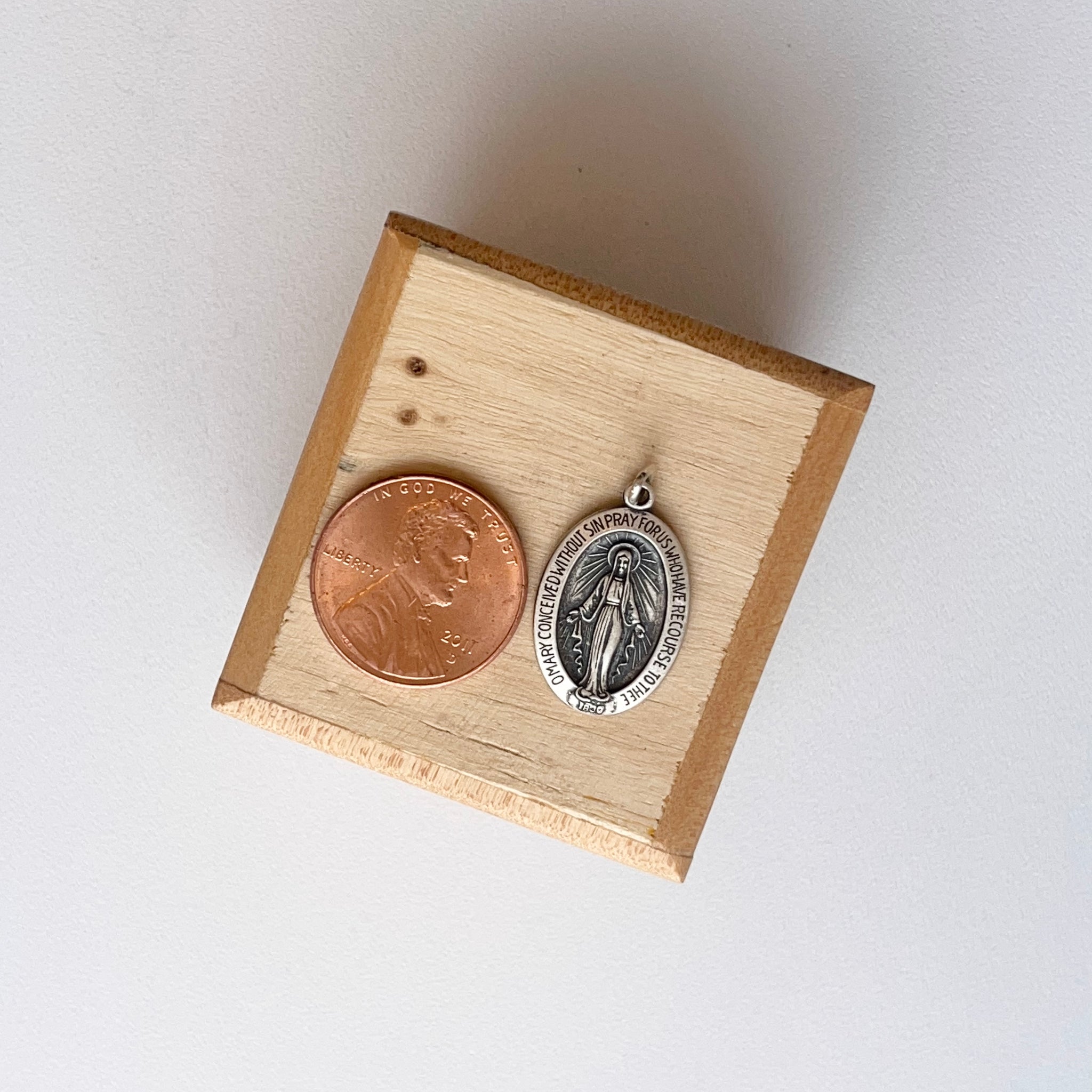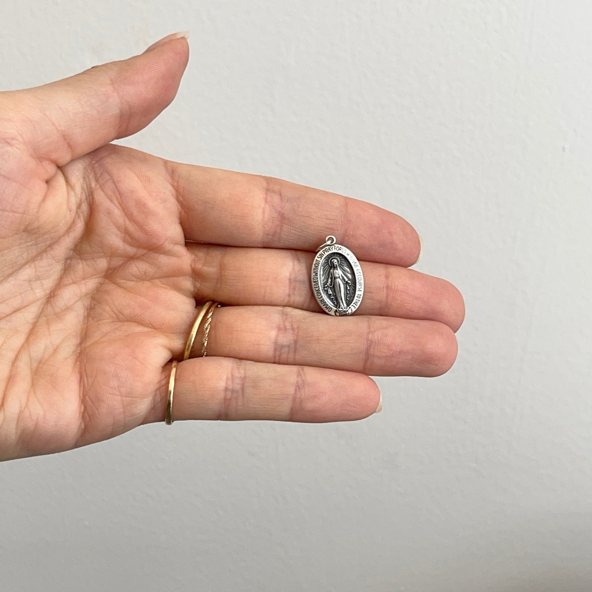 Antiqued-finish/oxidized Miraculous Mary medal oval pendant. Reversible pendant with Miraculous Medal stamping on the backside. Simply pair it with one of our sterling silver chain necklaces!