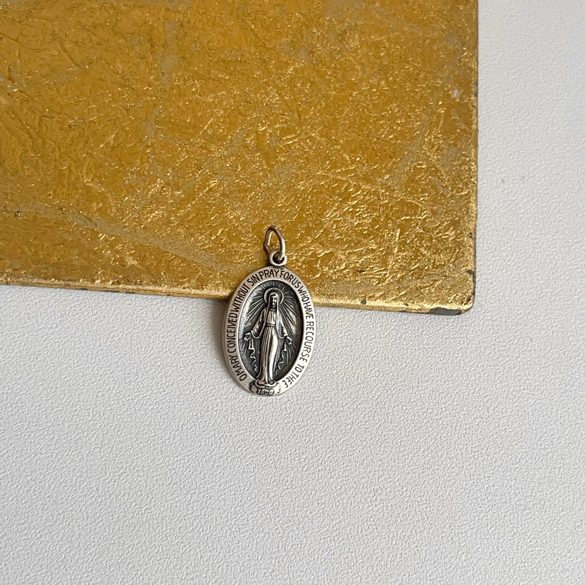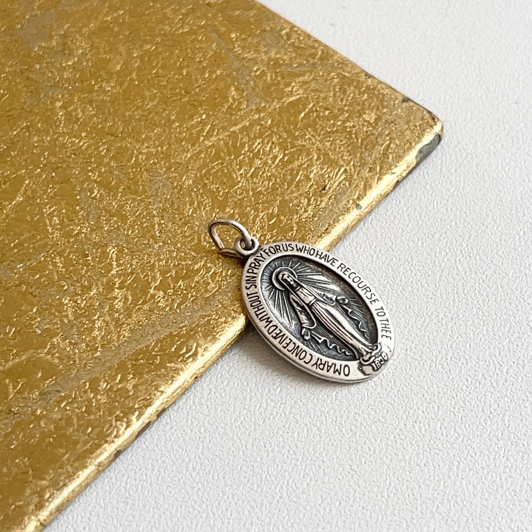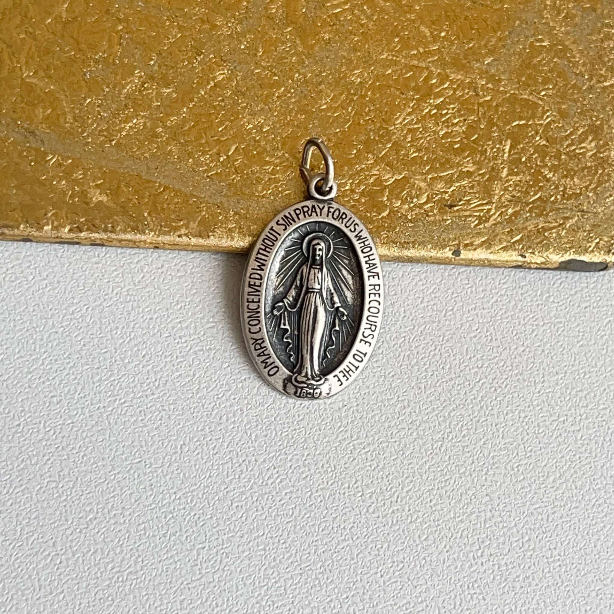 Antiqued-finish/oxidized Miraculous Mary medal oval pendant. Reversible pendant with Miraculous Medal stamping on the backside. Simply pair it with one of our sterling silver chain necklaces!