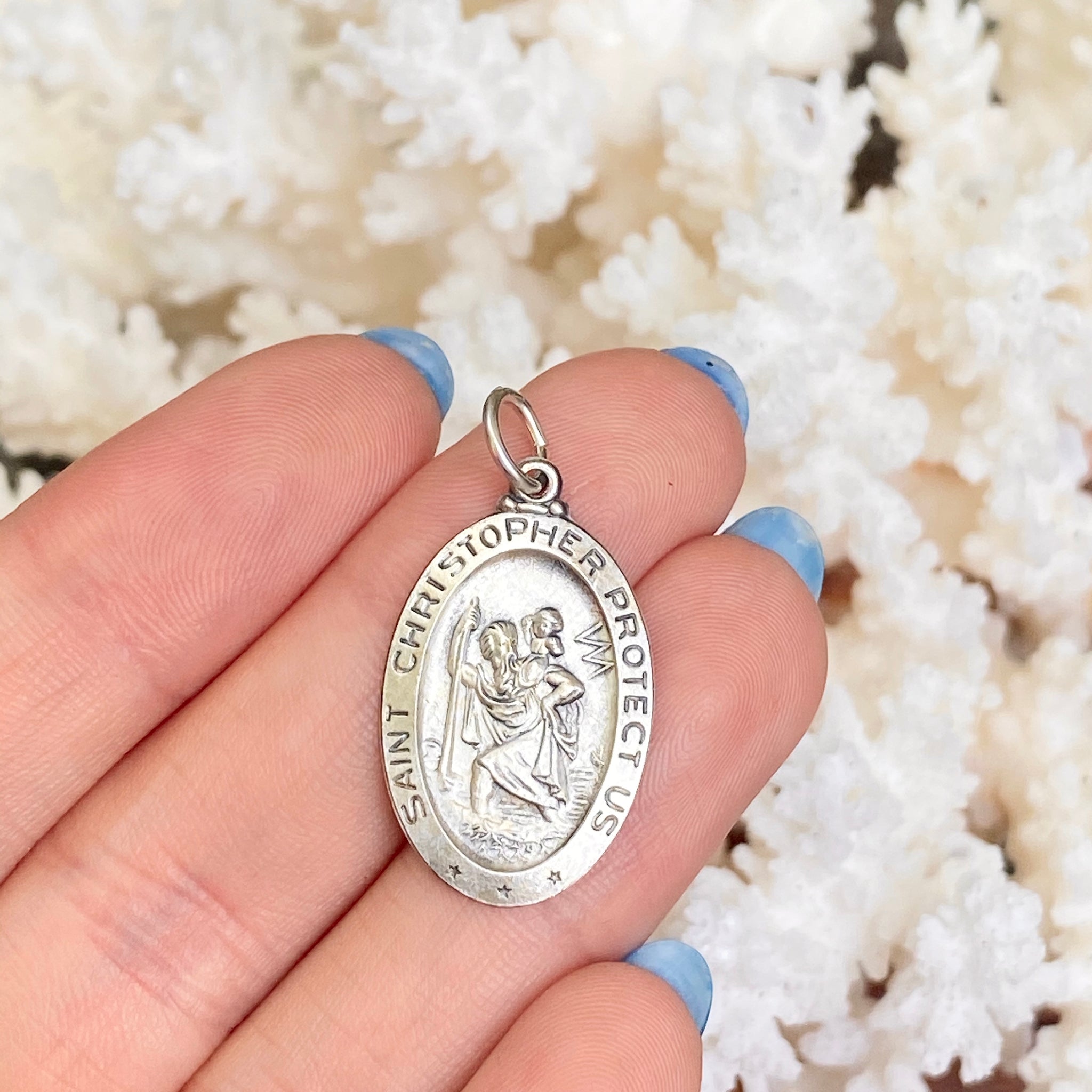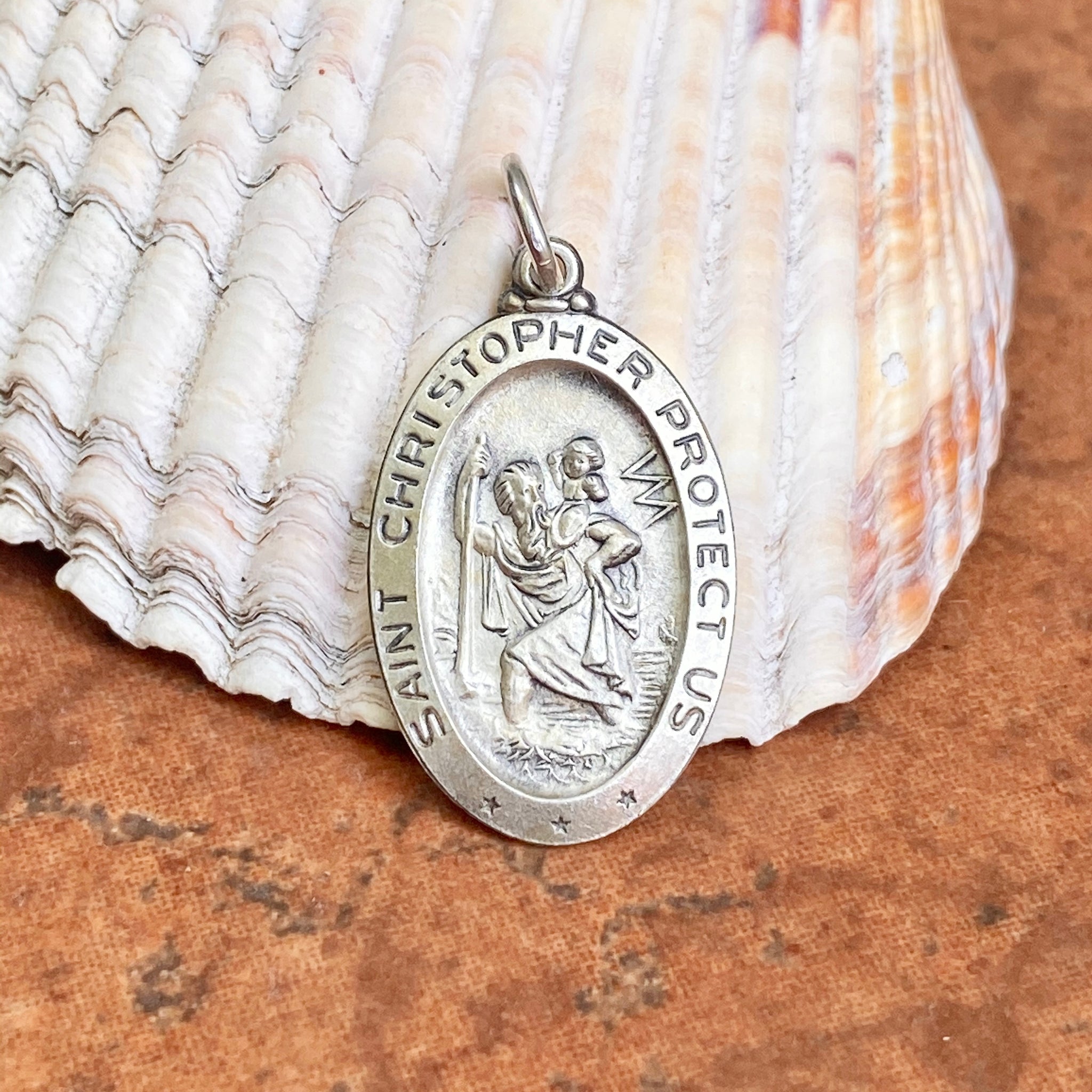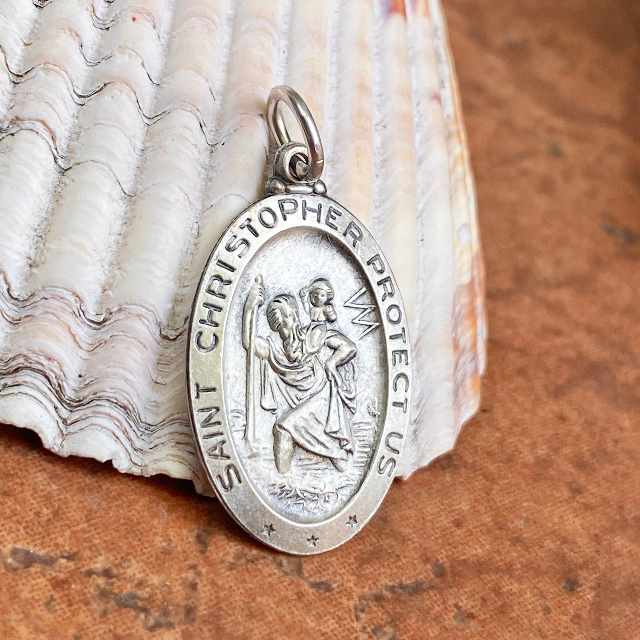 Sterling silver antiqued-finish, oval religious medal of St.Christopher. St. Christopher– The saint of protection is best known as the patron saint of travelers. Slide this pendant onto a silver chain necklace or cord necklace.