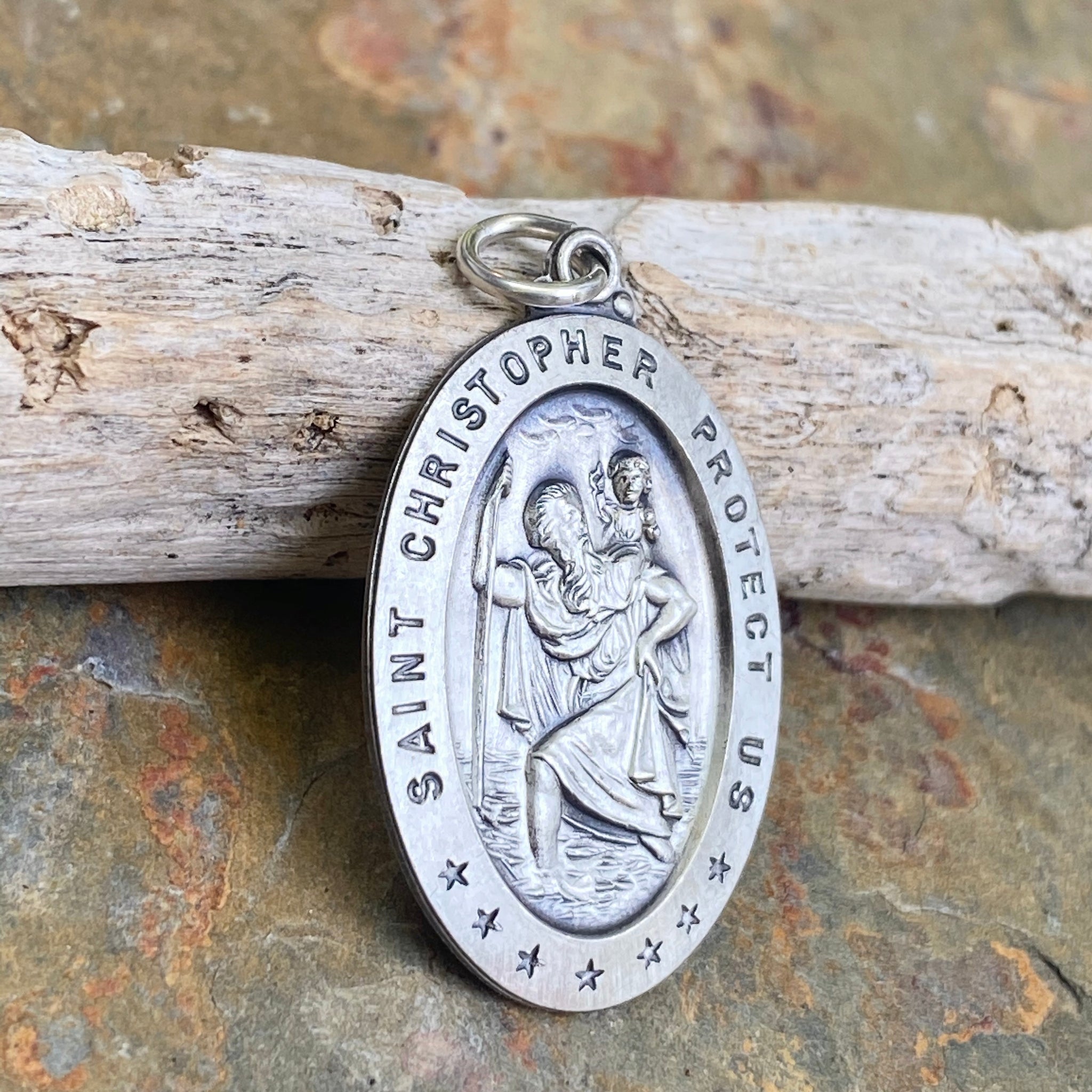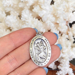 Sterling silver antiqued-finish, oval religious medal of St.Christopher. St. Christopher– The saint of protection is best known as the patron saint of travelers. Slide this pendant onto a silver chain necklace or cord necklace.