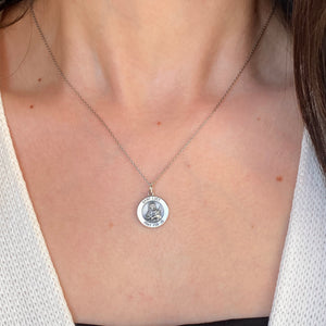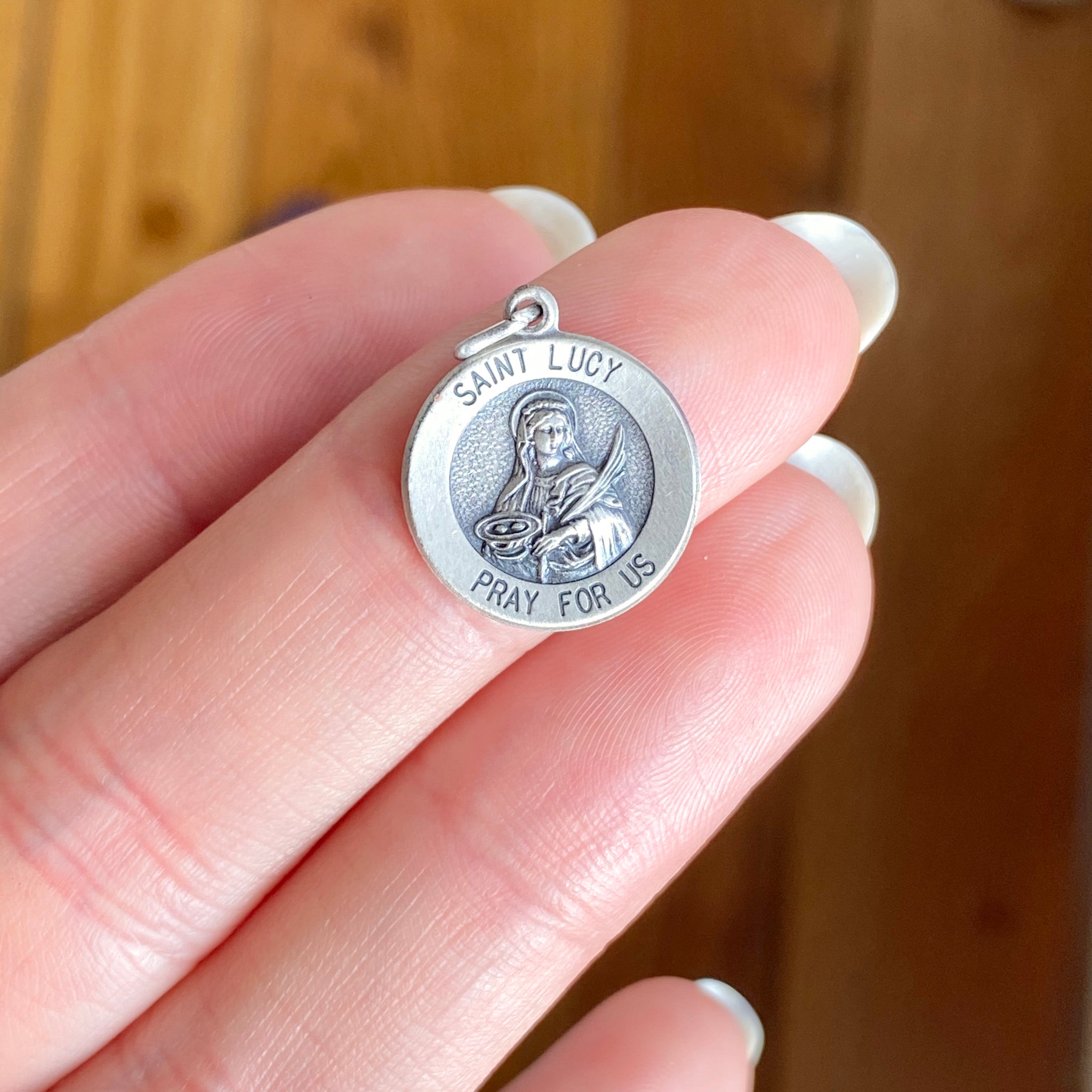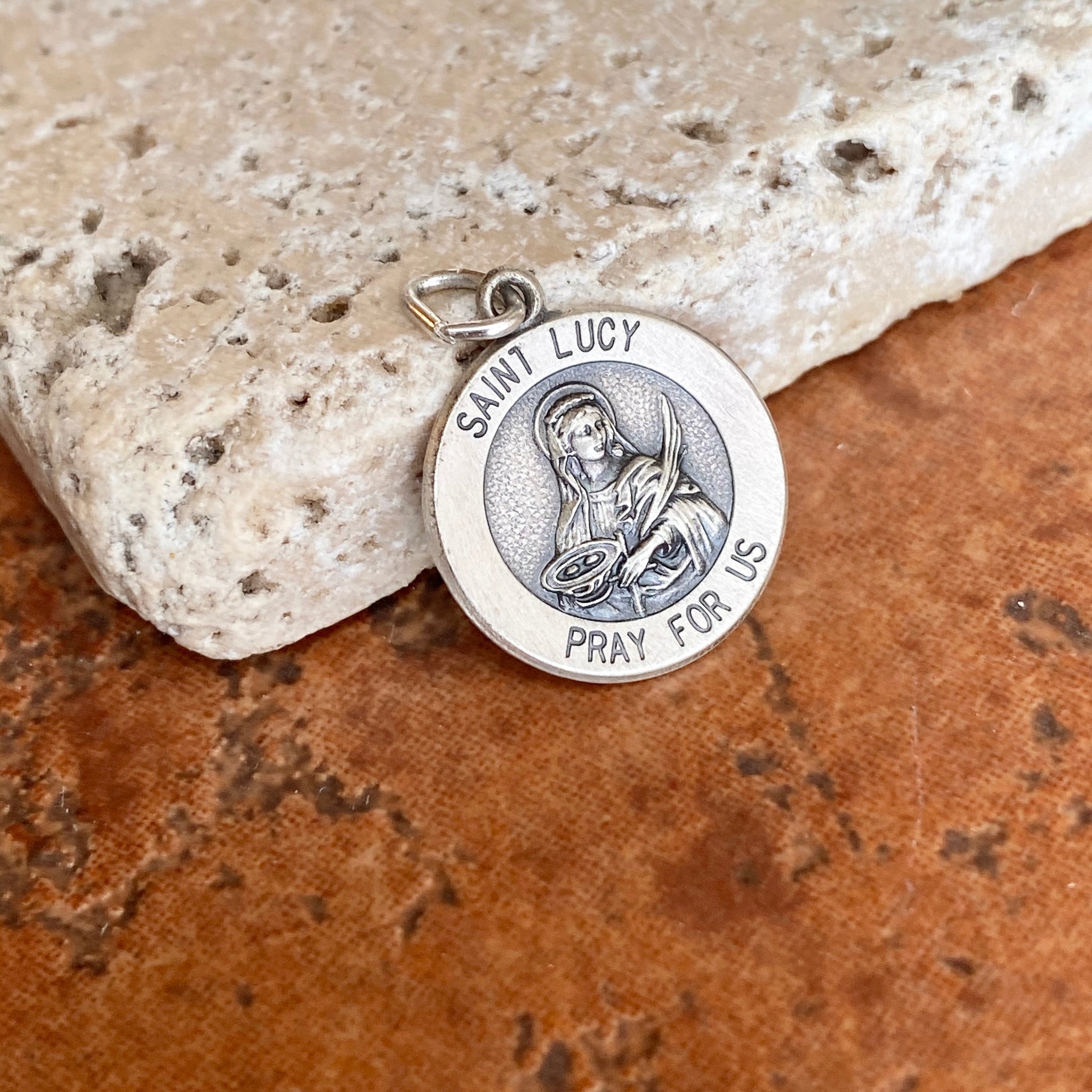Antiqued-finish sterling silver St. Lucy patron saint of blind round medal pendant charm. St. Lucy, whose name means 'light', is the patron saint of the blind. Also available in larger size.