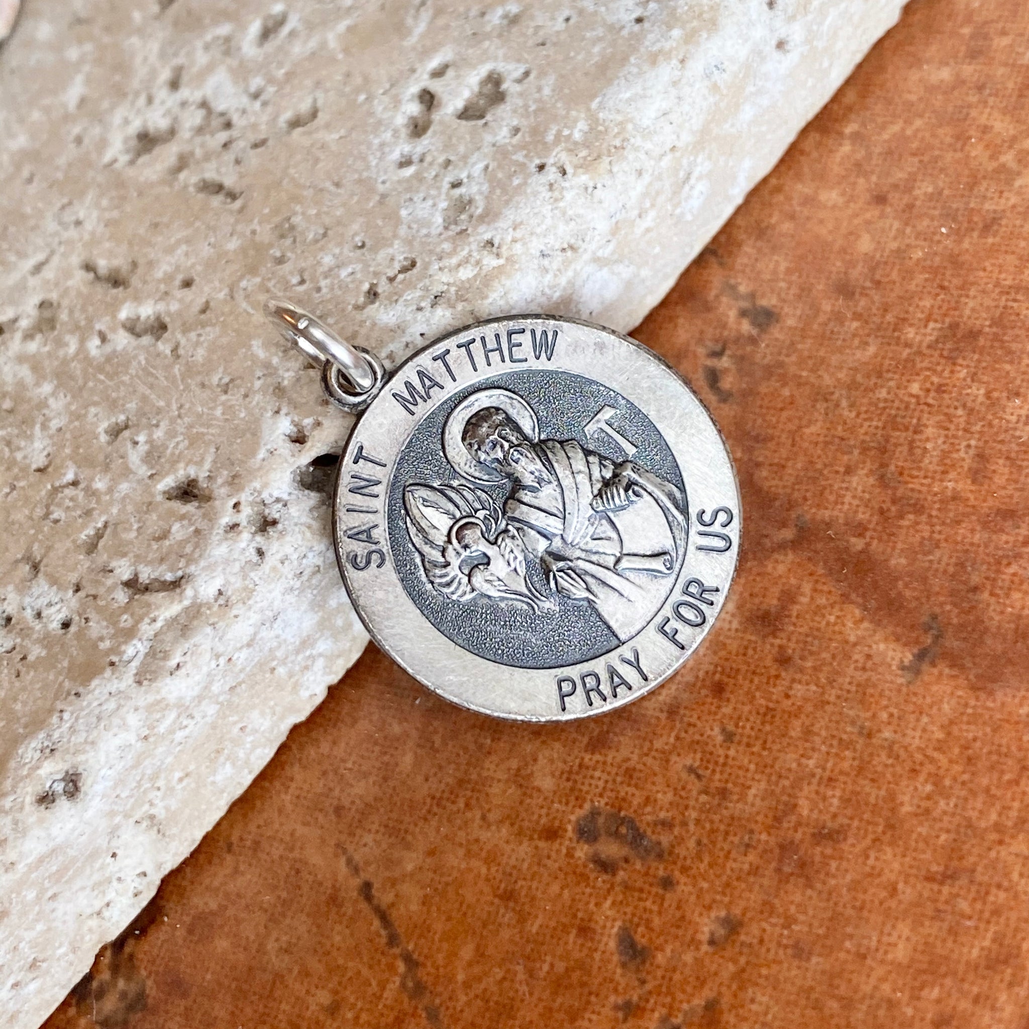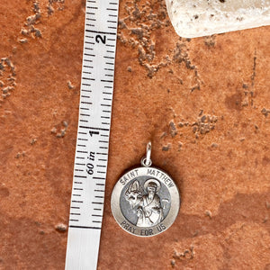 Sterling Silver Antiqued Saint Matthew Round Medal Pendant 20mm