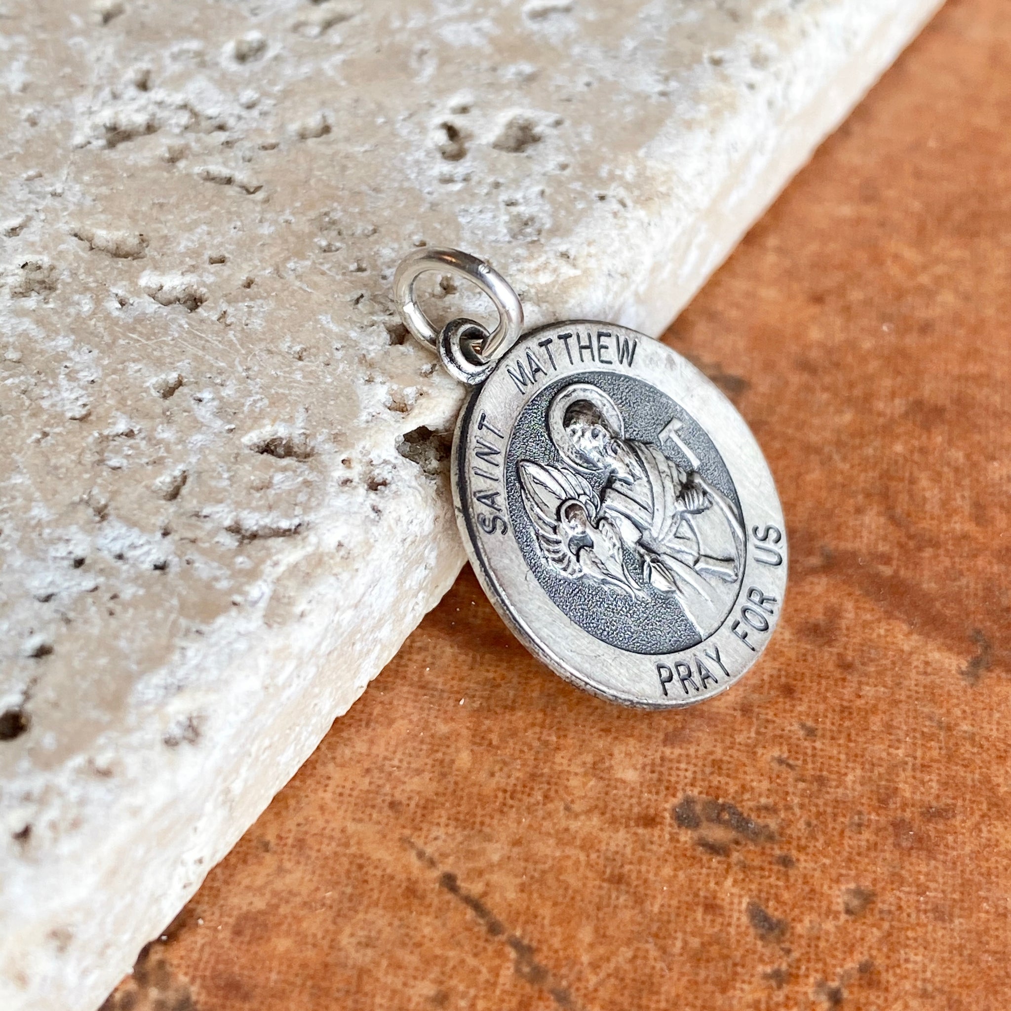 Sterling silver antiqued St. Matthew "Pray for Us" round medallion pendant. St. Matthew is the patron saint of accountants + bankers! This pendant makes a great gift during tax season! Wear this medal on a silver chain necklace or cord necklace.