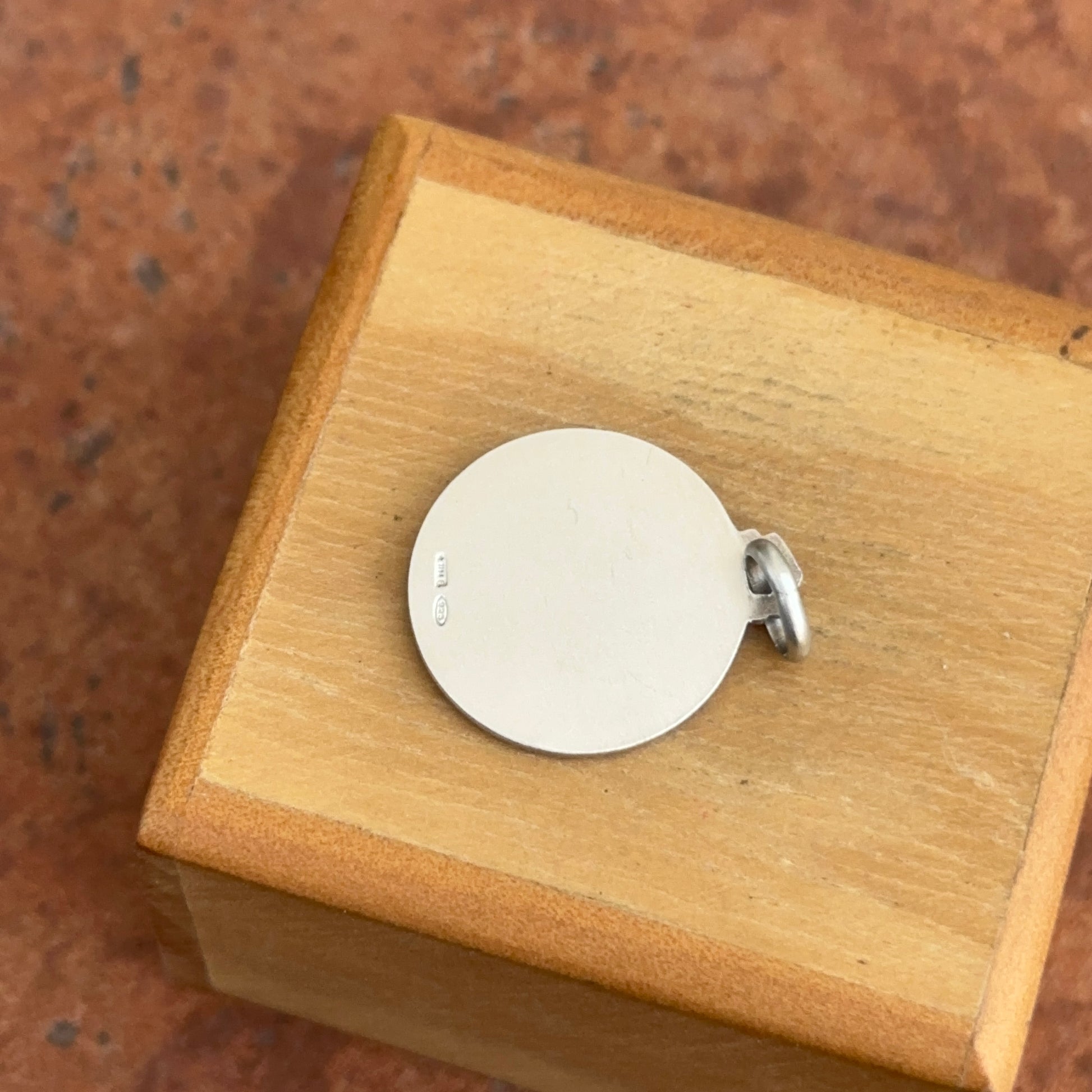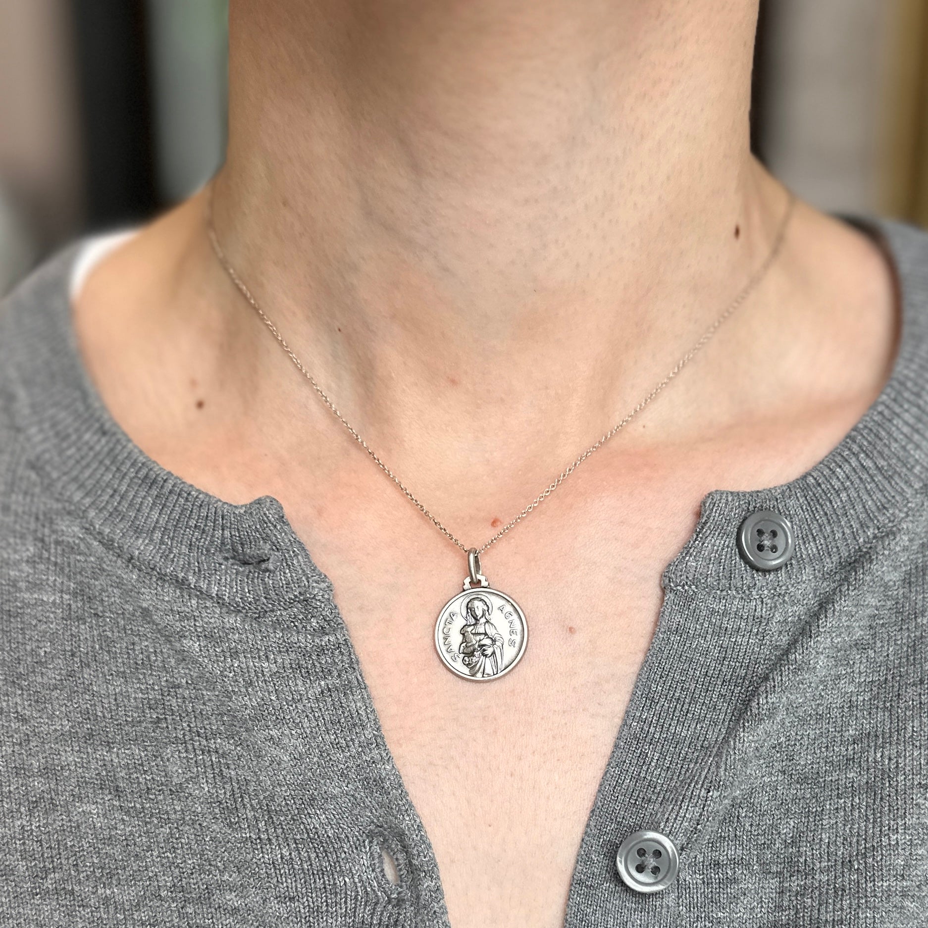 Sterling silver antiqued finish, St. Agnes of Rome round medal pendant in a matte-finish. Saint Anges is the patron saint of young girls, chastity, rape survivors, and the Children of Mary.