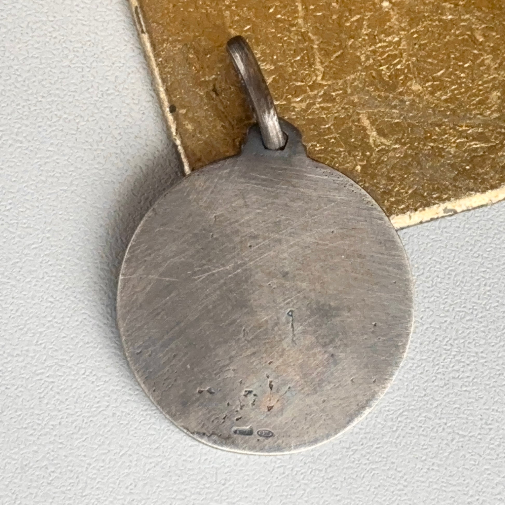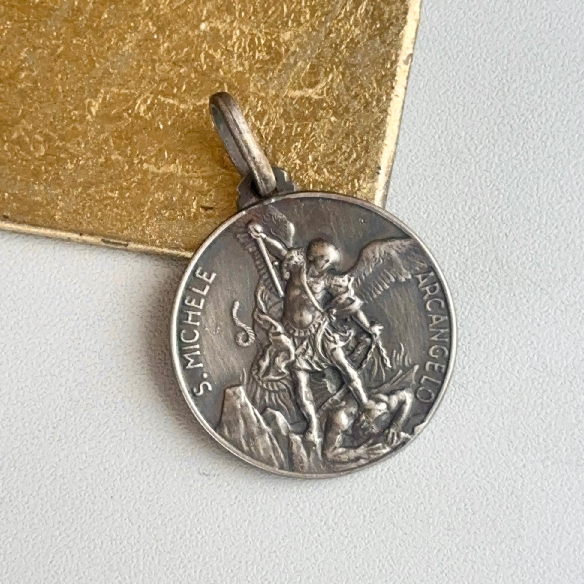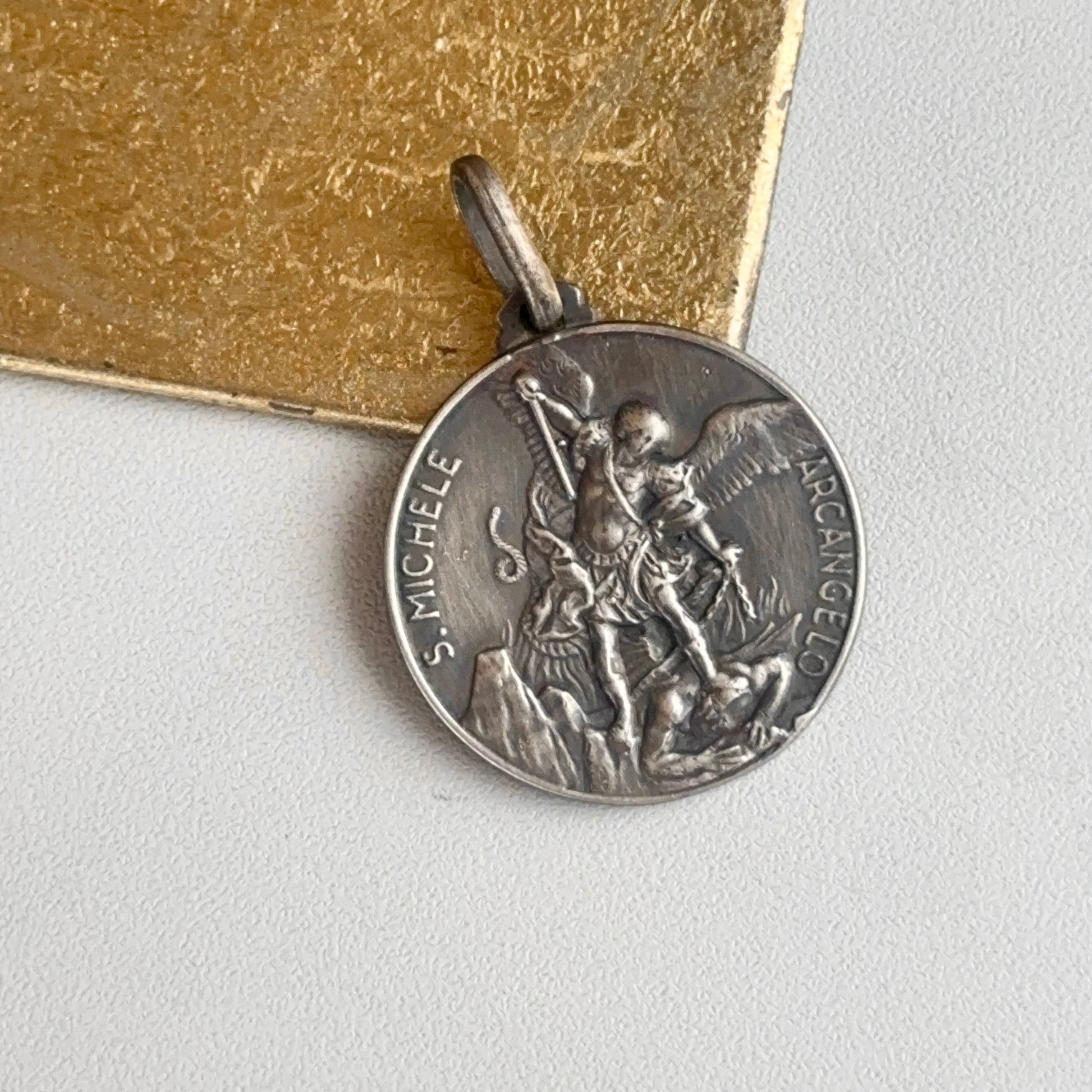 Sterling silver Saint Michael patron saint of military and police, round pendant with an antiqued finish.