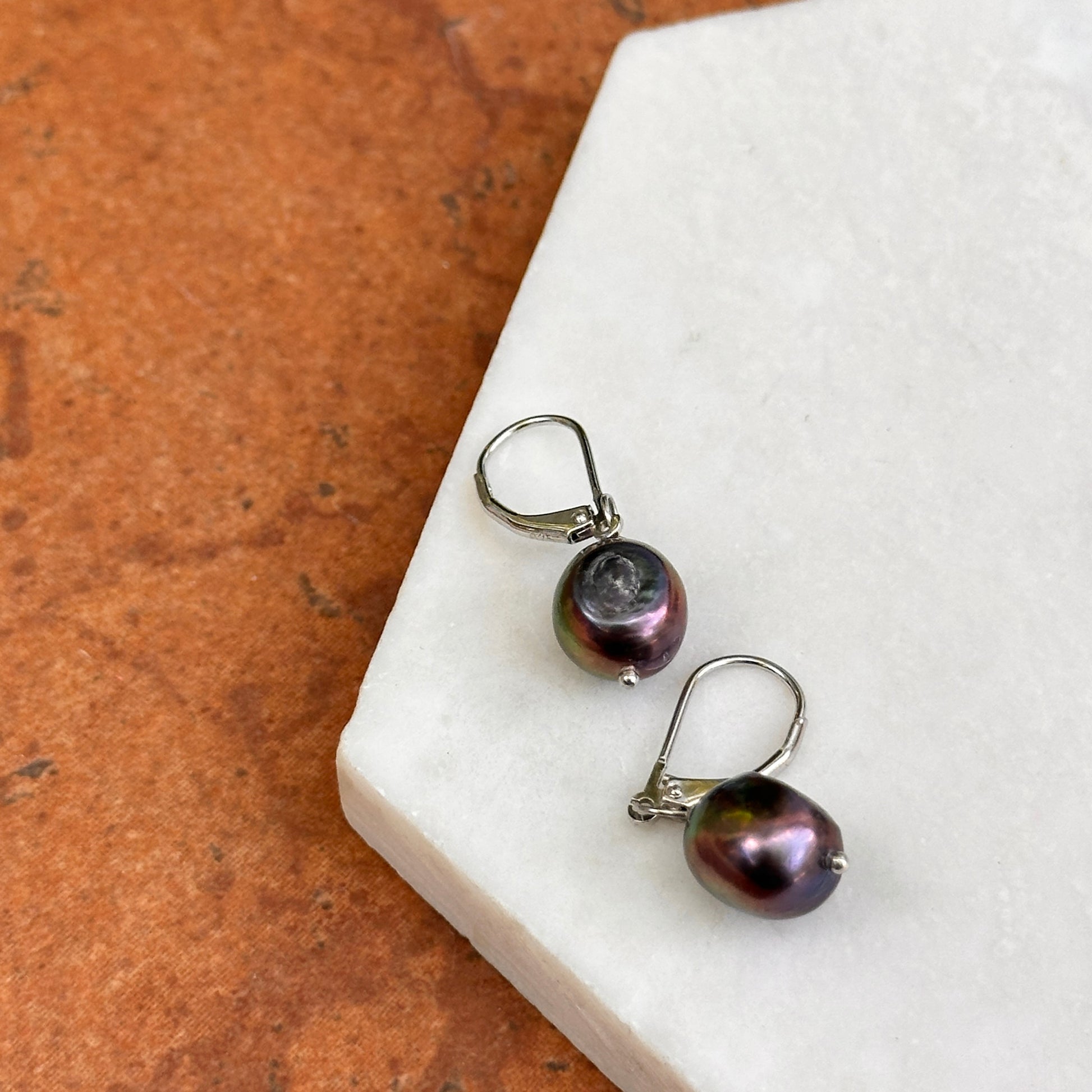 Sterling Silver Near Round Black Pearl Lever Back Drop Dangle Earrings