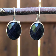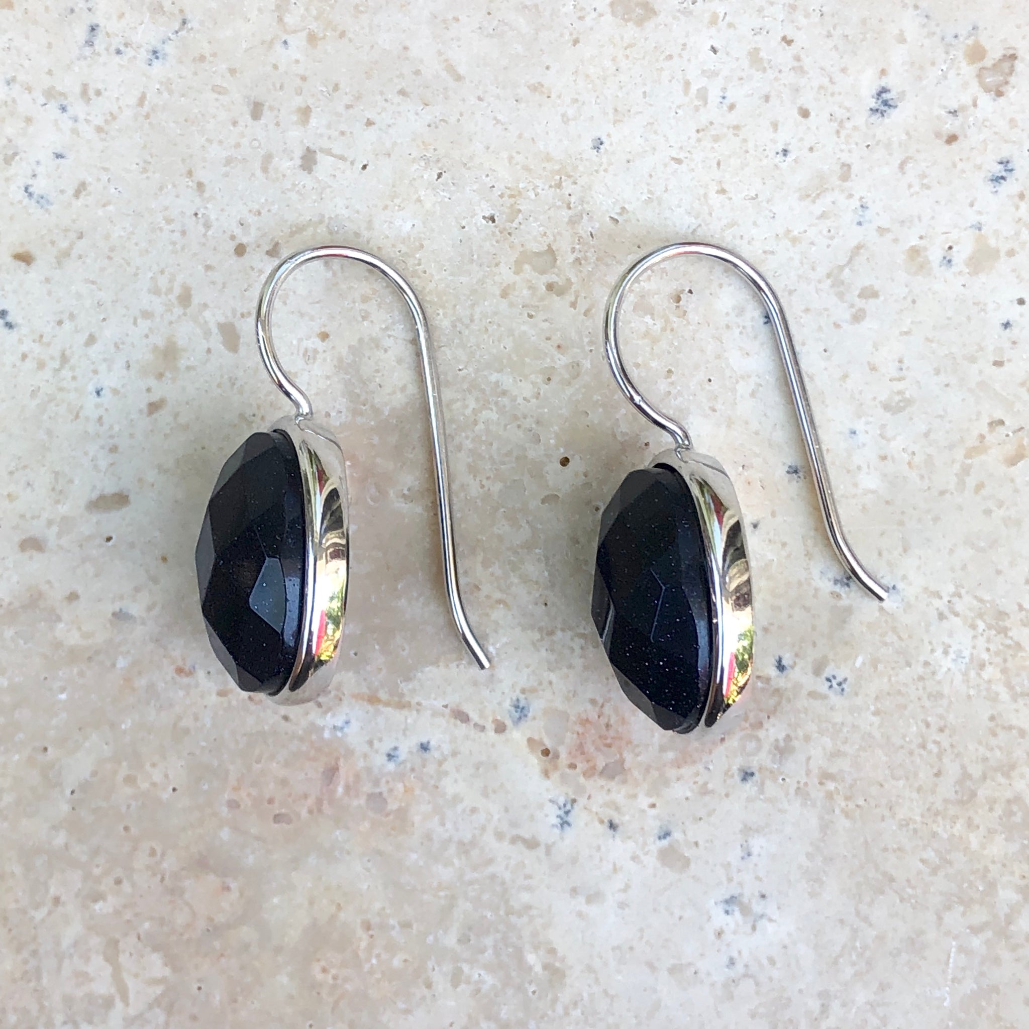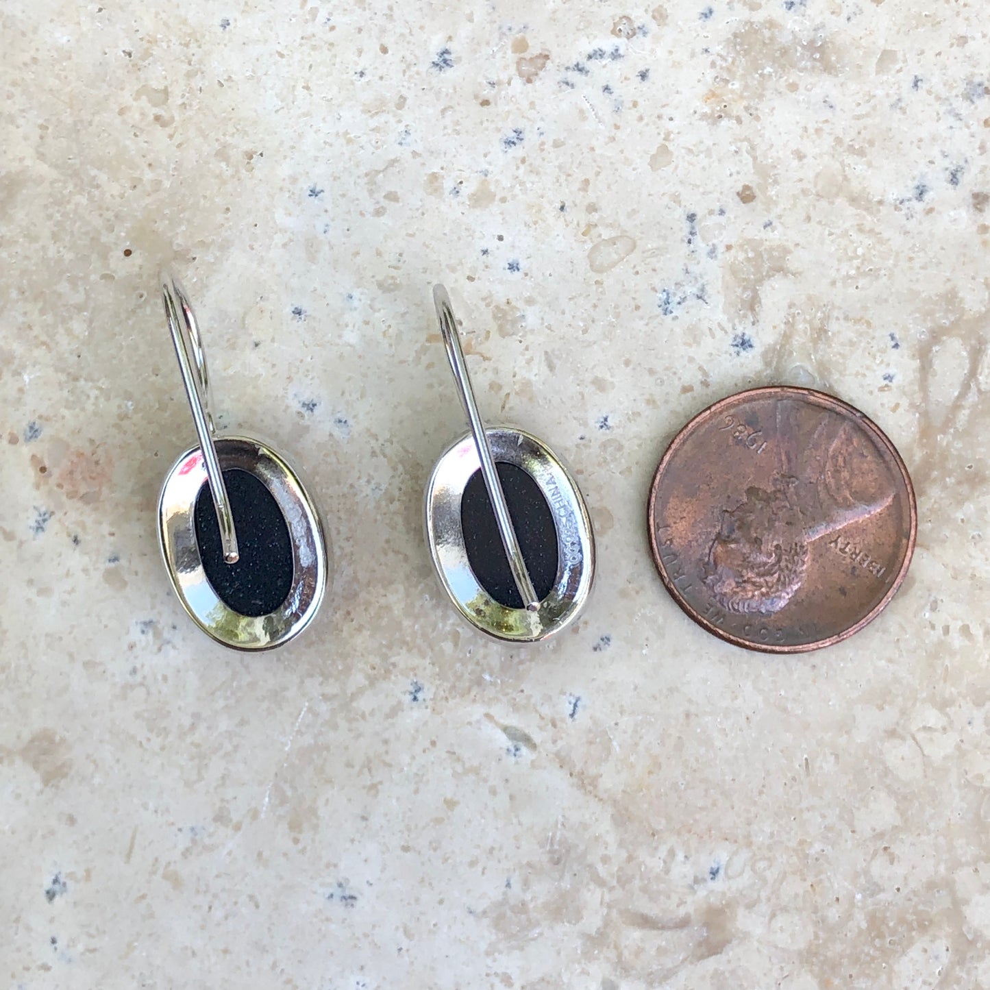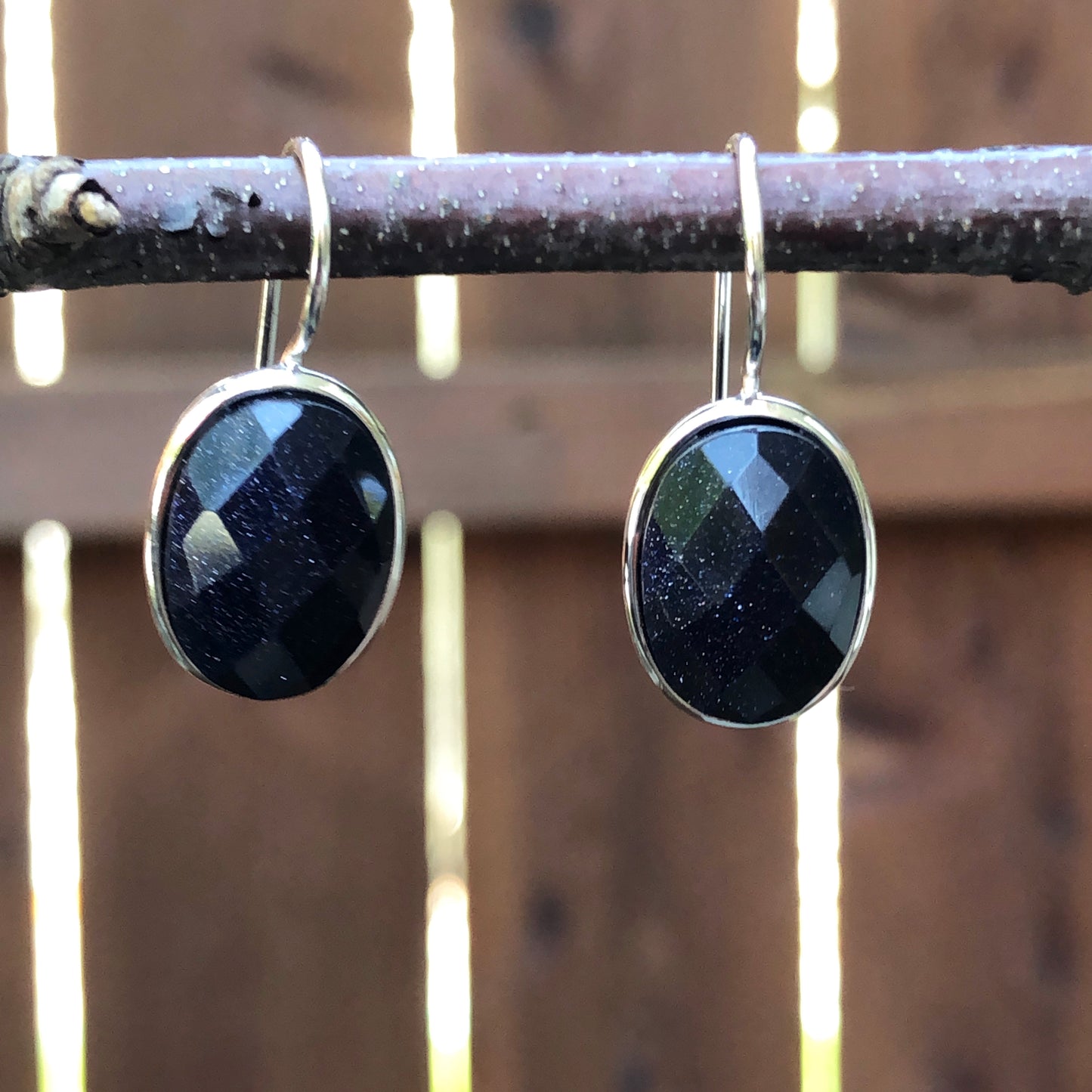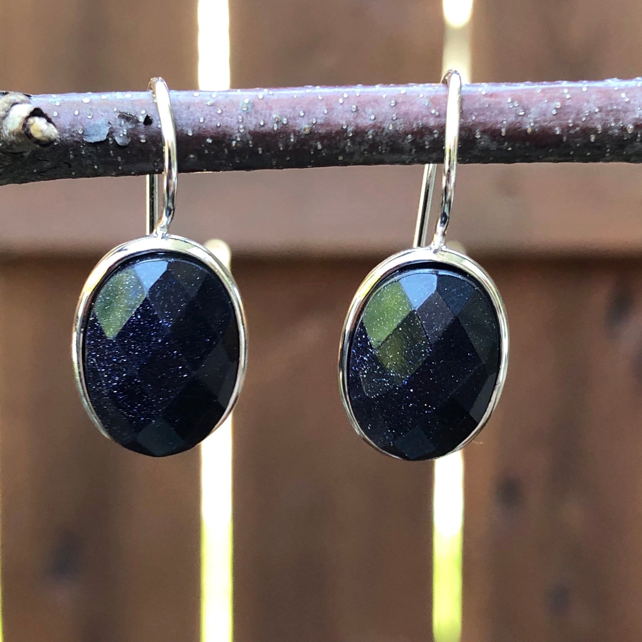Sterling silver french wire blue sand stone earrings with reflects of gold. Pretty, dangle earrings that when catch light show cool blue color with gold reflects.