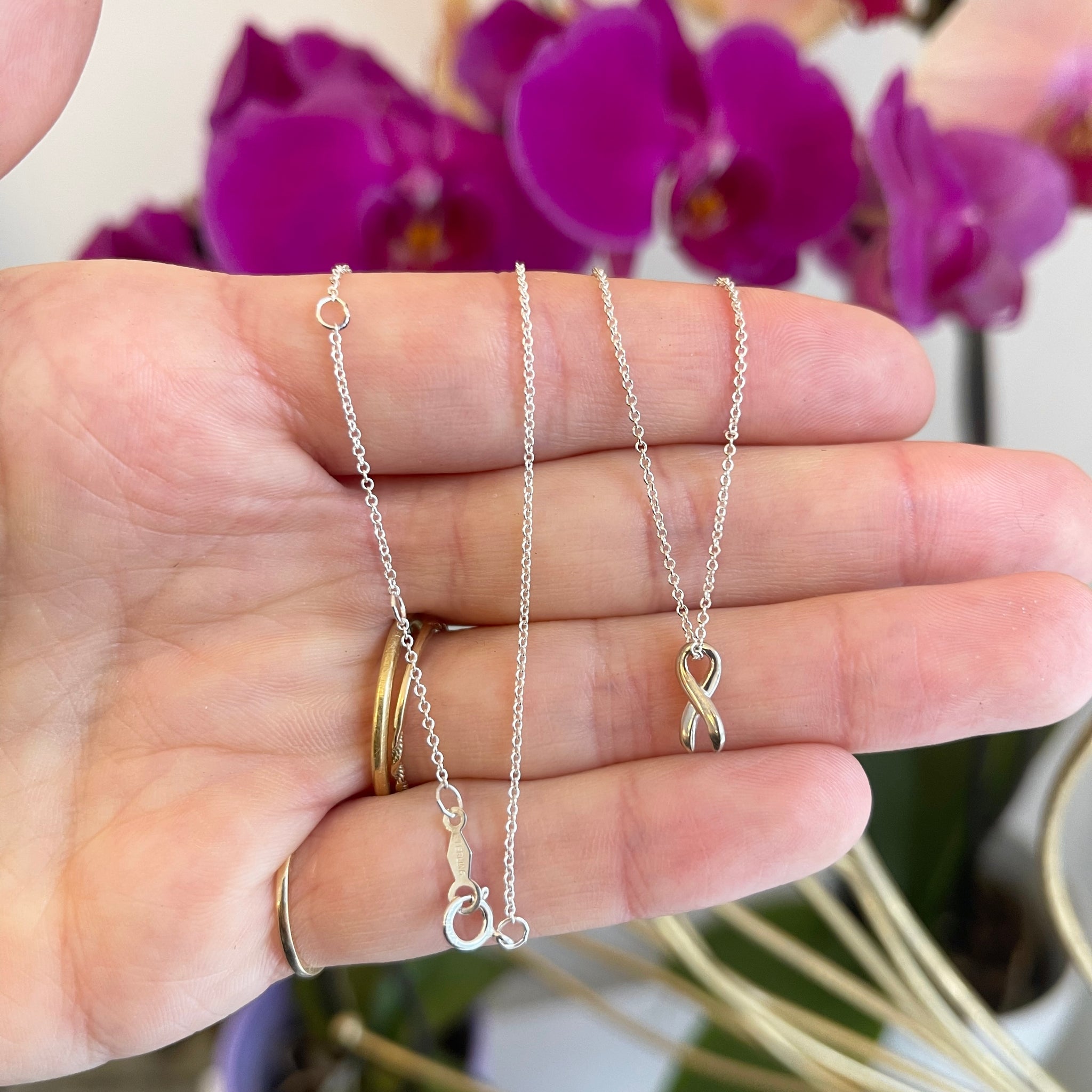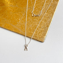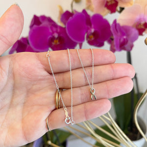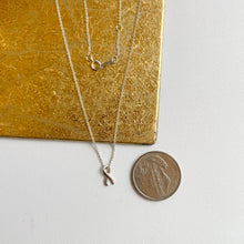 Sterling silver cancer awareness survivor ribbon pendant on a thin, sterling silver cable chain necklace. A beautiful, special piece to show your support! Also available in yellow gold, rose gold, + white gold.