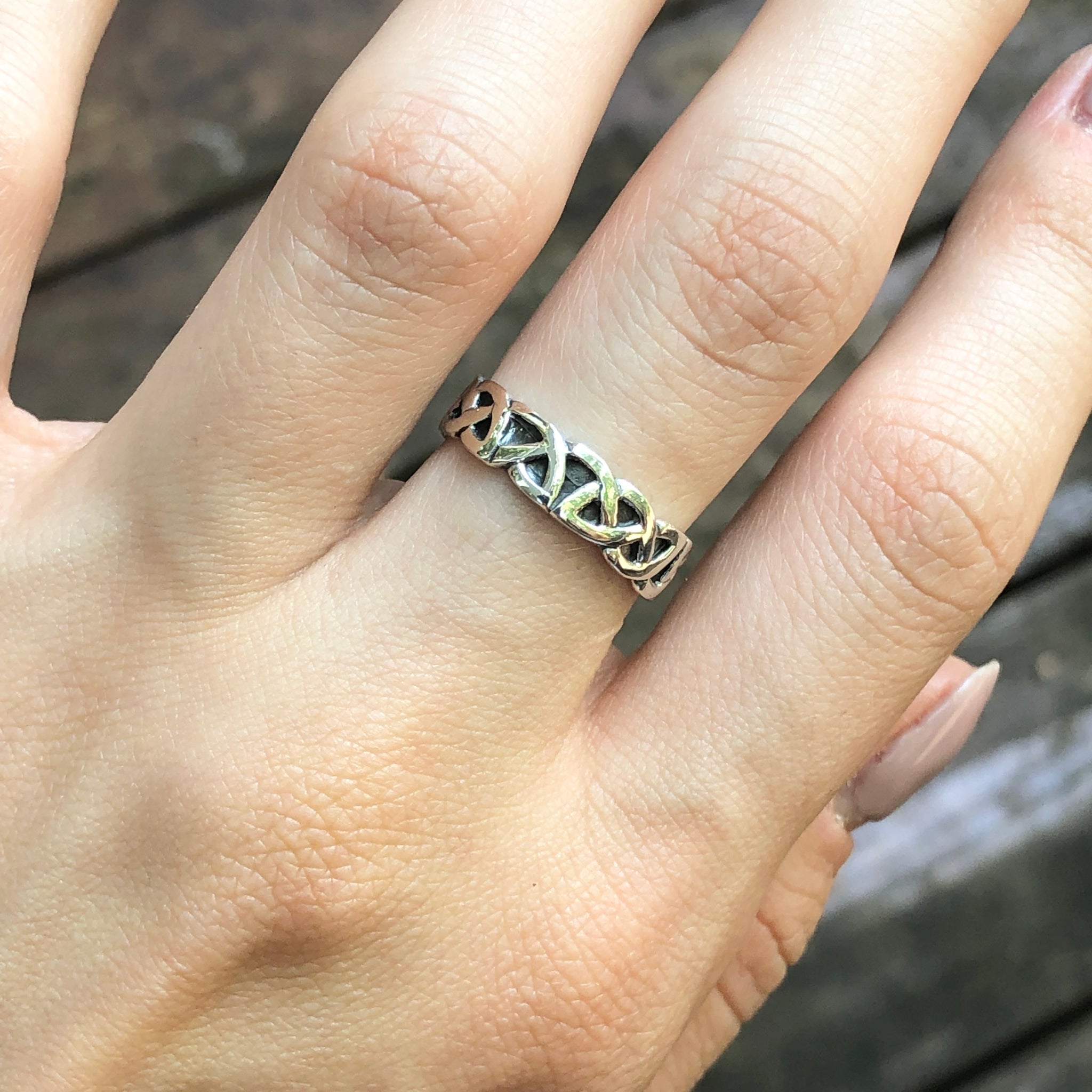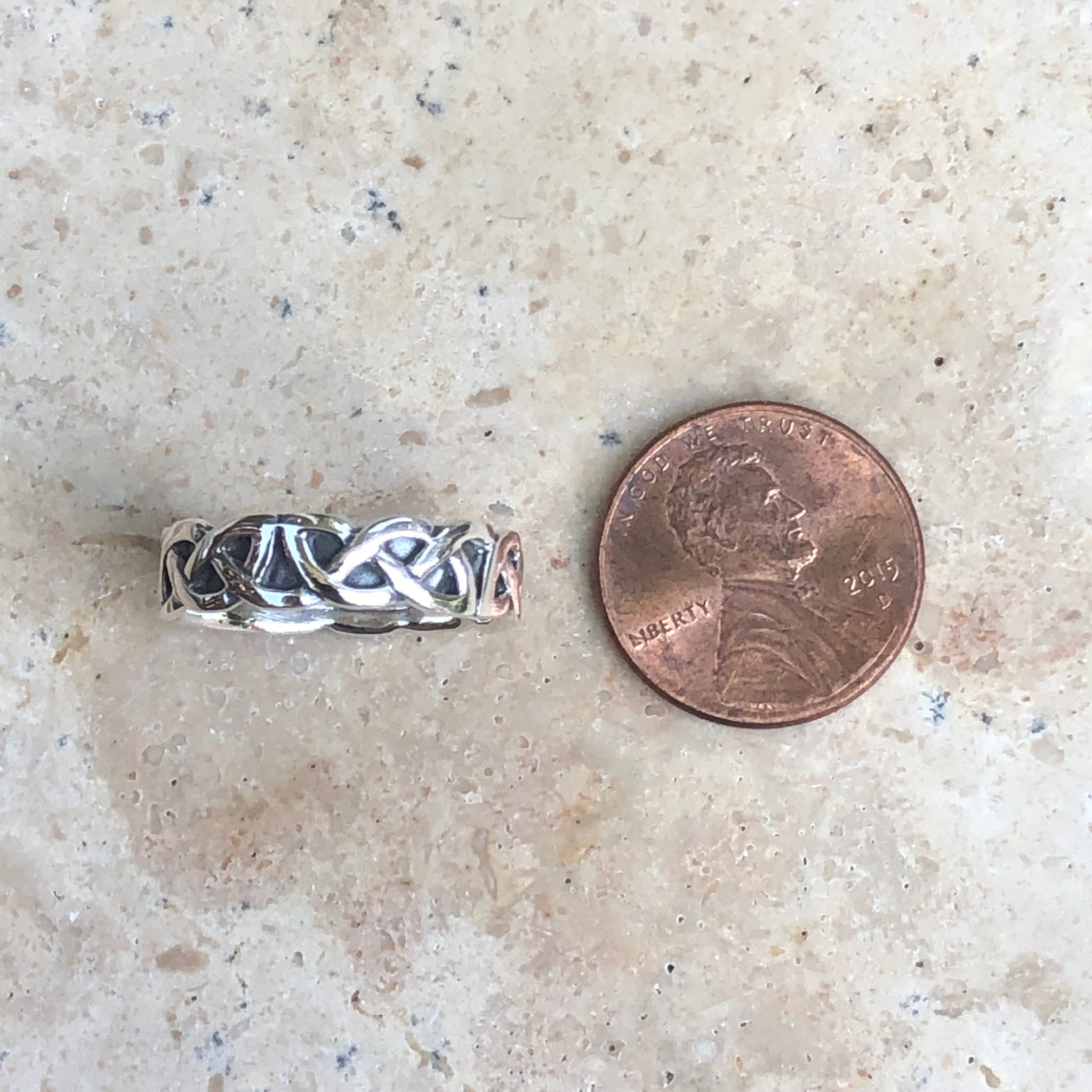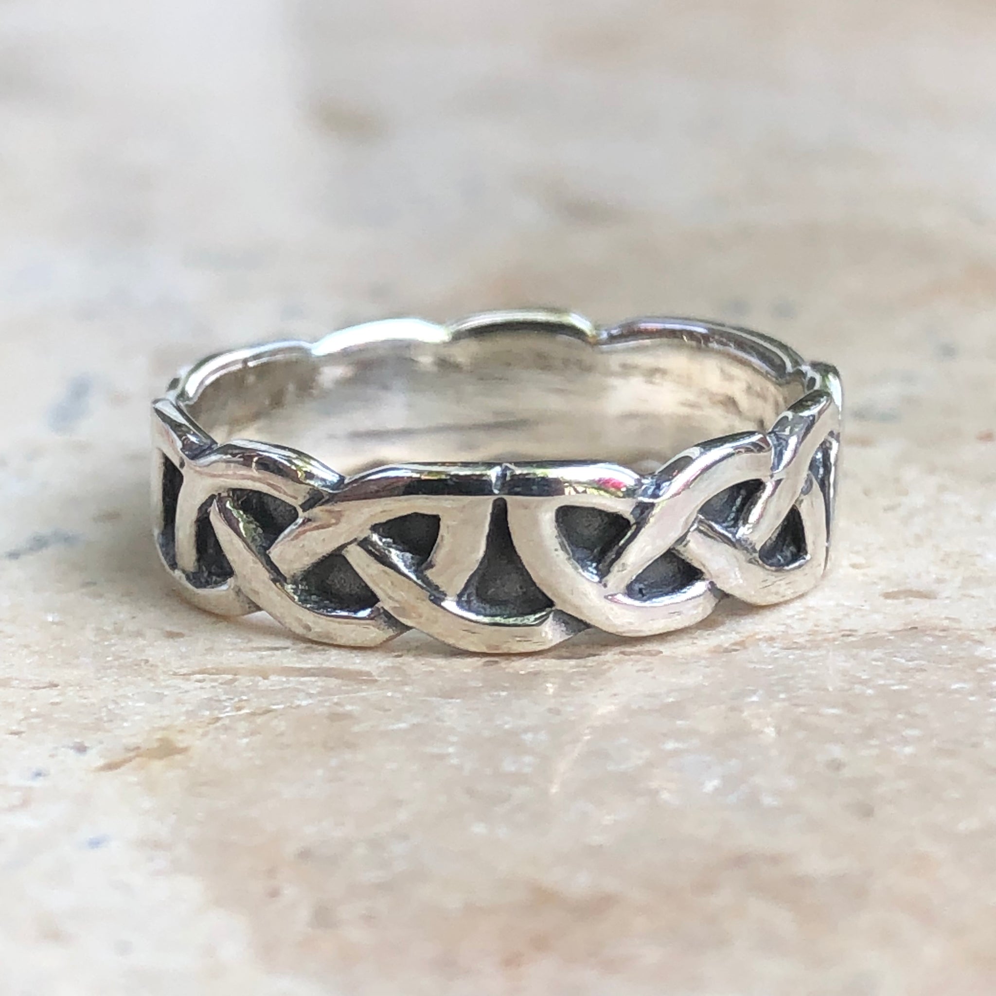 Sterling silver Irish/Scottish Celtic antiqued weave band ring. Great interlocking weave design in a unique antique finish.