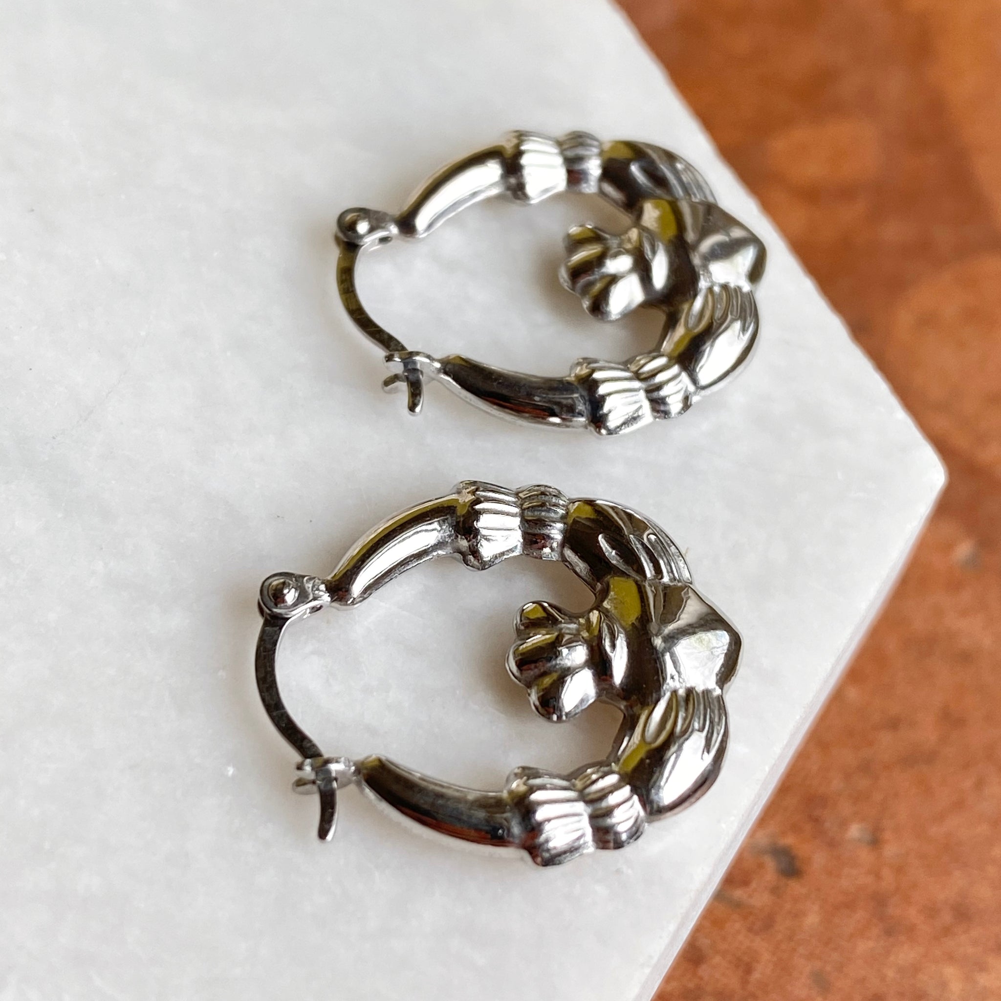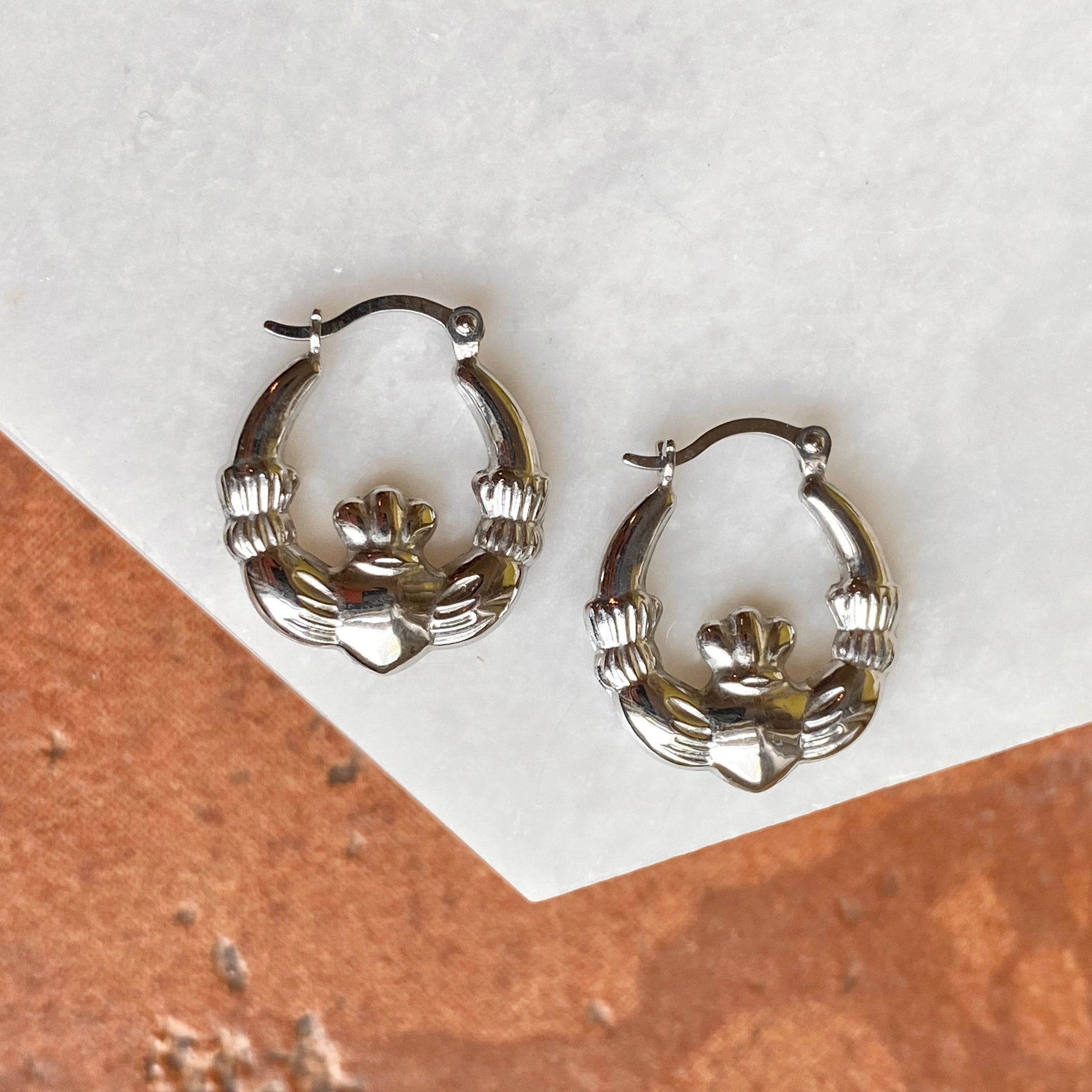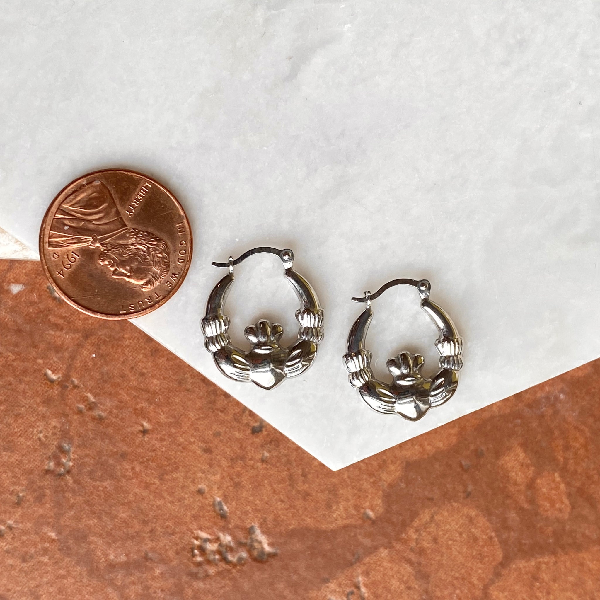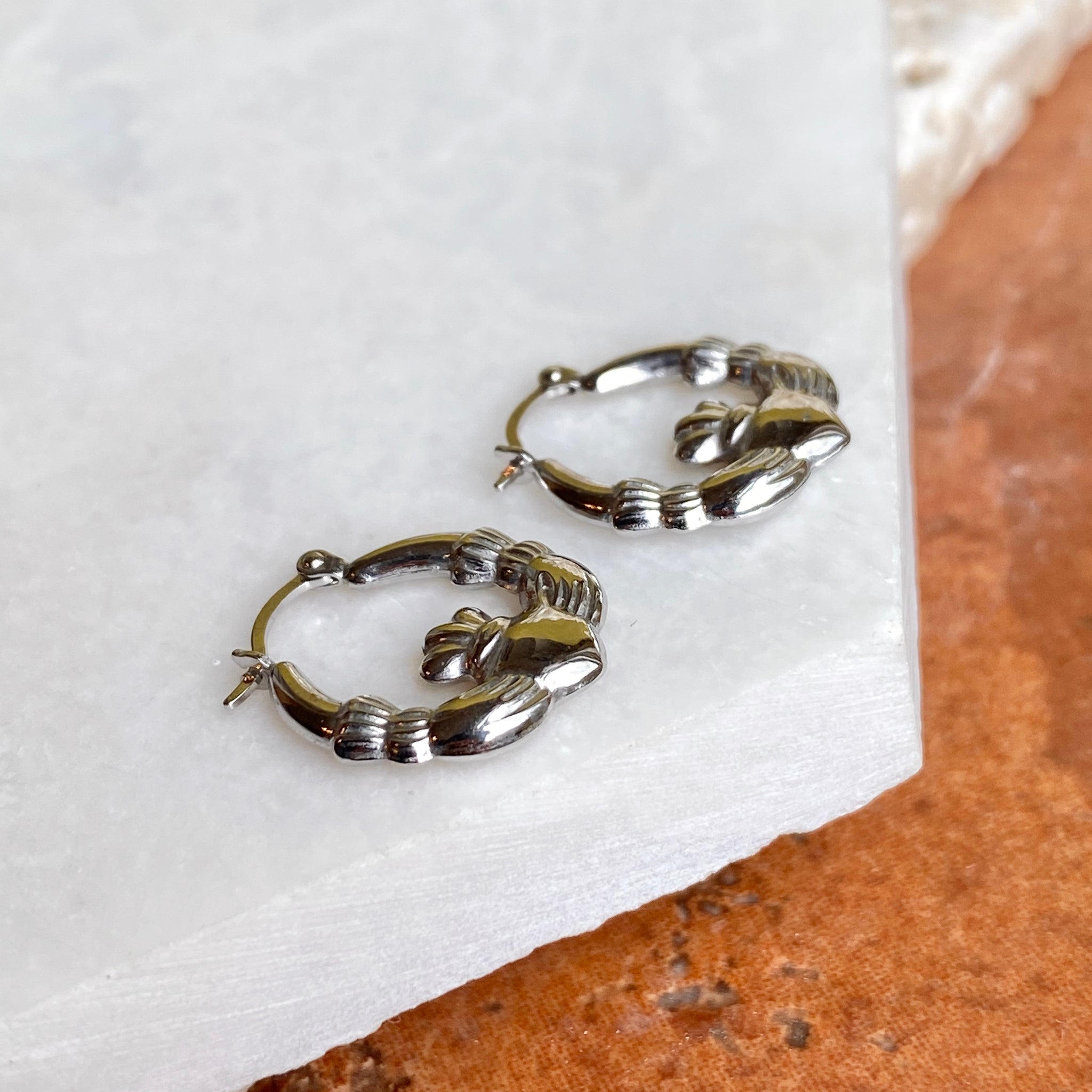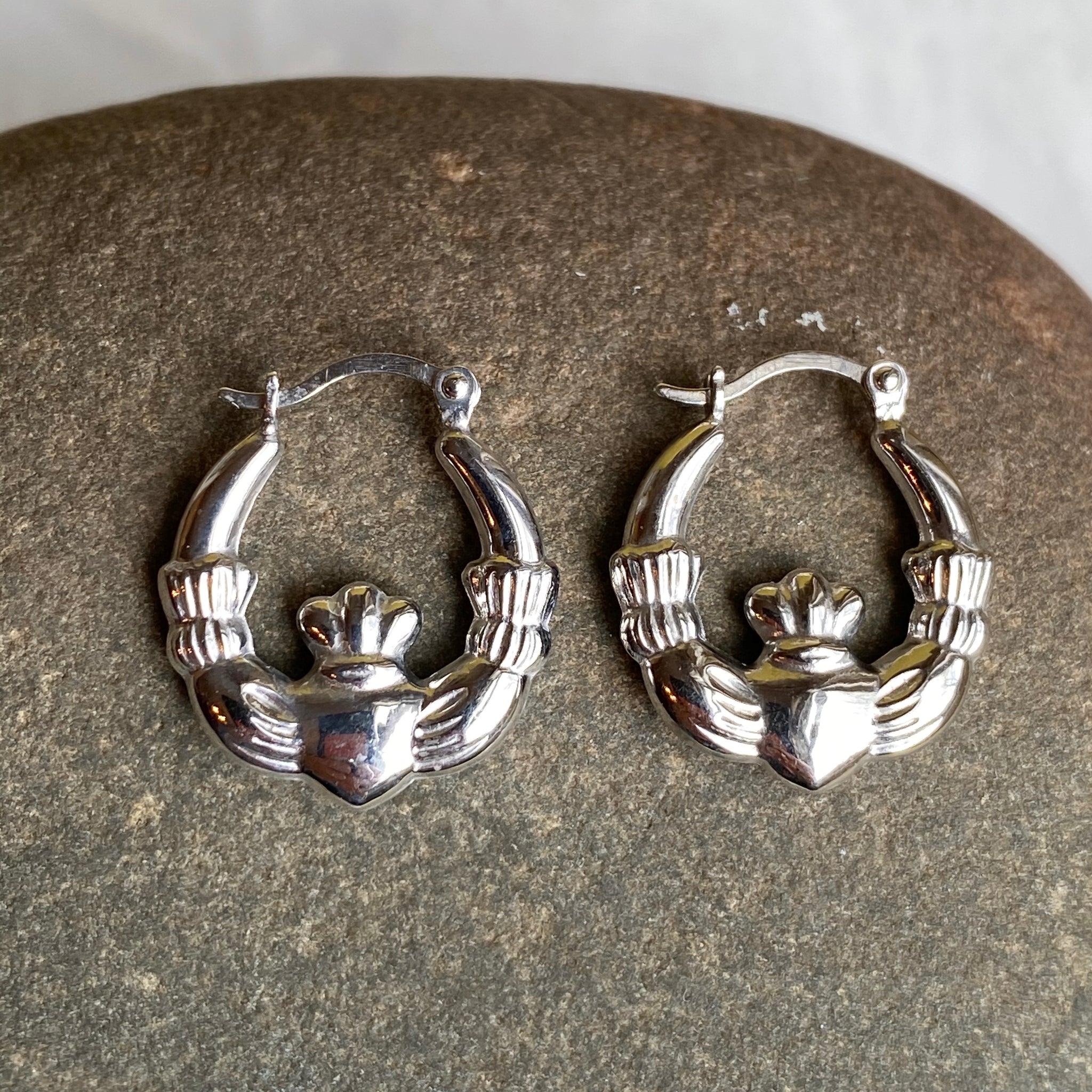 Polished sterling silver hollow hoop earrings with Irish/Scottish Claddagh design. Makes a great gift for the Irish lass! Also A perfect accessory for St.Patrick's Day. Because these small hoops are hollow, these will need special care when wearing/handling. We do not recommend sleeping, swimming, or high energy activities when wearing these hoops.