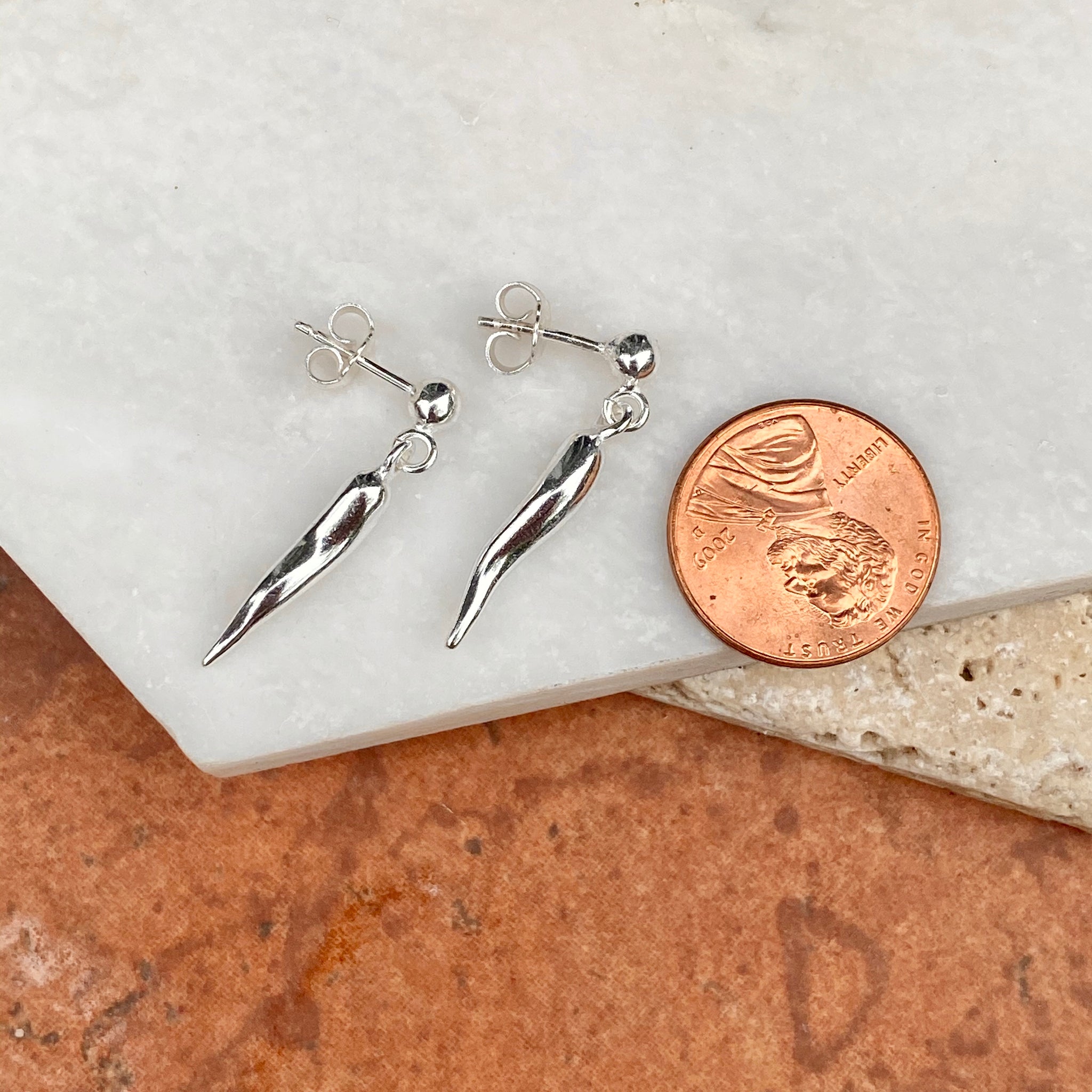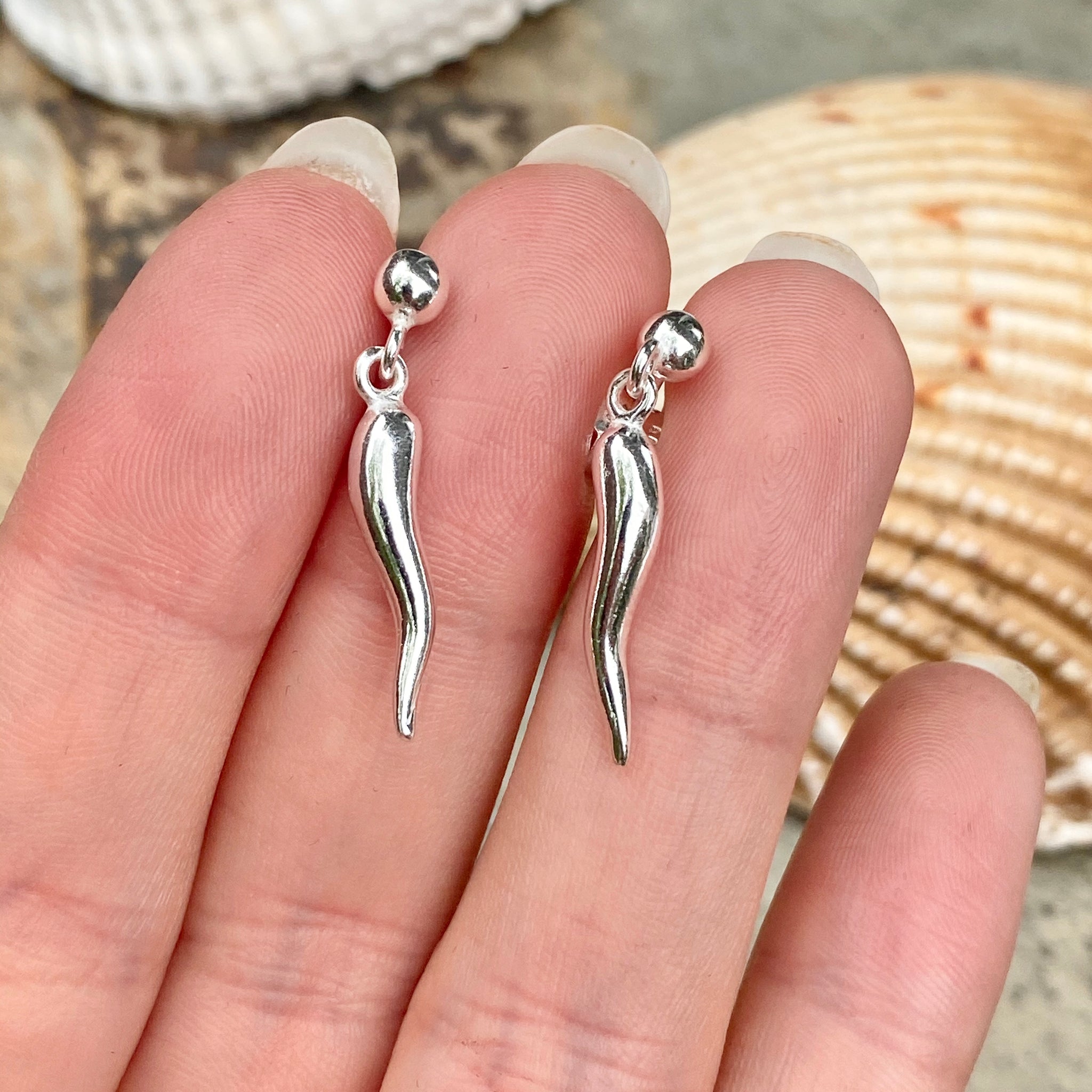 Sterling silver post dangle earrings with "Cornicello" Italian horns. Cornicello means "little horn" in Italian. The Cornicello serves as a luck charm within Italian traditions. Great movement to these dangles!