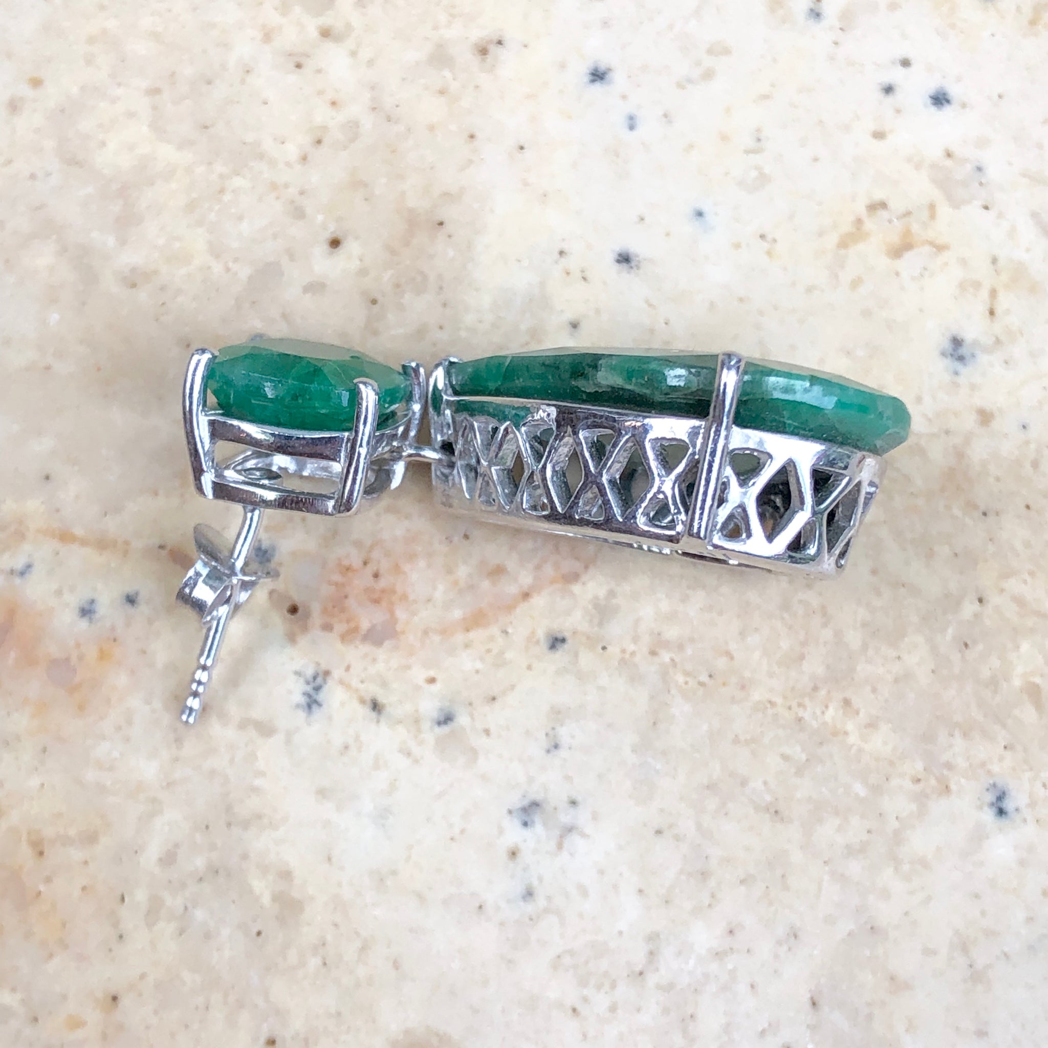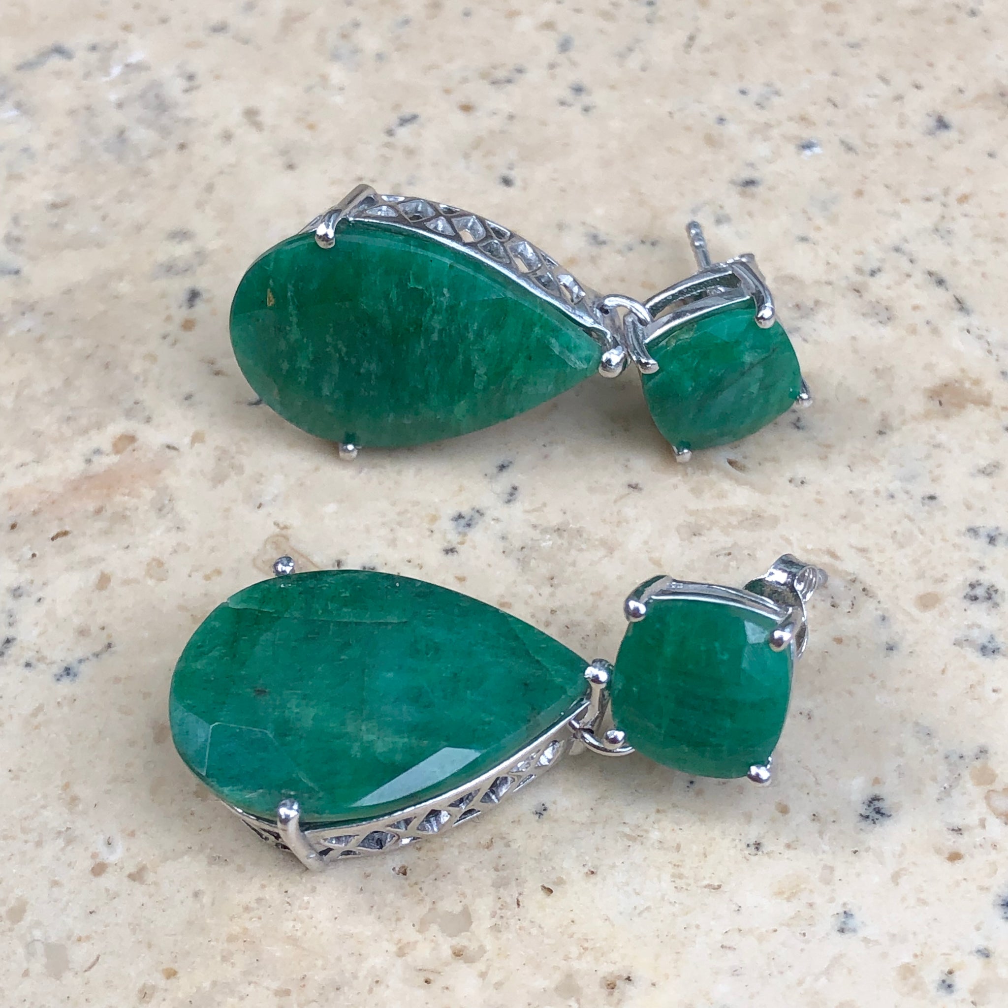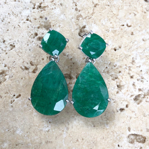 Sterling silver teardrop-shape, cushion-cut emerald dangle drop earrings. Bring a pop of color + Hollywood glamour into your wardrobe with these deep green emerald beauties!