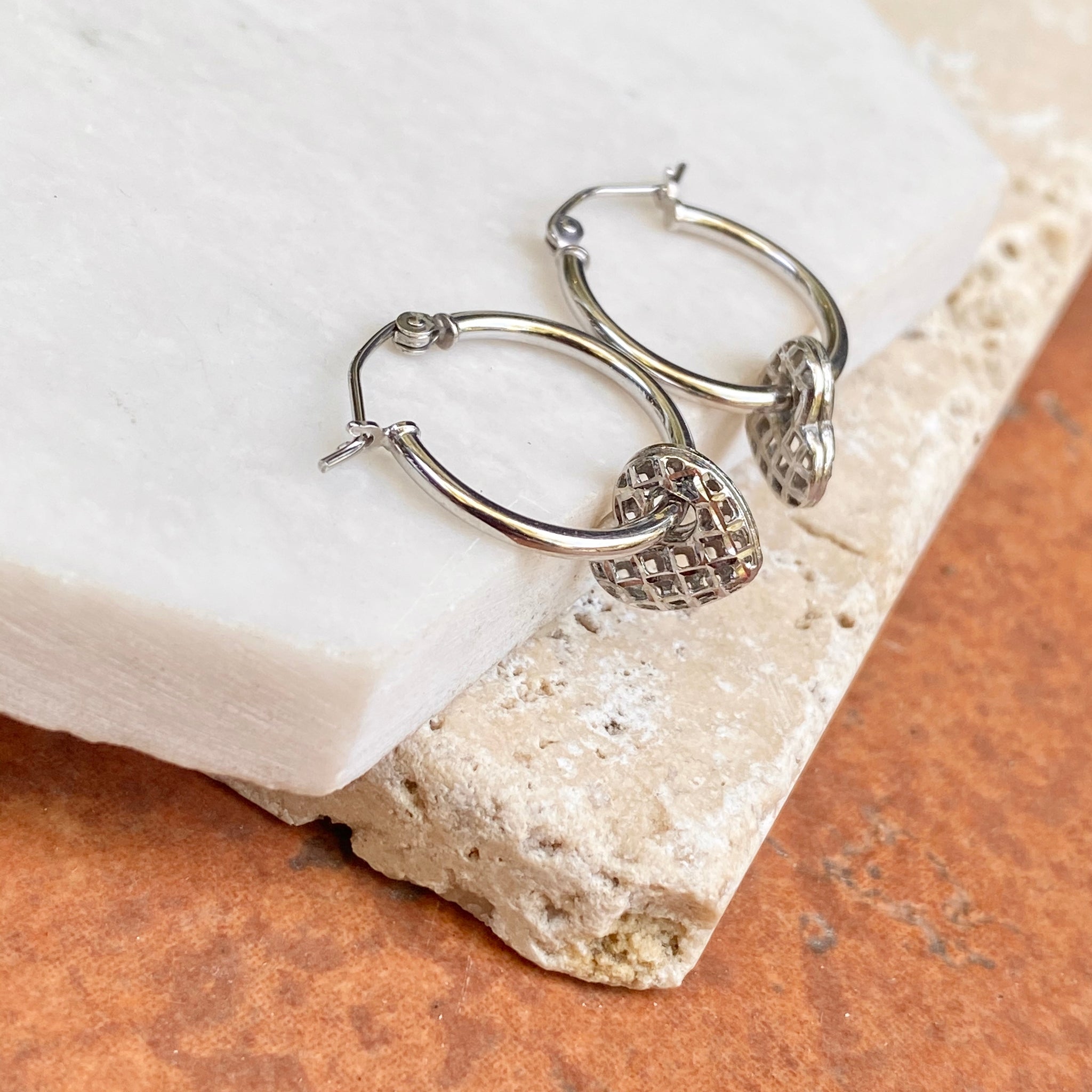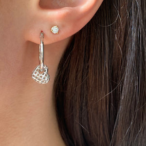 Sterling silver hoop earrings with weave, diamond-cut, movable heart charms. Heart charms slide along the hoop earrings + you can take the charms off and put on other hoops as well. Also available in 14KT yellow gold.