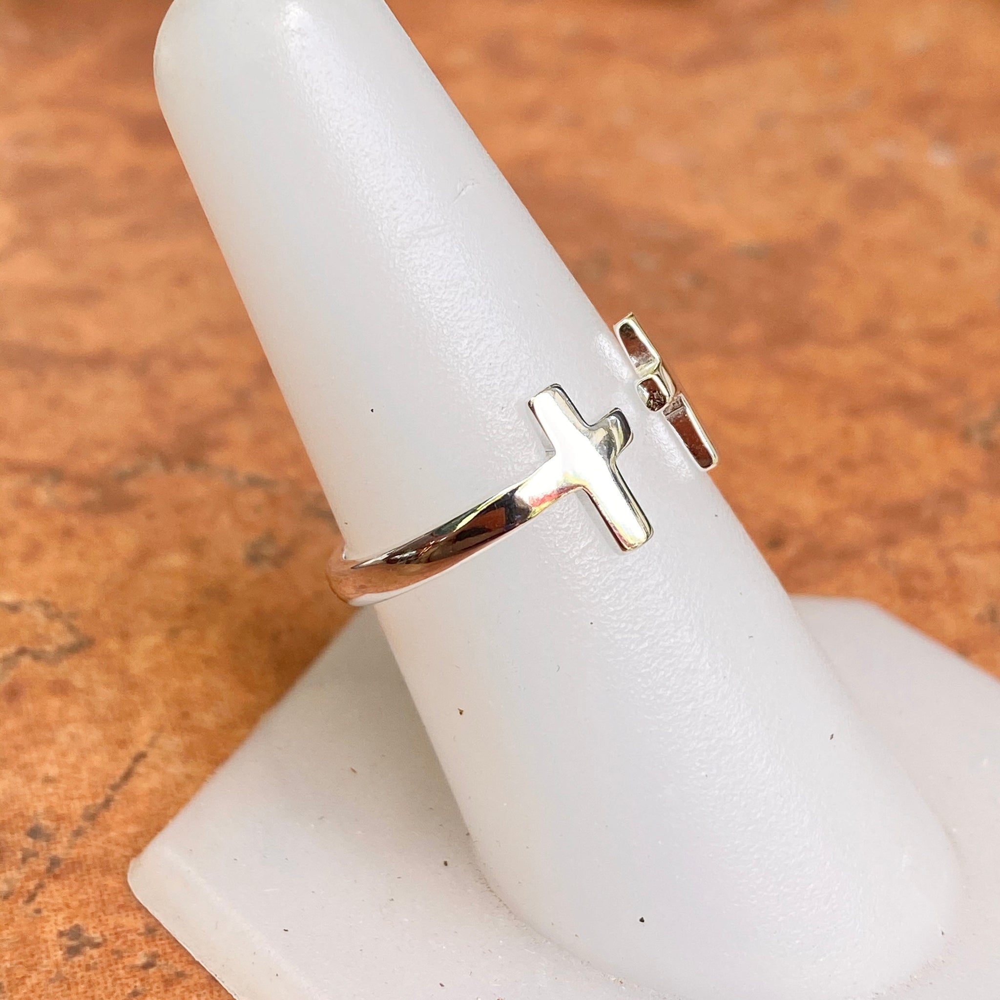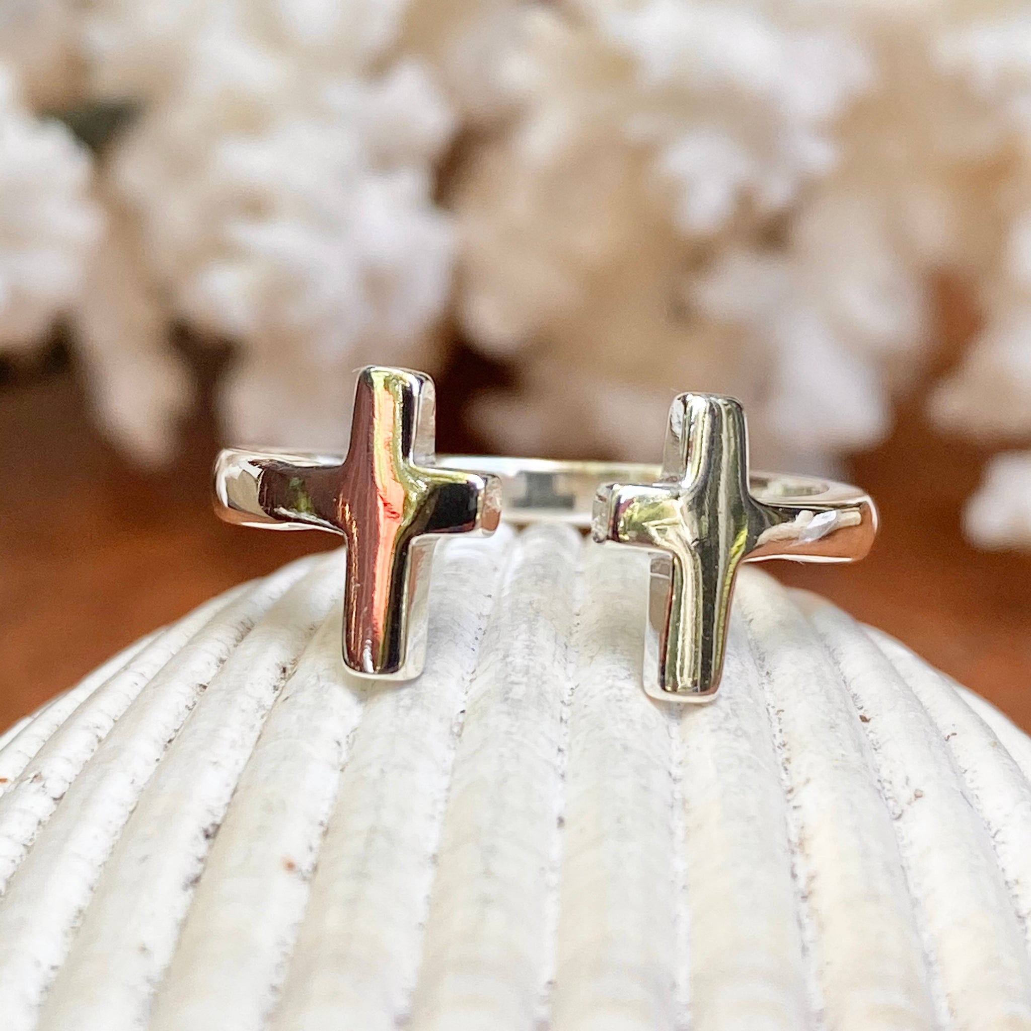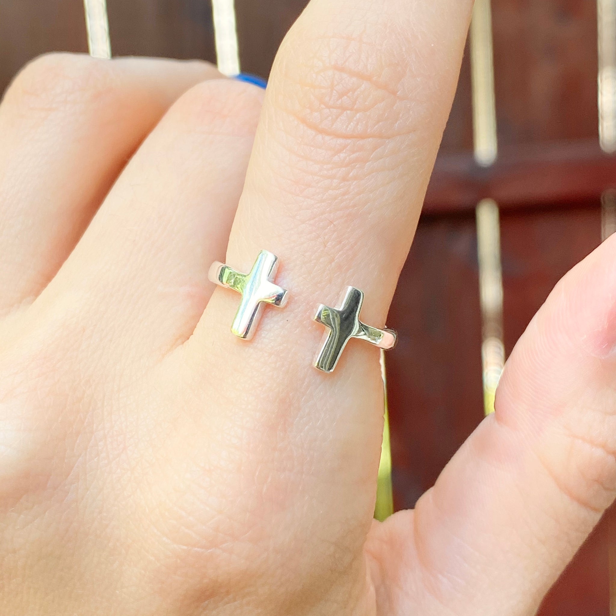 Polished sterling silver double cross negative space ring. A simple and modern designed cross ring with unique open center detail.