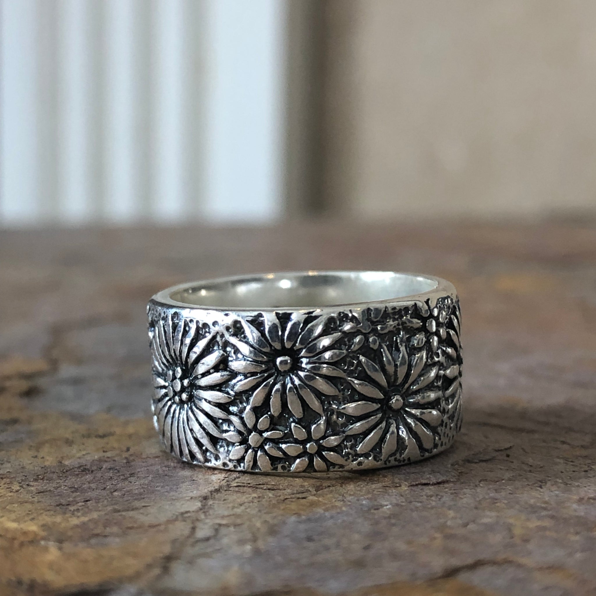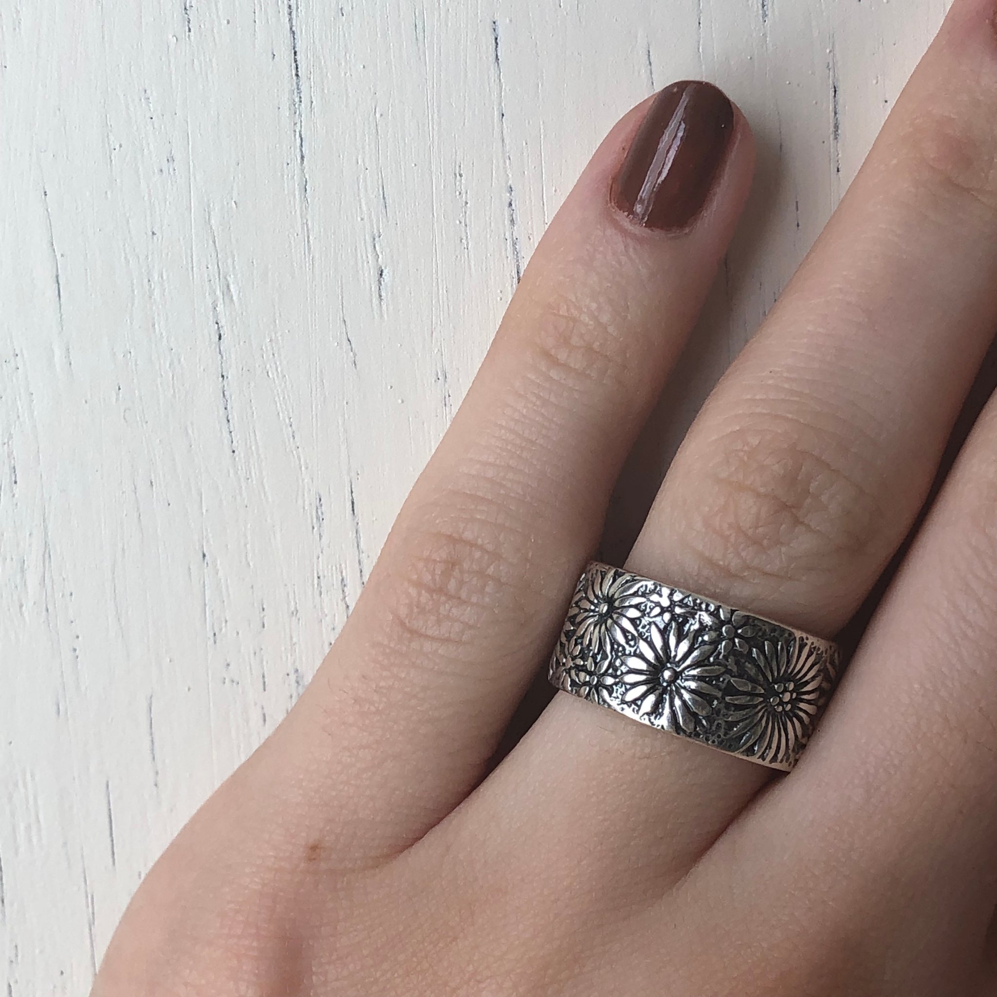 Sterling silver wide, floral cigar band ring. Be mindful, because of the wide band, this ring fits snug + it is recommended to go up one size.