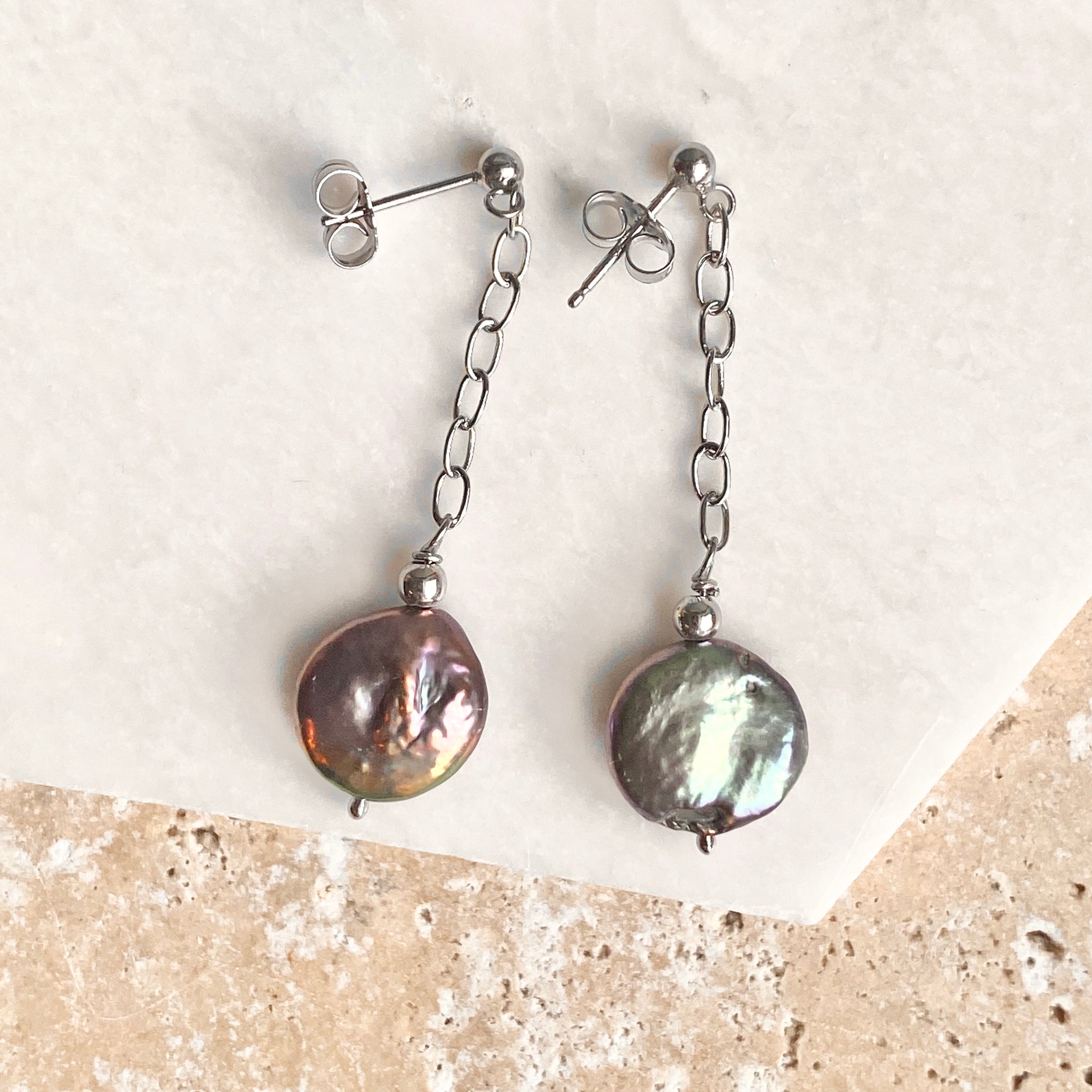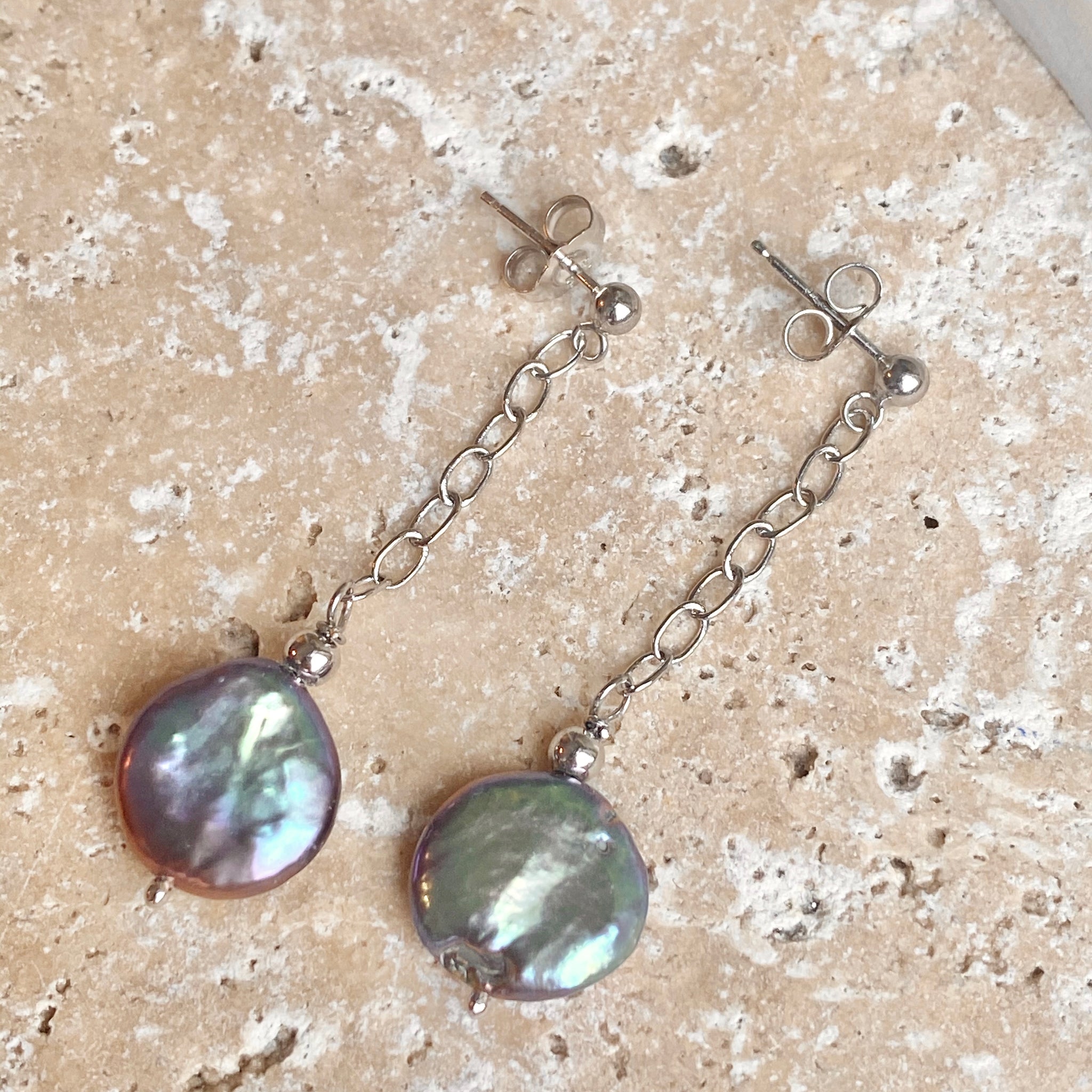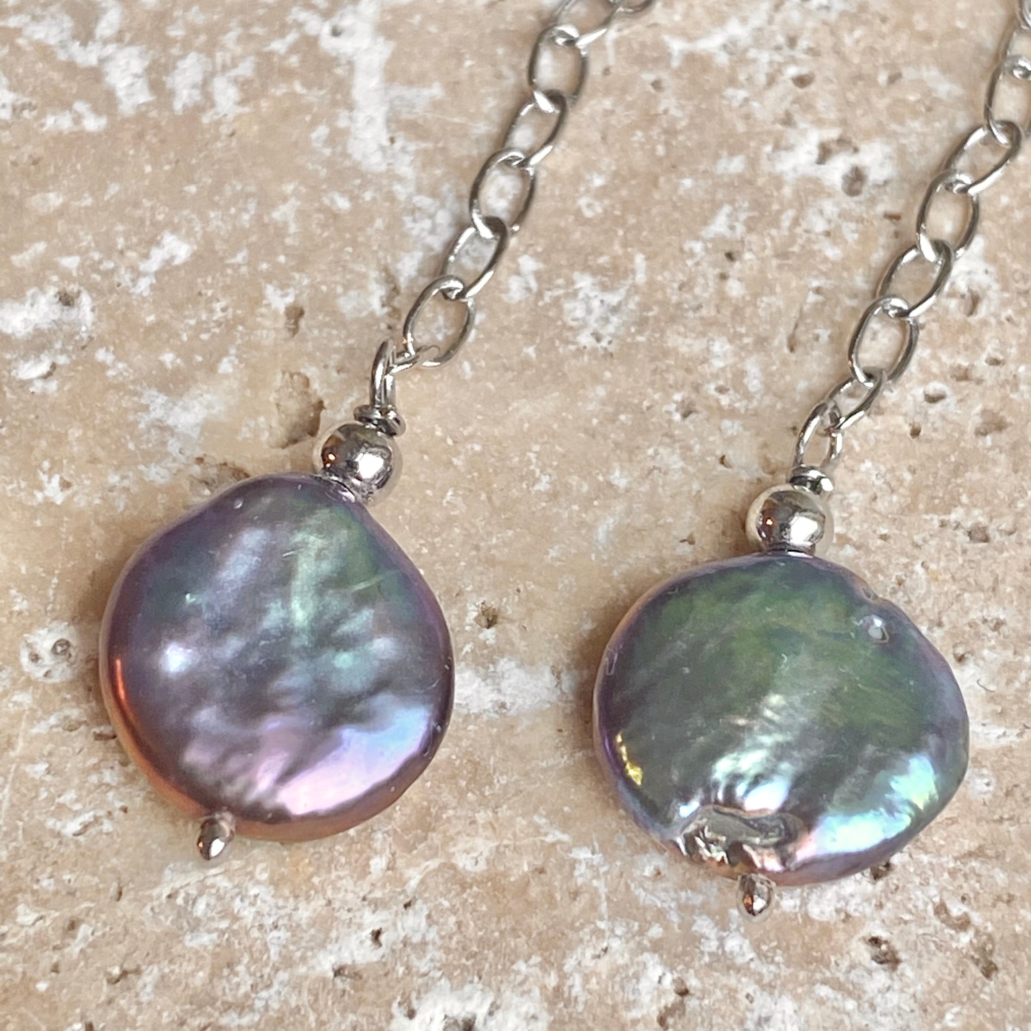 Sterling silver cultured freshwater black pearl coin dangle chain earrings. Pearls reflect different colors in the sunlight!