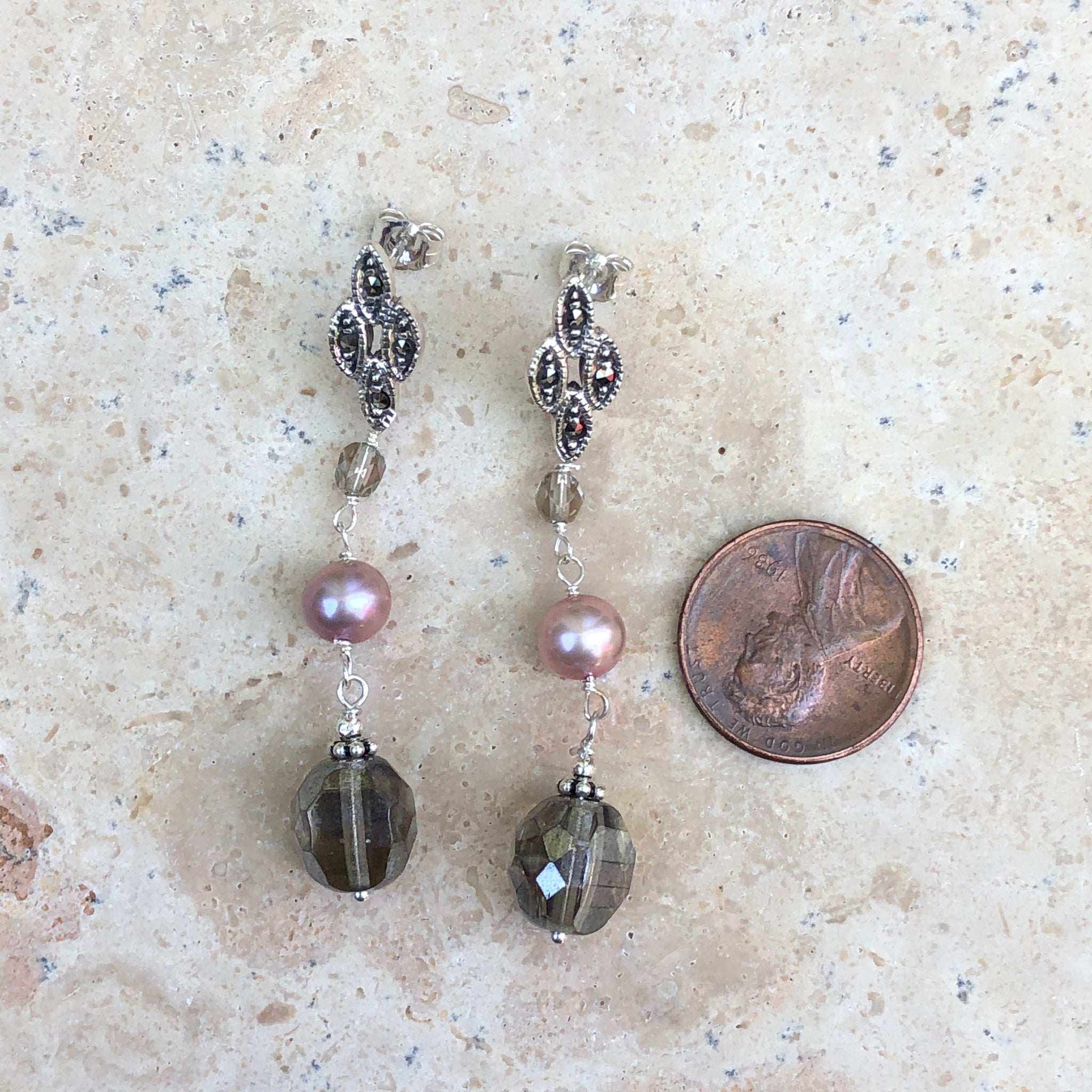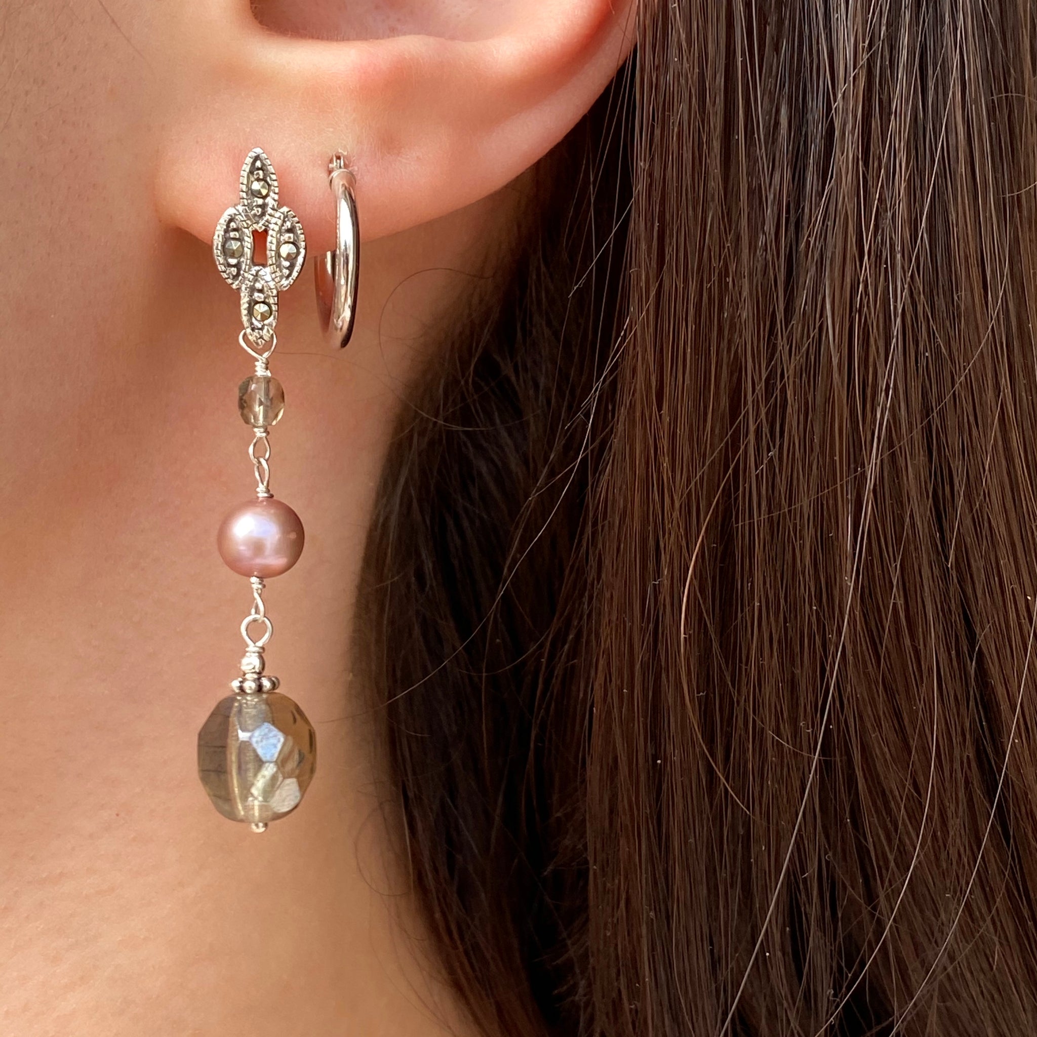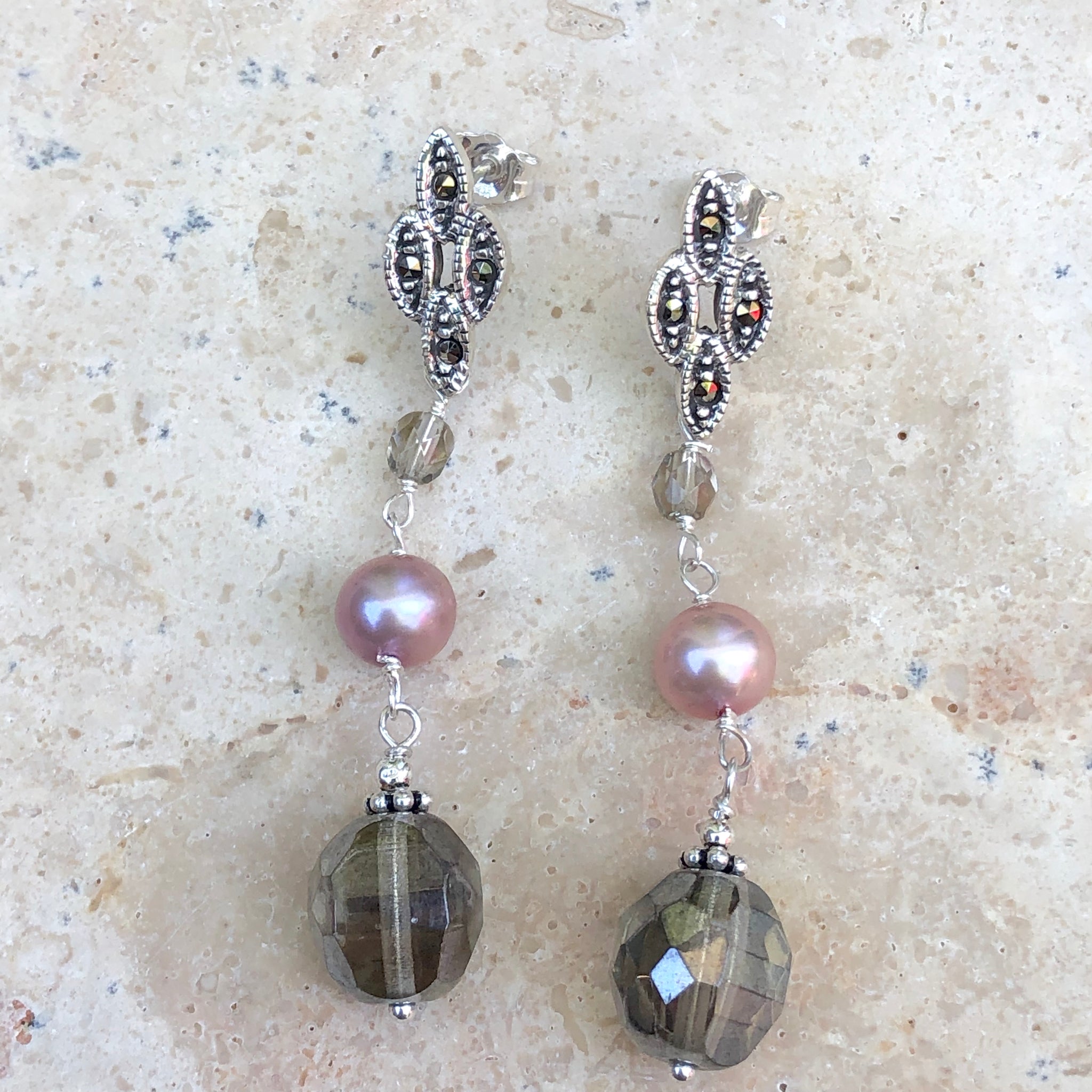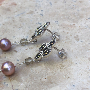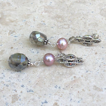 Sterling silver freshwater cultured cream color pearl + glass dangle fancy post earrings. Features beautiful freshwater pearls + glass beads in an antique finish dangle earring.