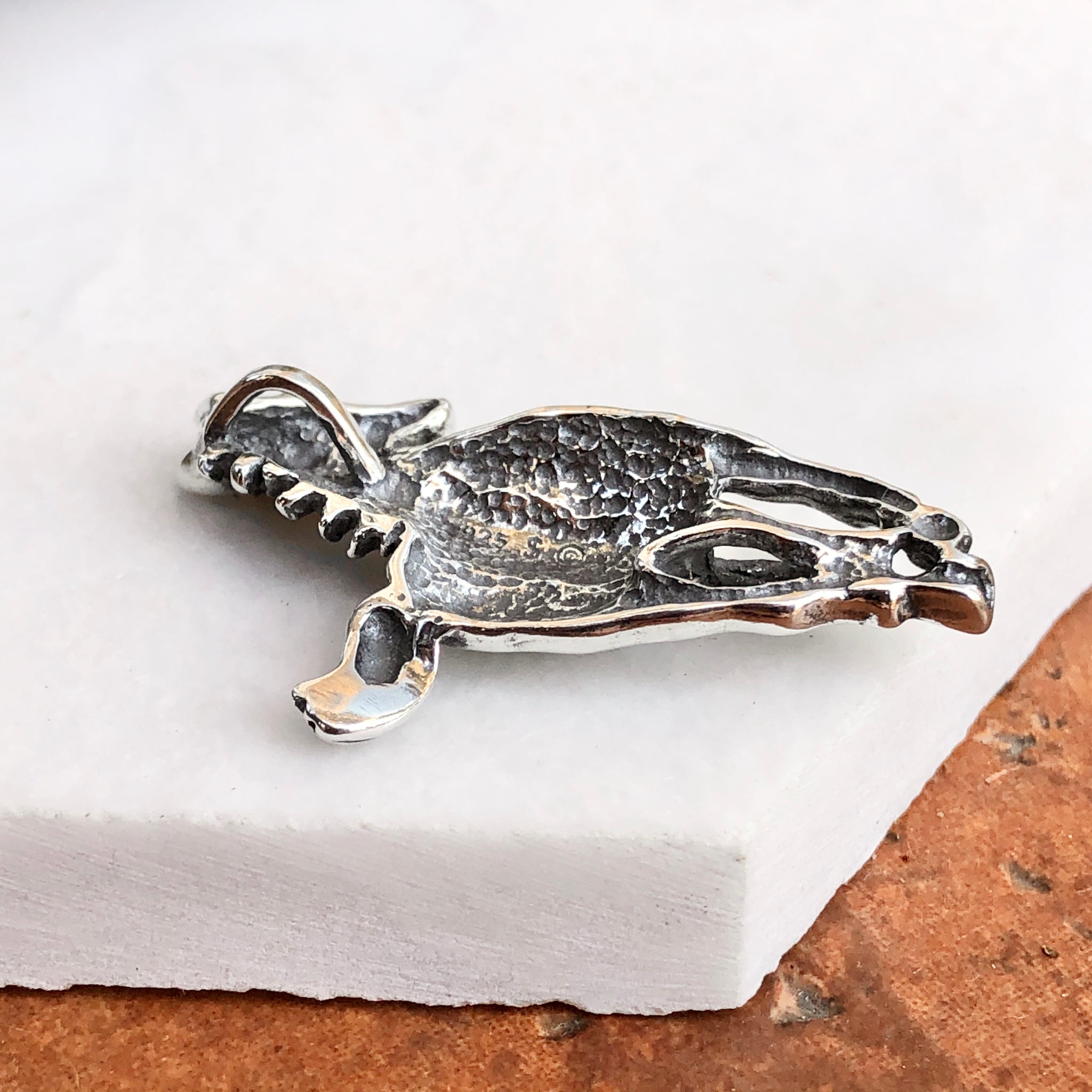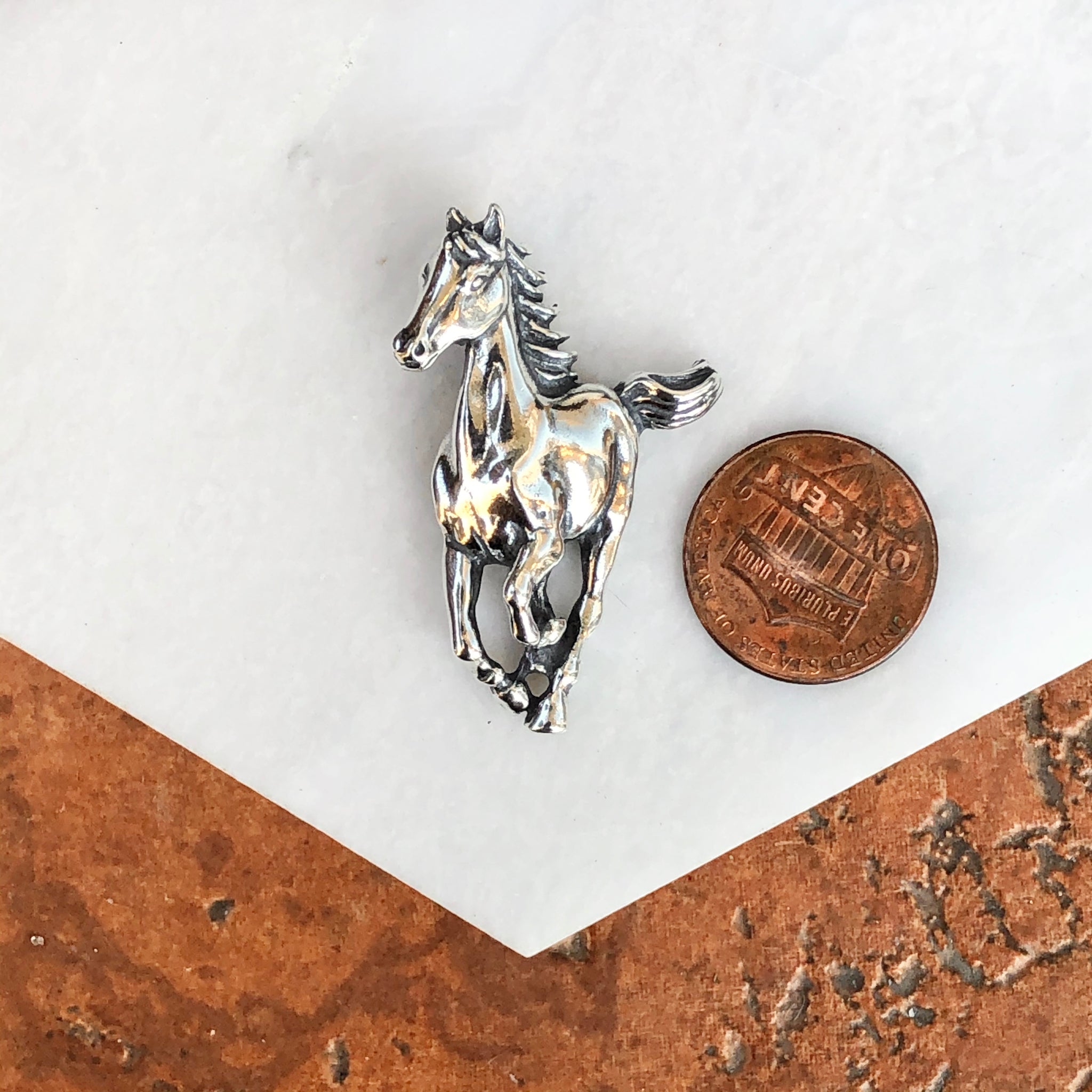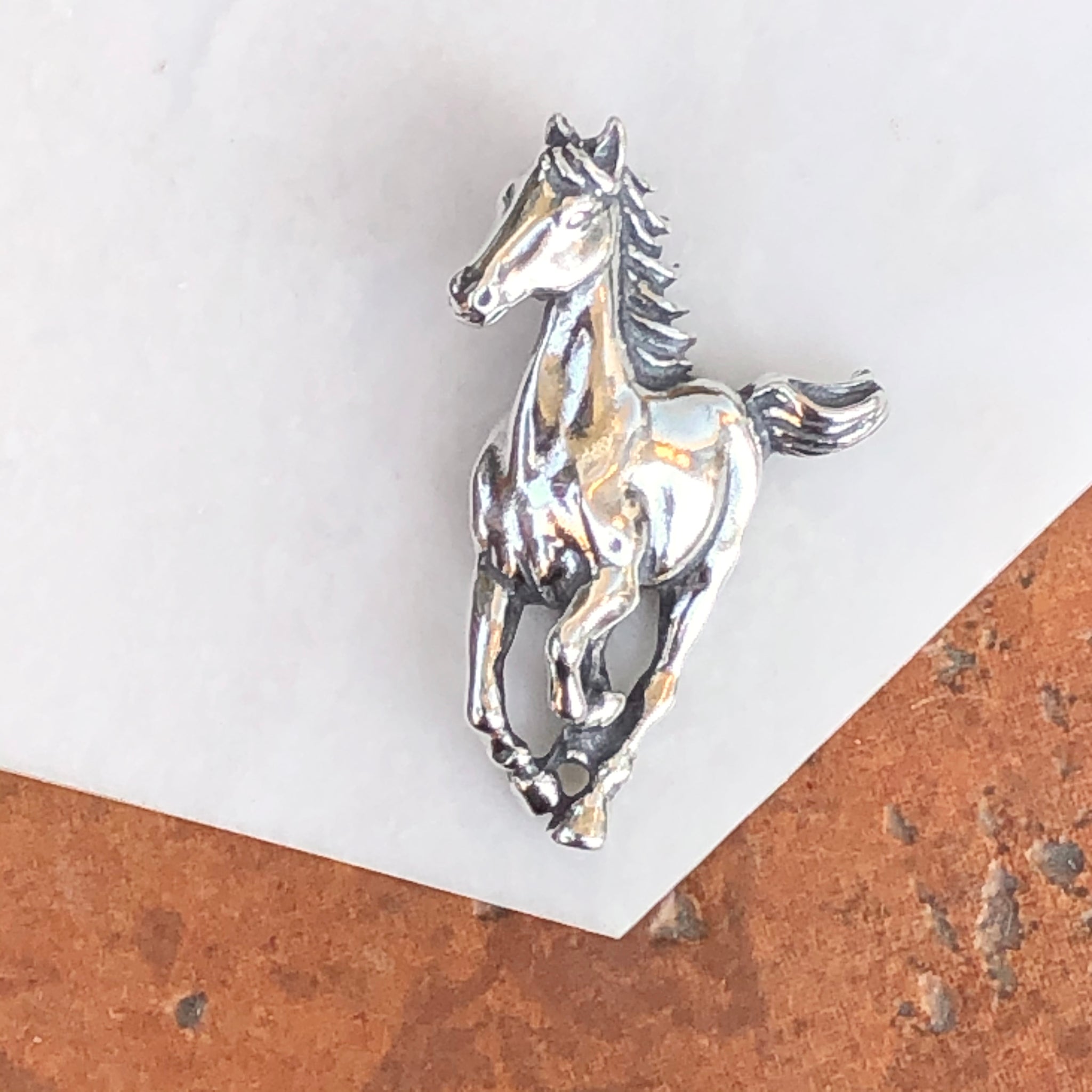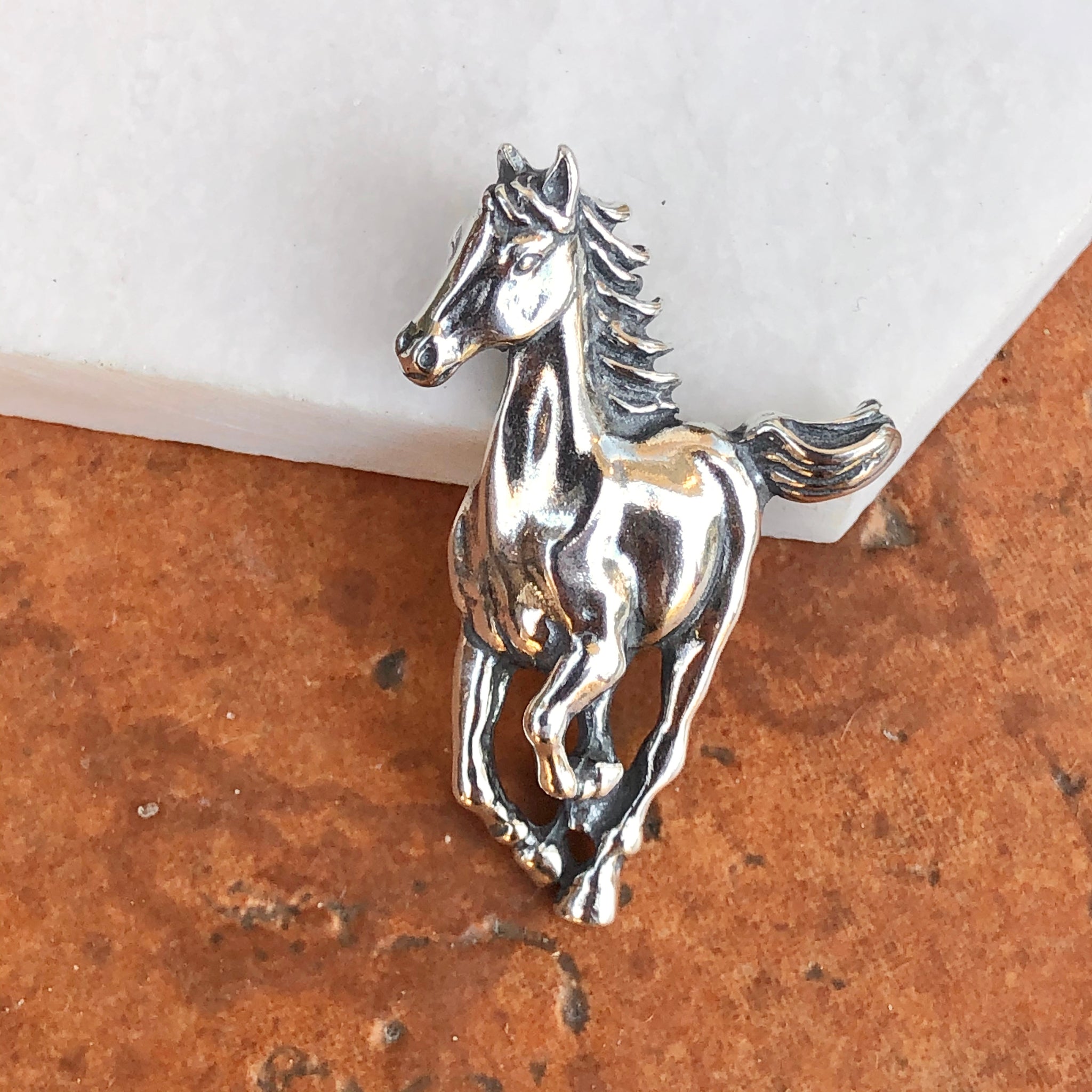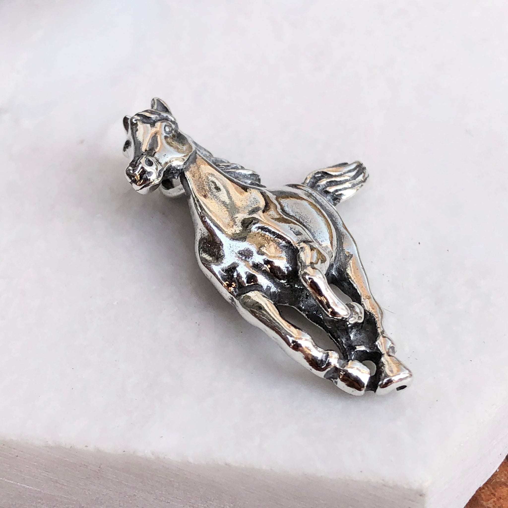 This sterling silver pendant in the form of a galloping horse offers three-dimensional detailing that creates an impression that the horse is actually approaching. Brightly finished, this piece features an oxidized surface that emphasizes the fine details of the cast design. The pendant features a hidden ring on the back so it can slip onto a cord or chain without a visible connection to distract the viewer's eye.
