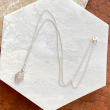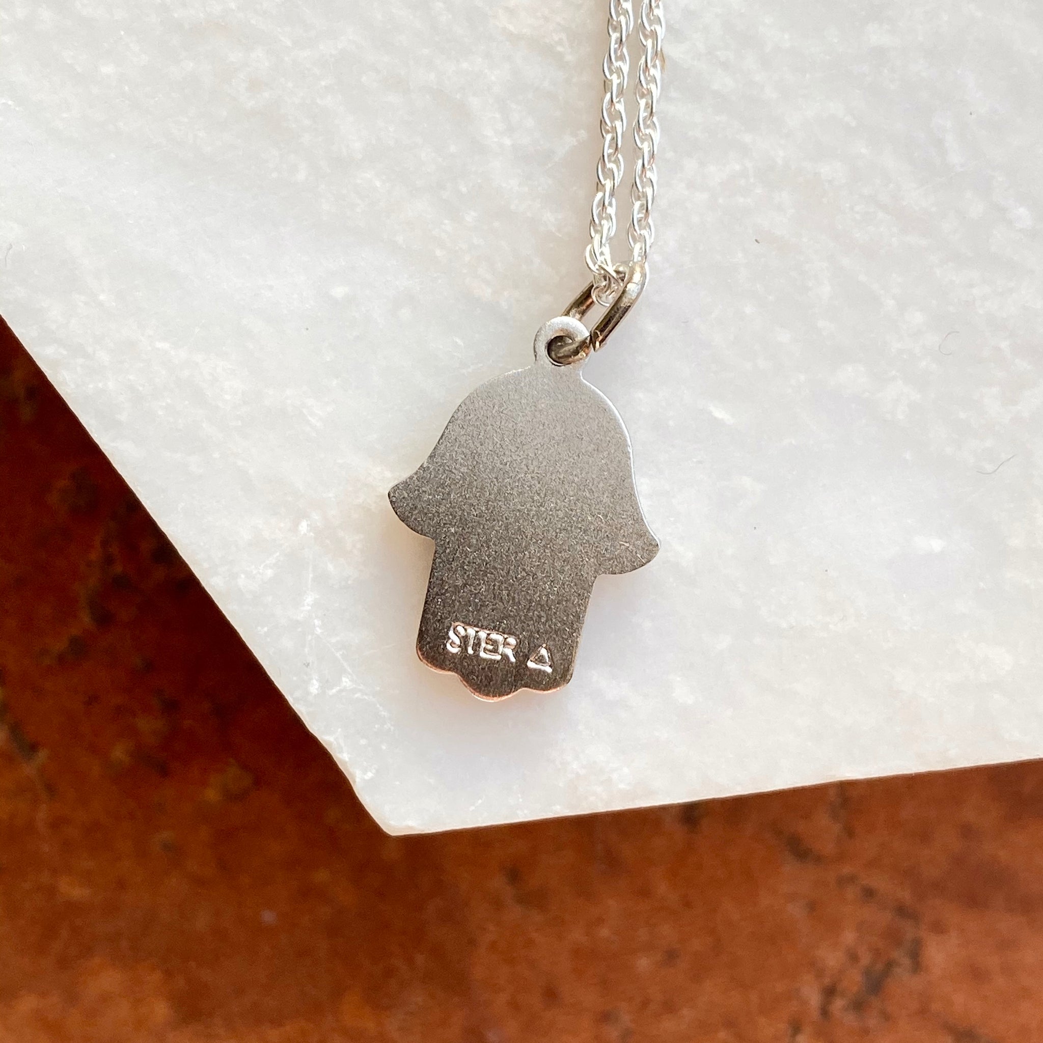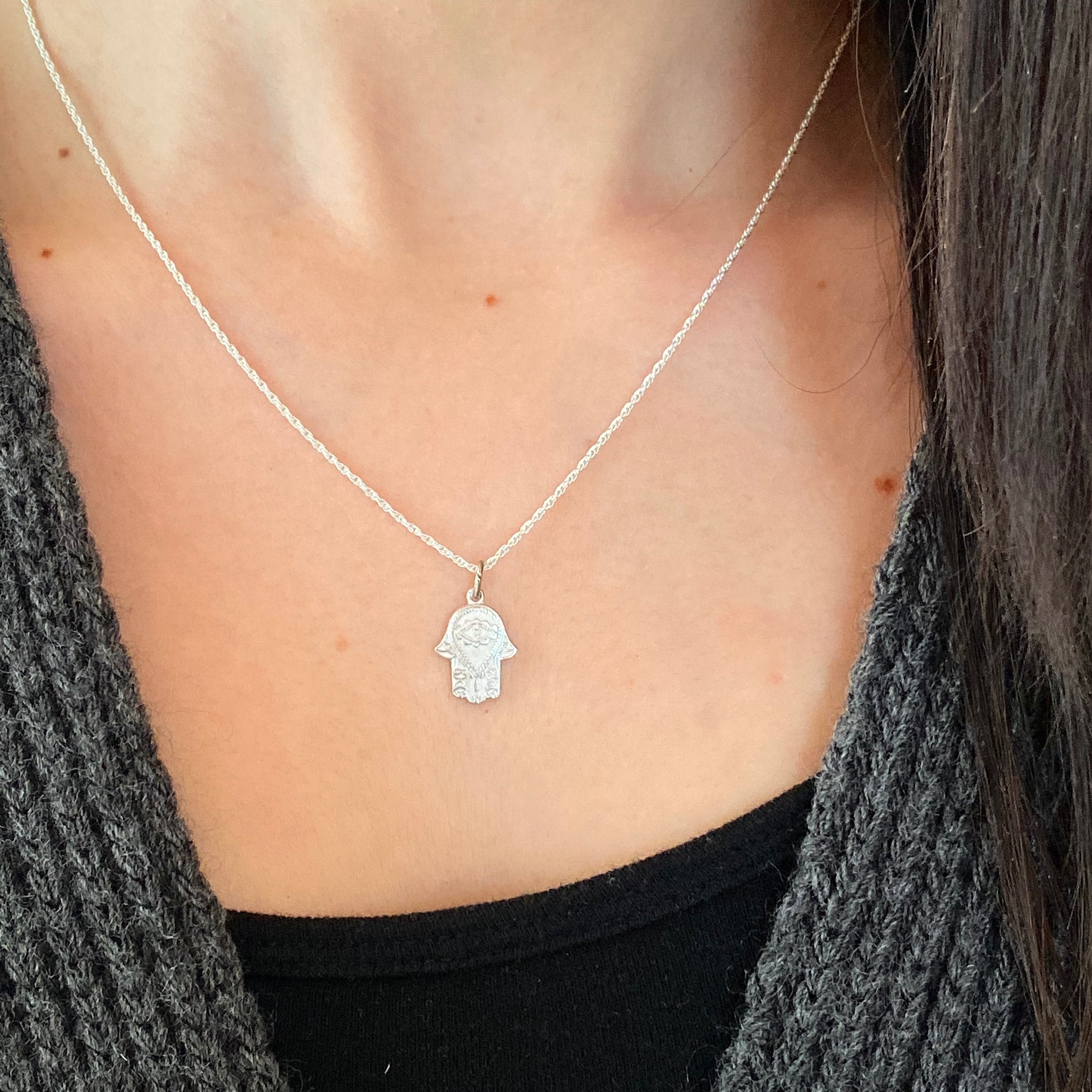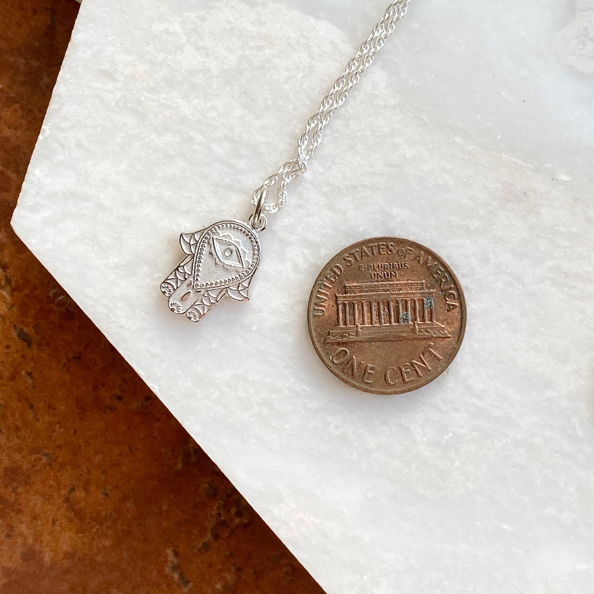 Ward off evil with this polished sterling silver Hamsa/ Chamseh "Hand of Fatima" pendant charm on a sterling silver rope chain necklace.