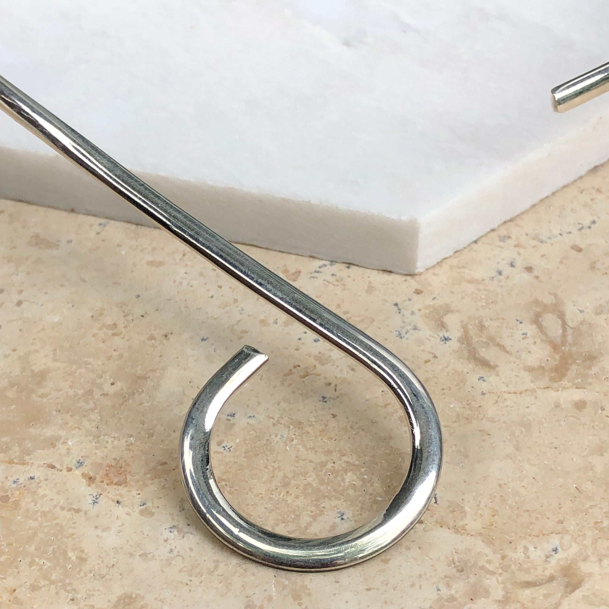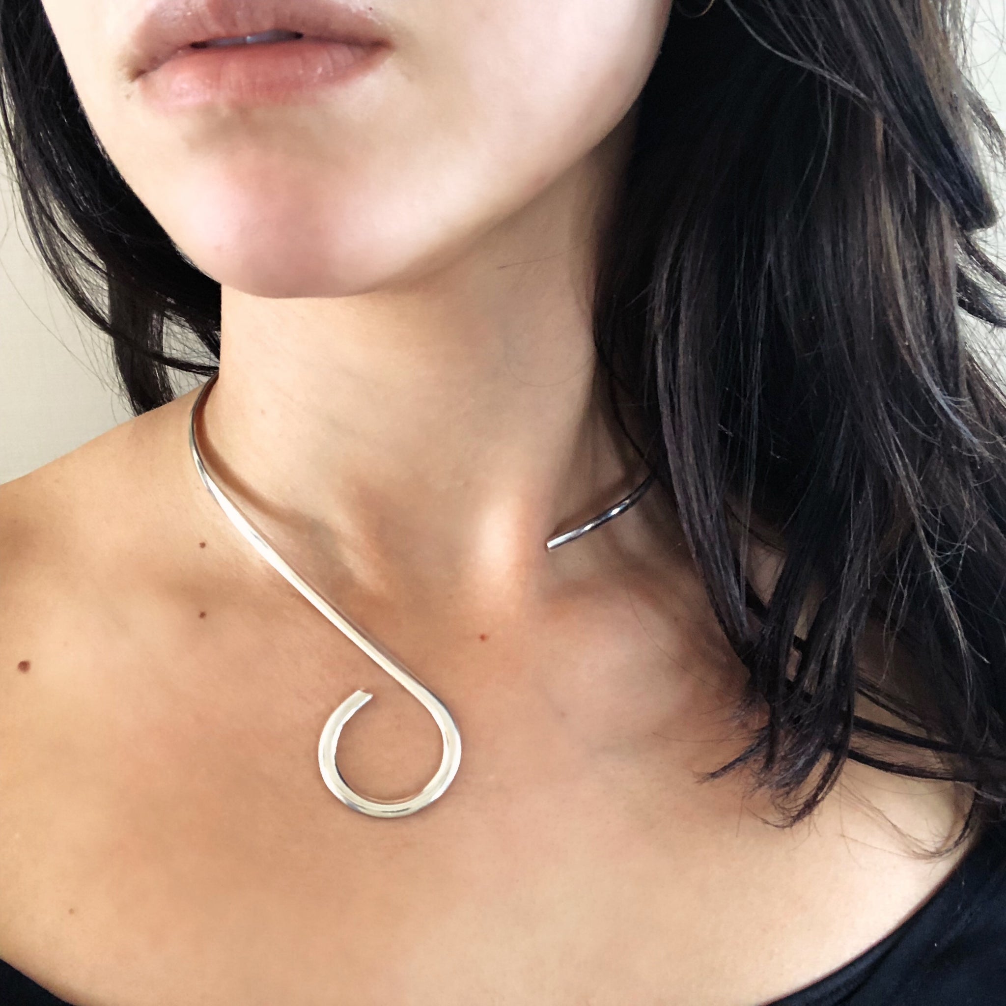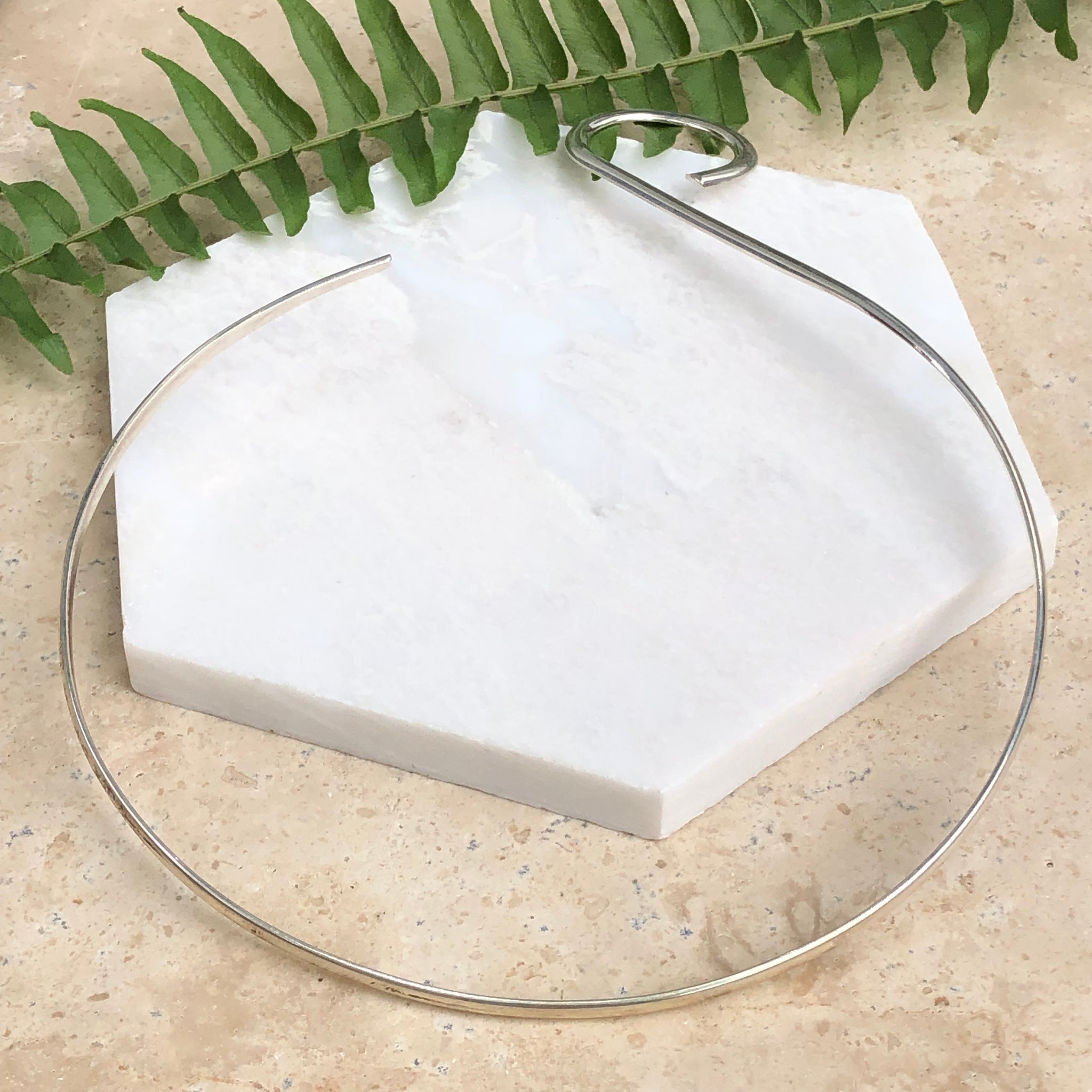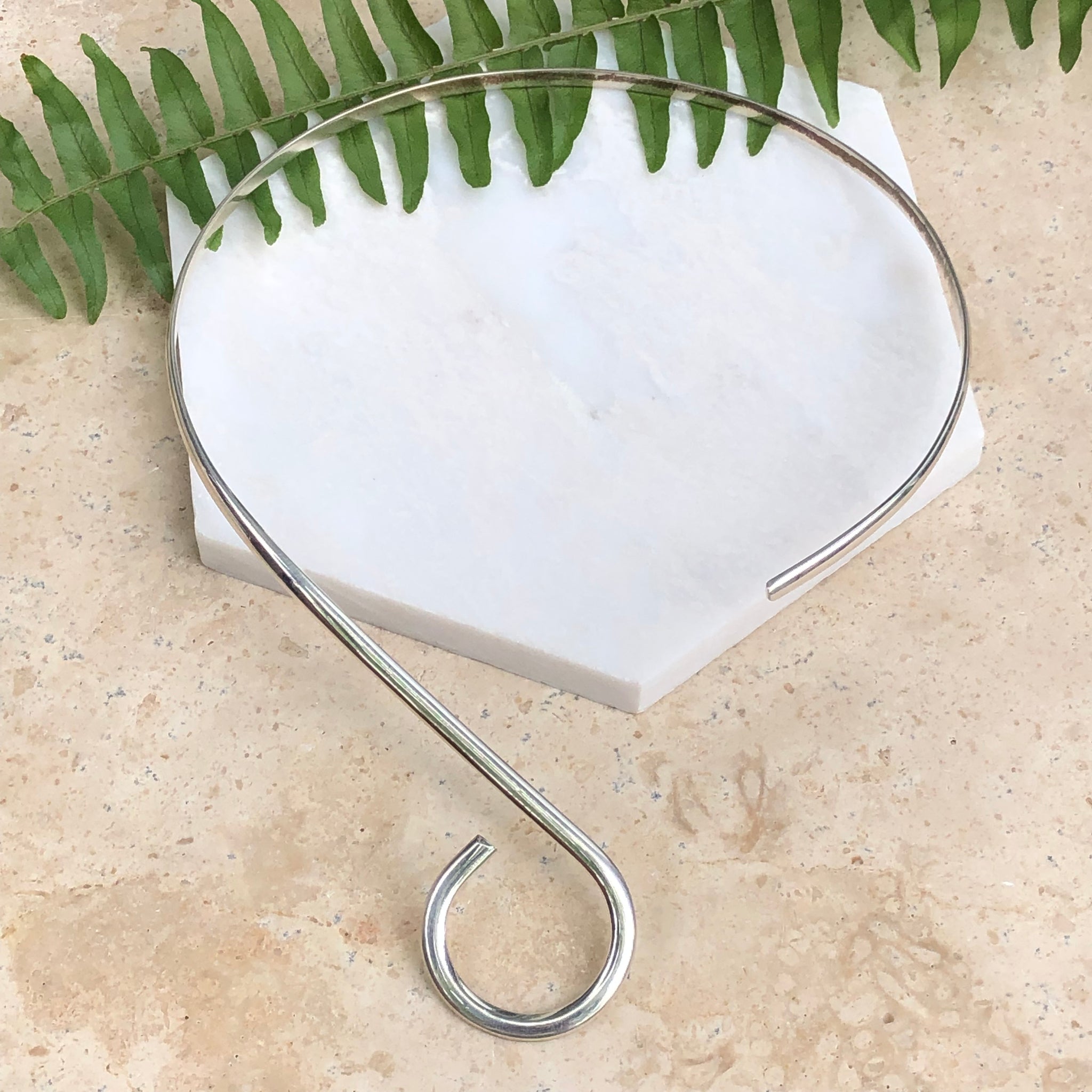 Shiny sterling silver open-ended neck wire with curled loop collar necklace. Easy to use piece with slight flexibility. Open circle on the long end is perfect for attaching a pendant.