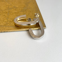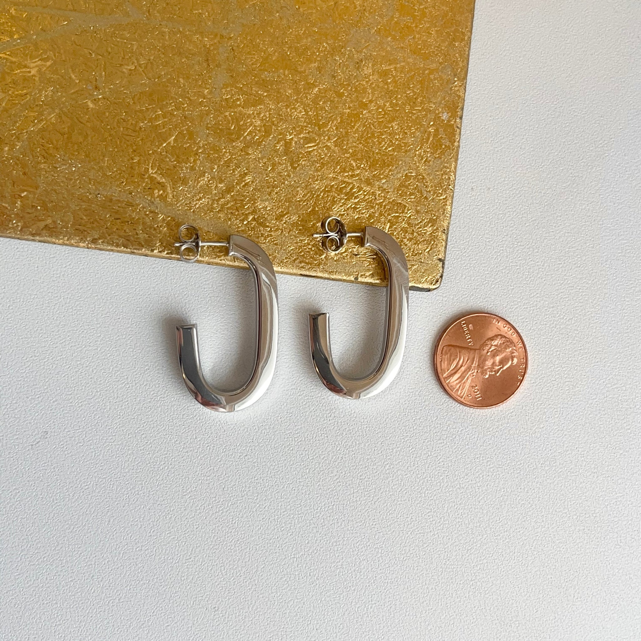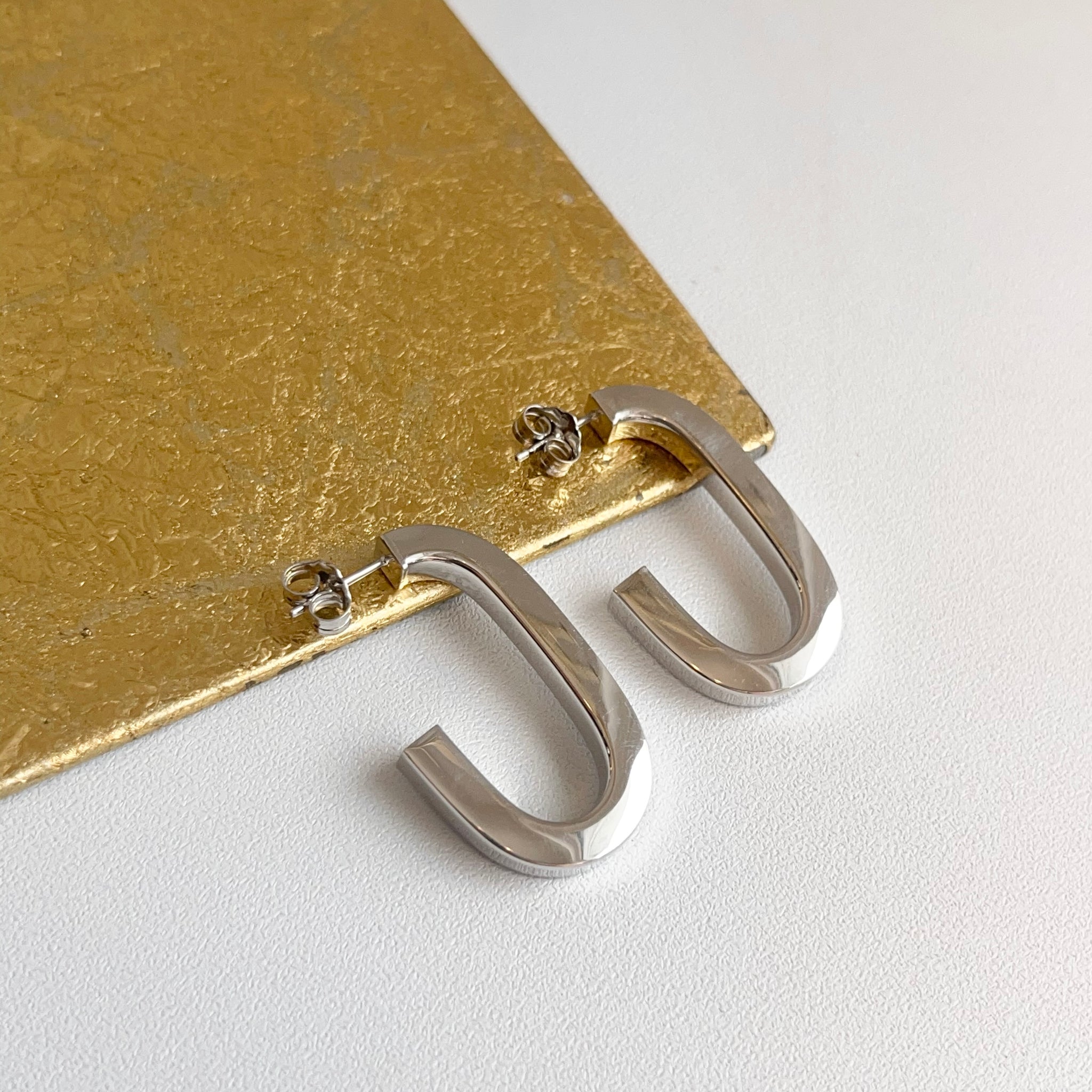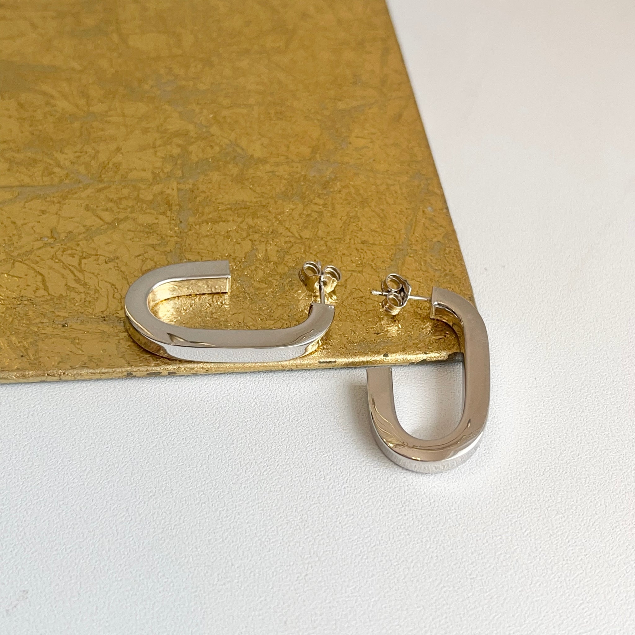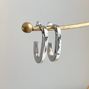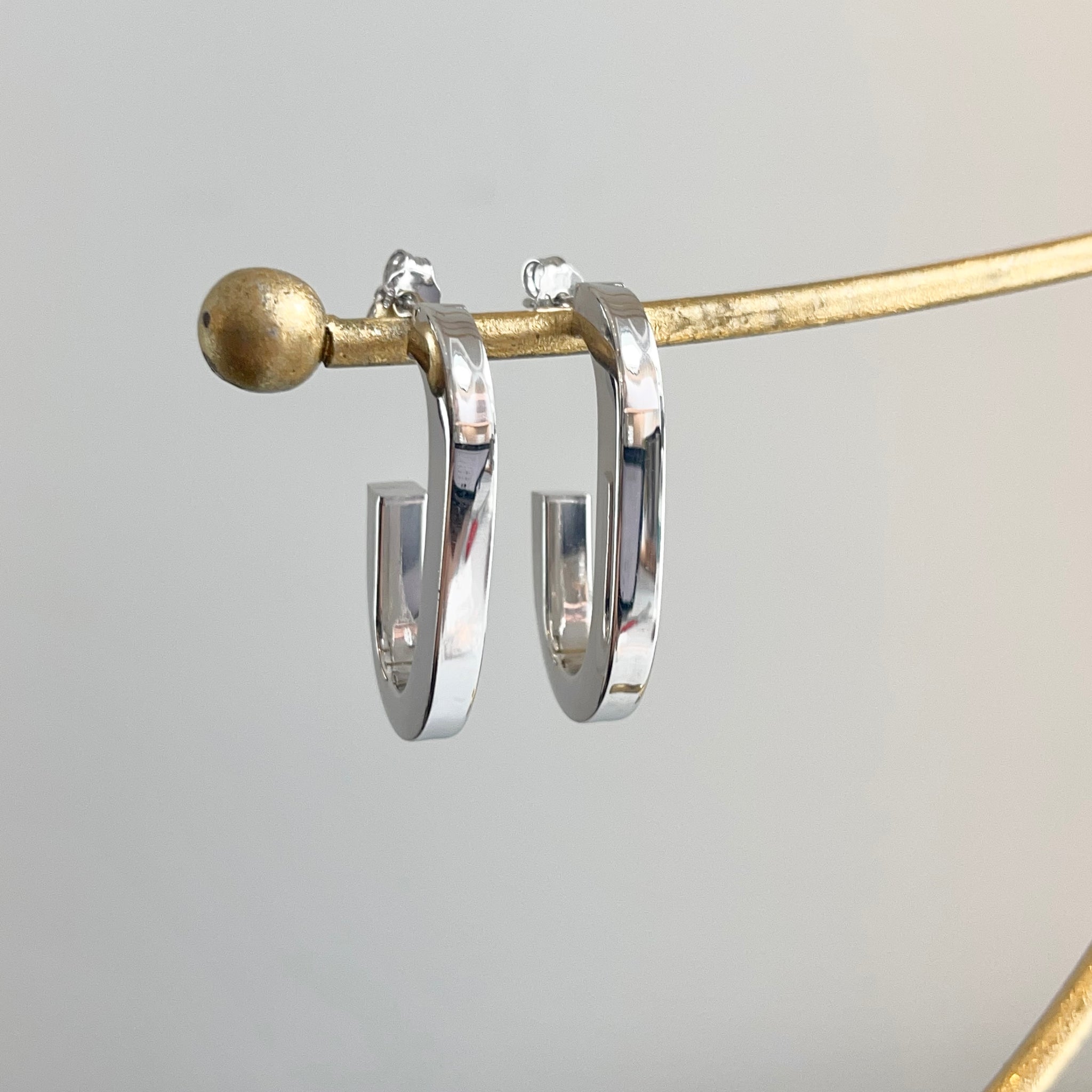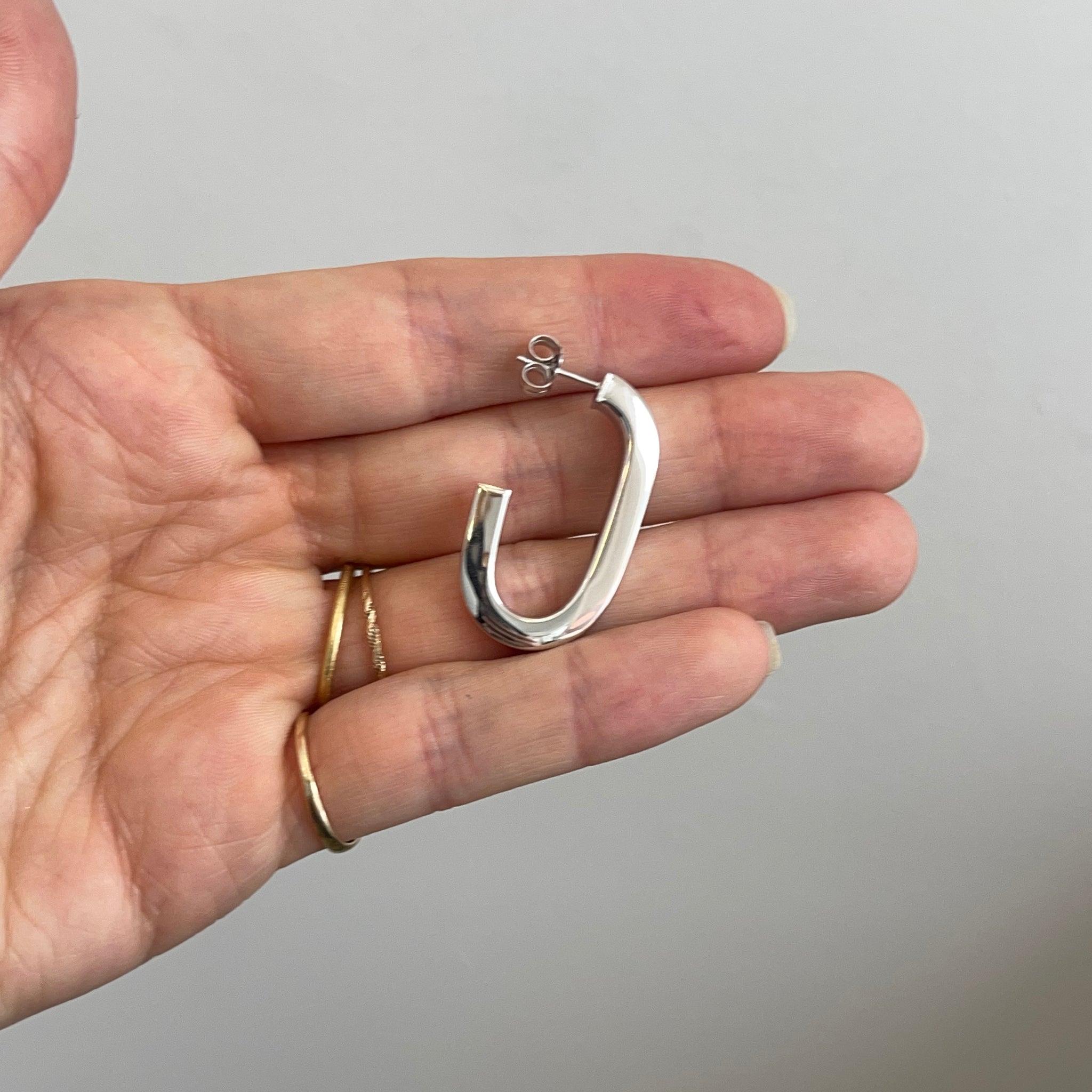Sterling silver shiny-finish, oval, elongated, c-shape hoop post earrings. Beautifully elongating, modern, statement hoops!