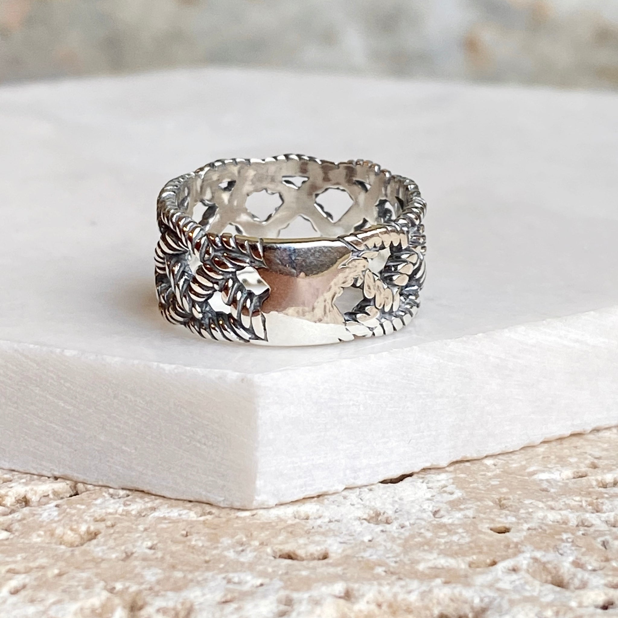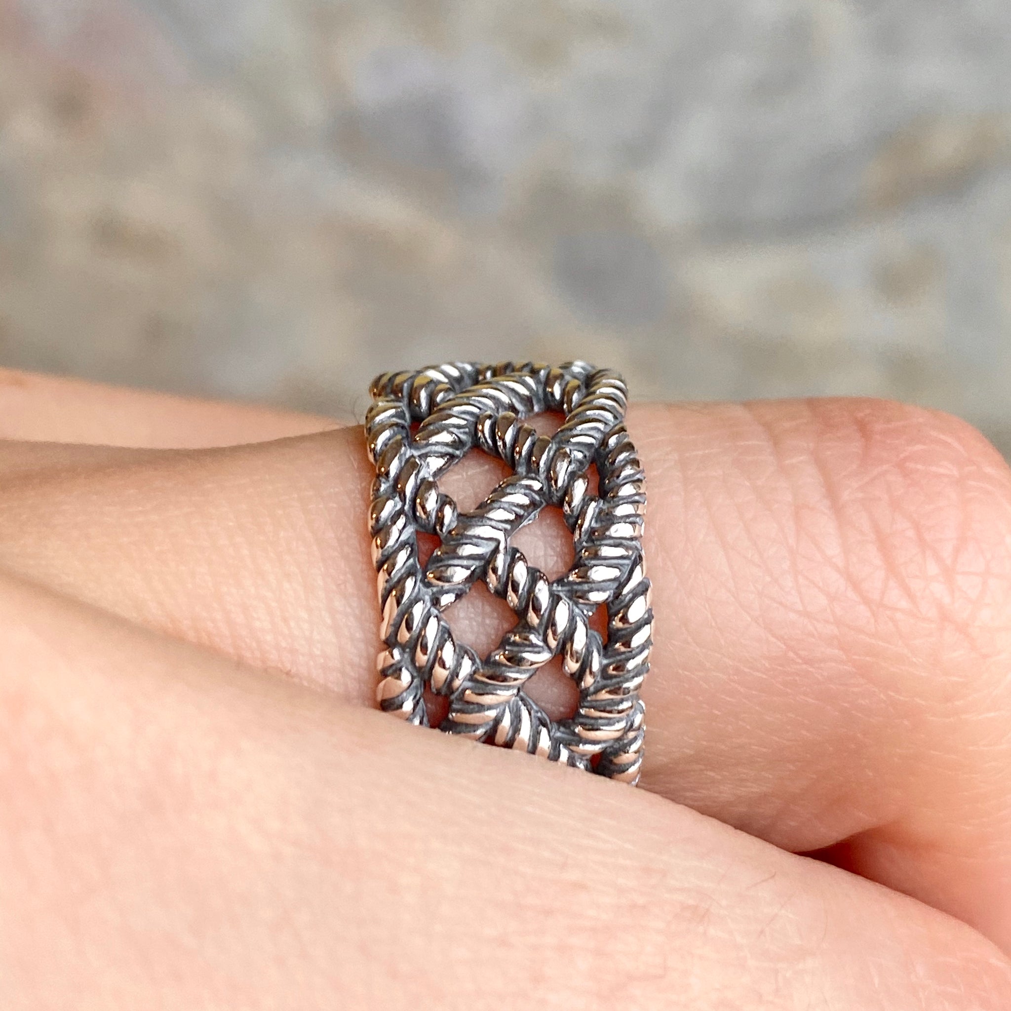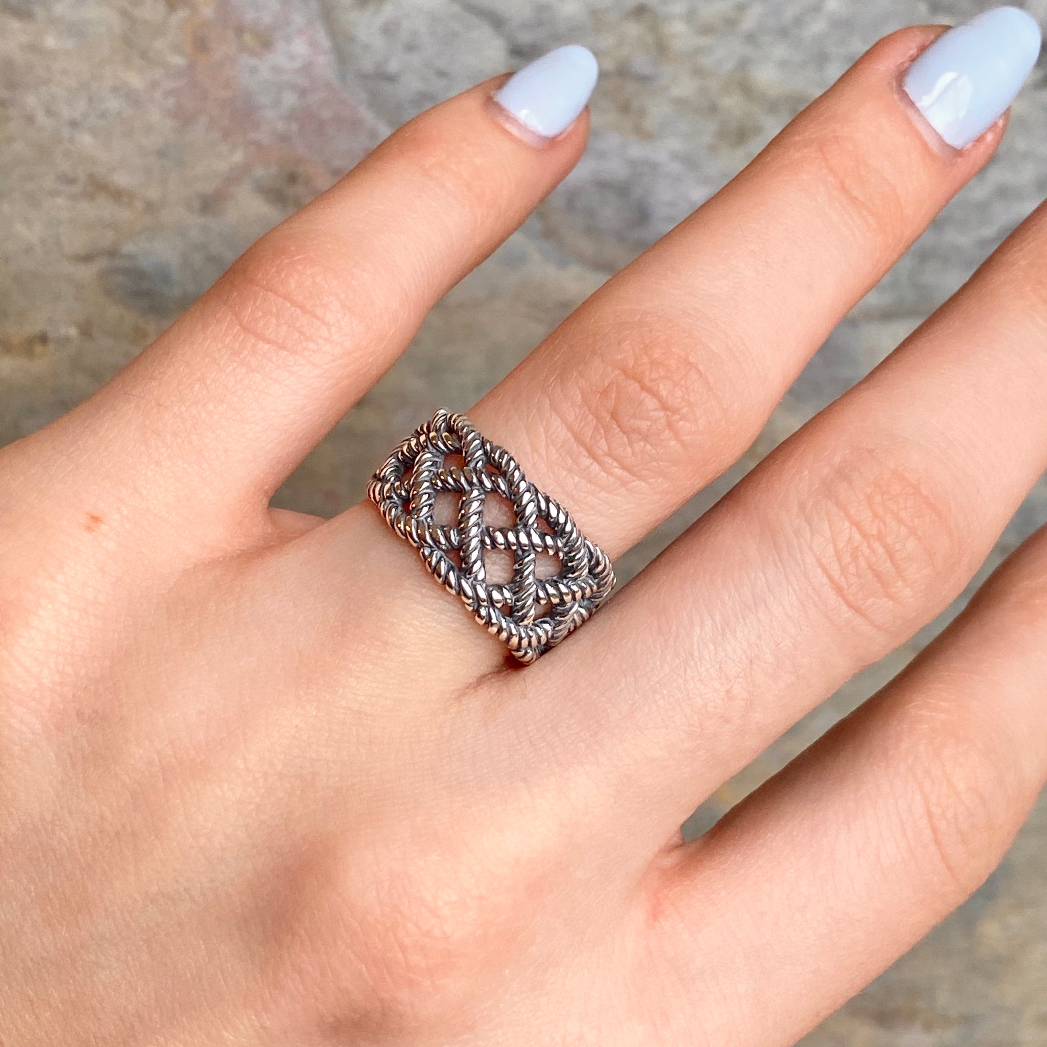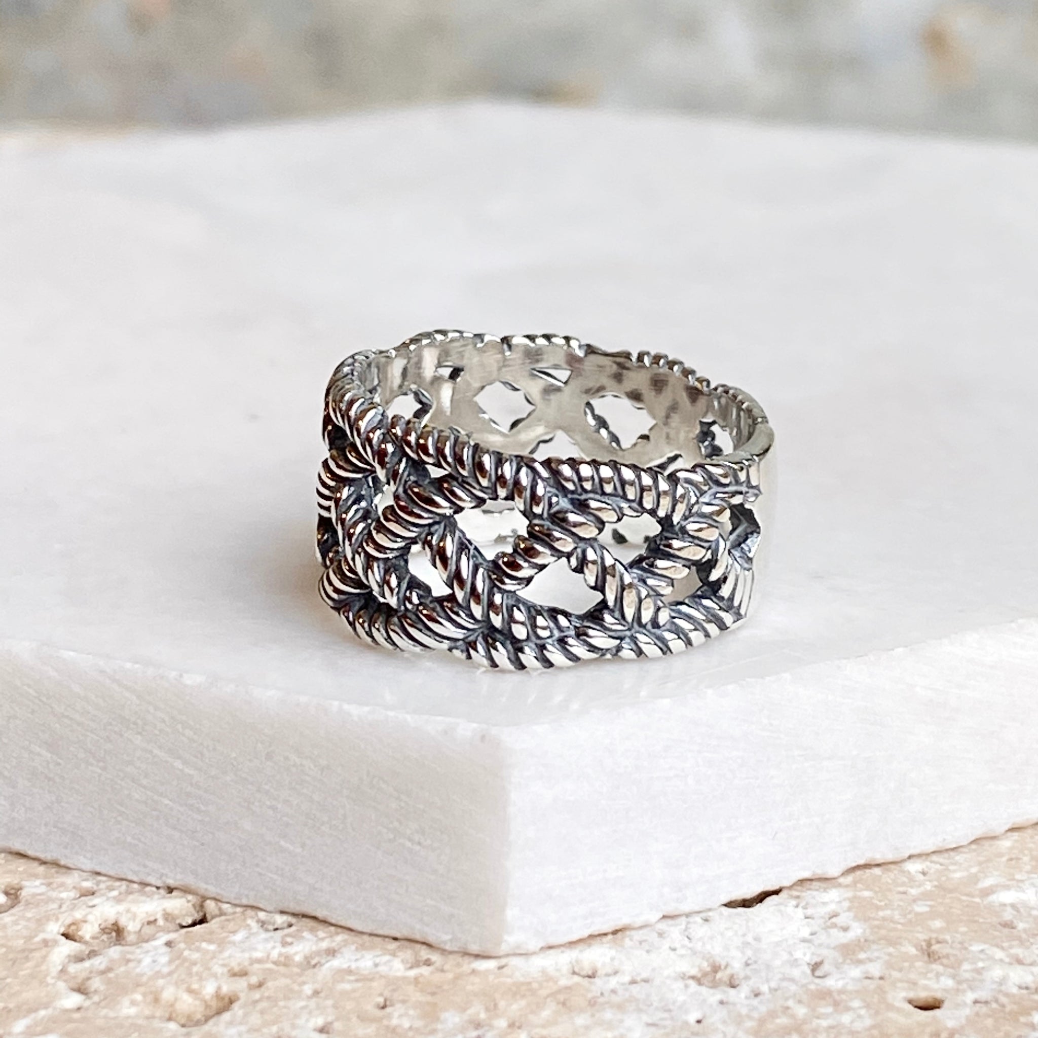 Sterling silver oxidized woven rope cigar band ring. This sterling silver ring features a woven rope design, oxidized to highlight its detail!