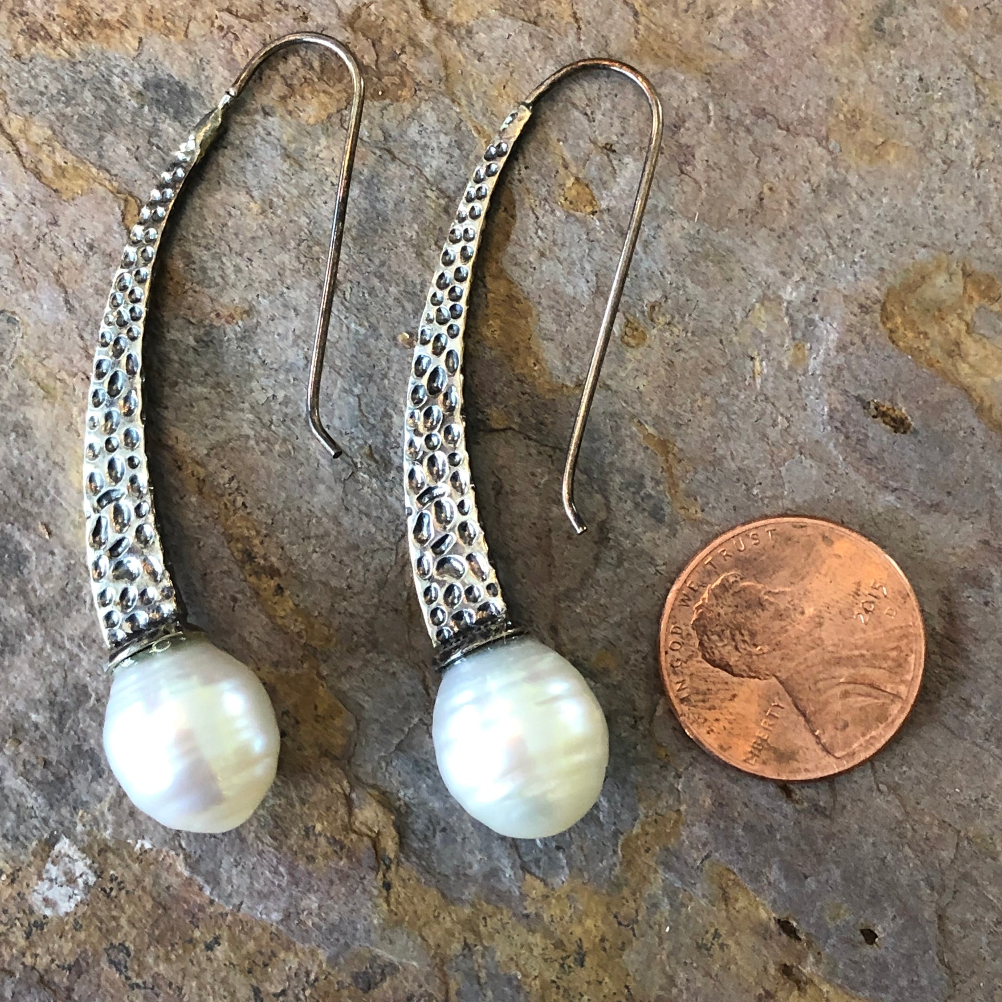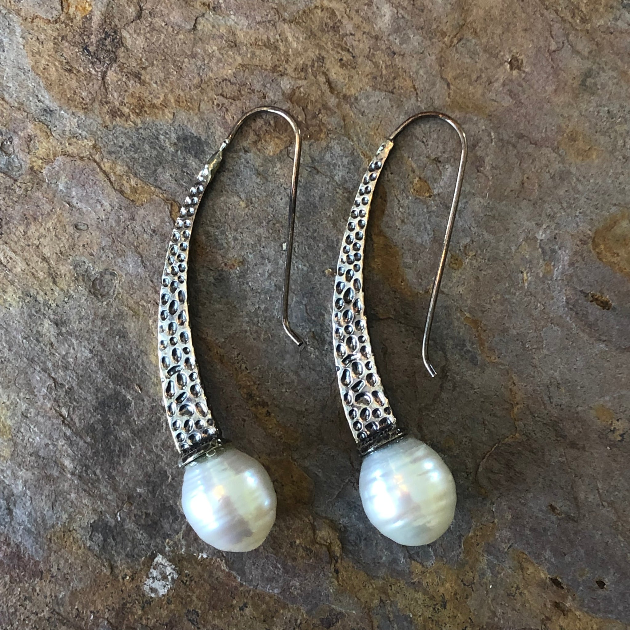Sterling Silver + Paspaley South Seal pearl textured design earrings.