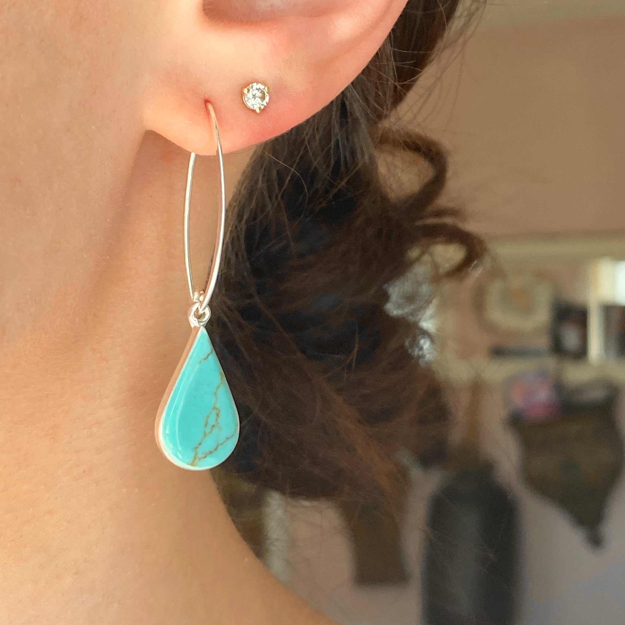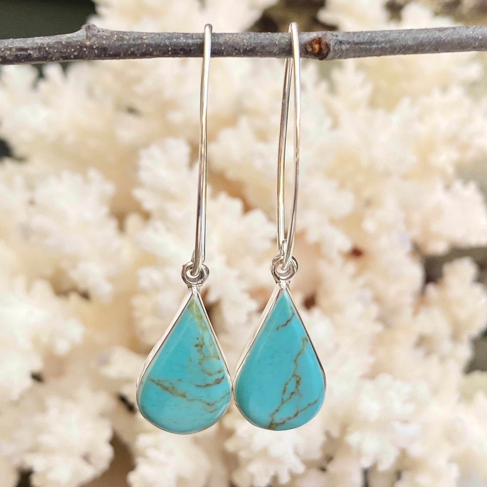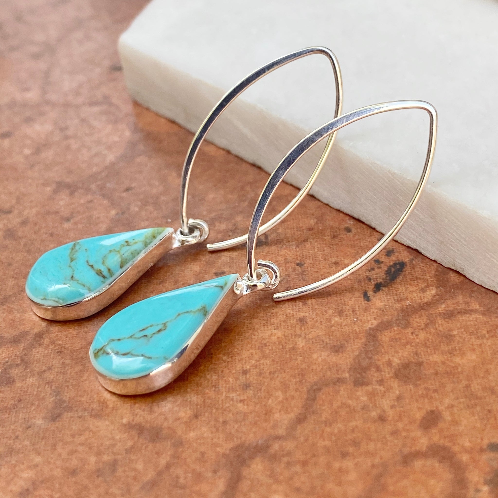 Sterling silver marquise-shaped ear wires with pear-shaped turquoise gemstones. Pretty pop of color earrings! The matrix of the turquoise stone is unique- no two stones are the same!