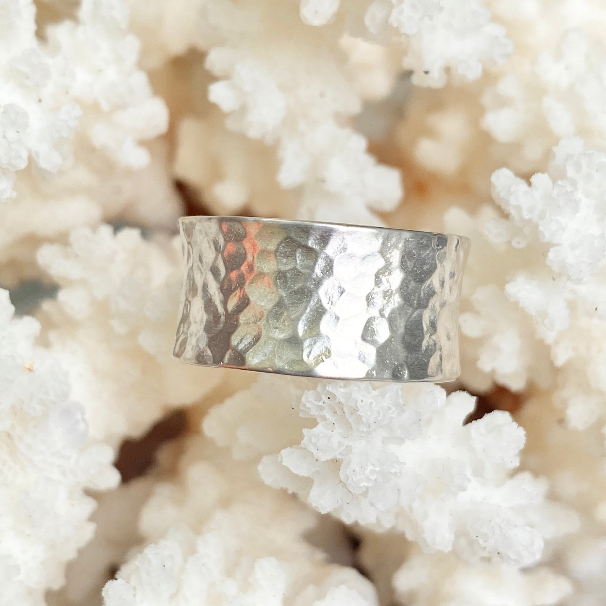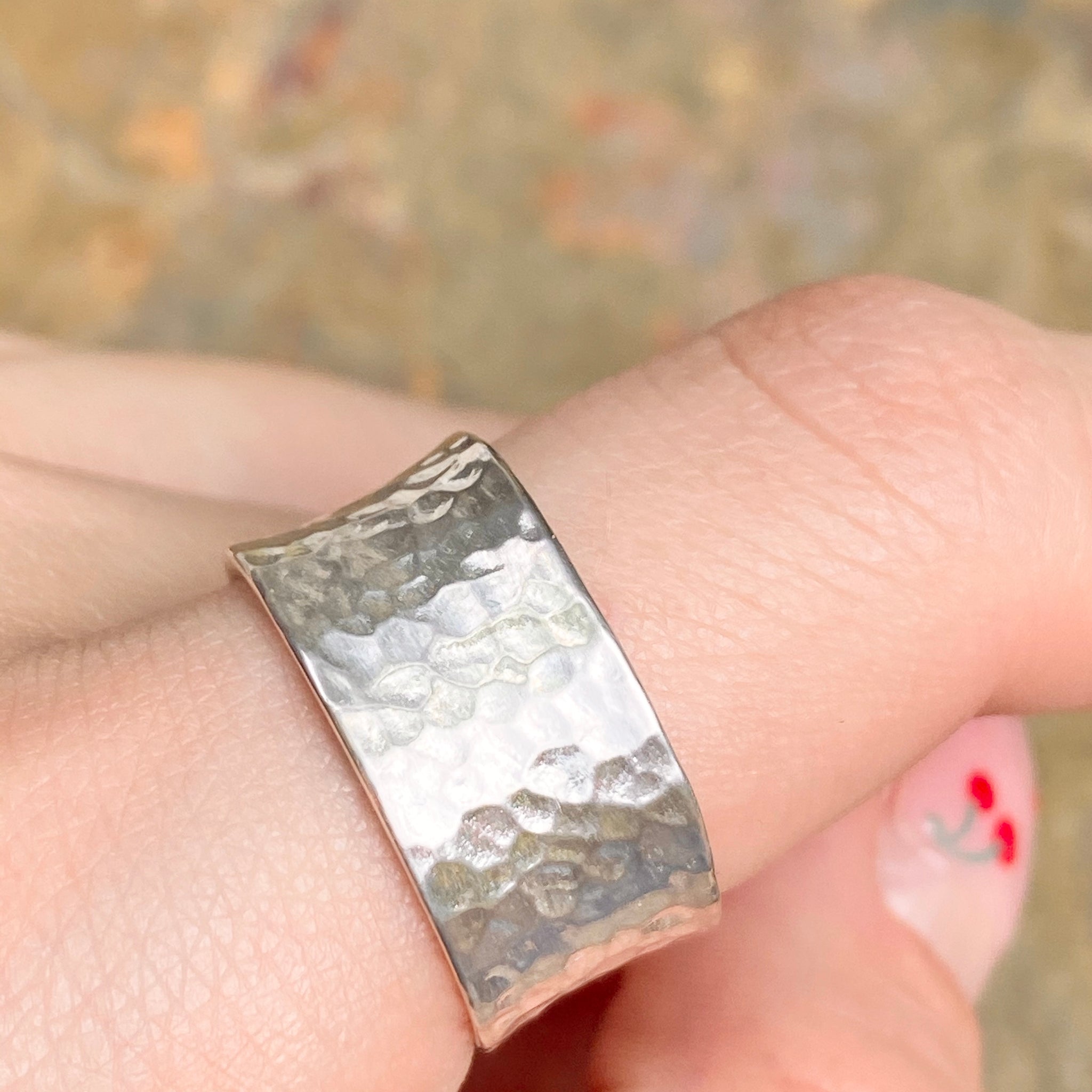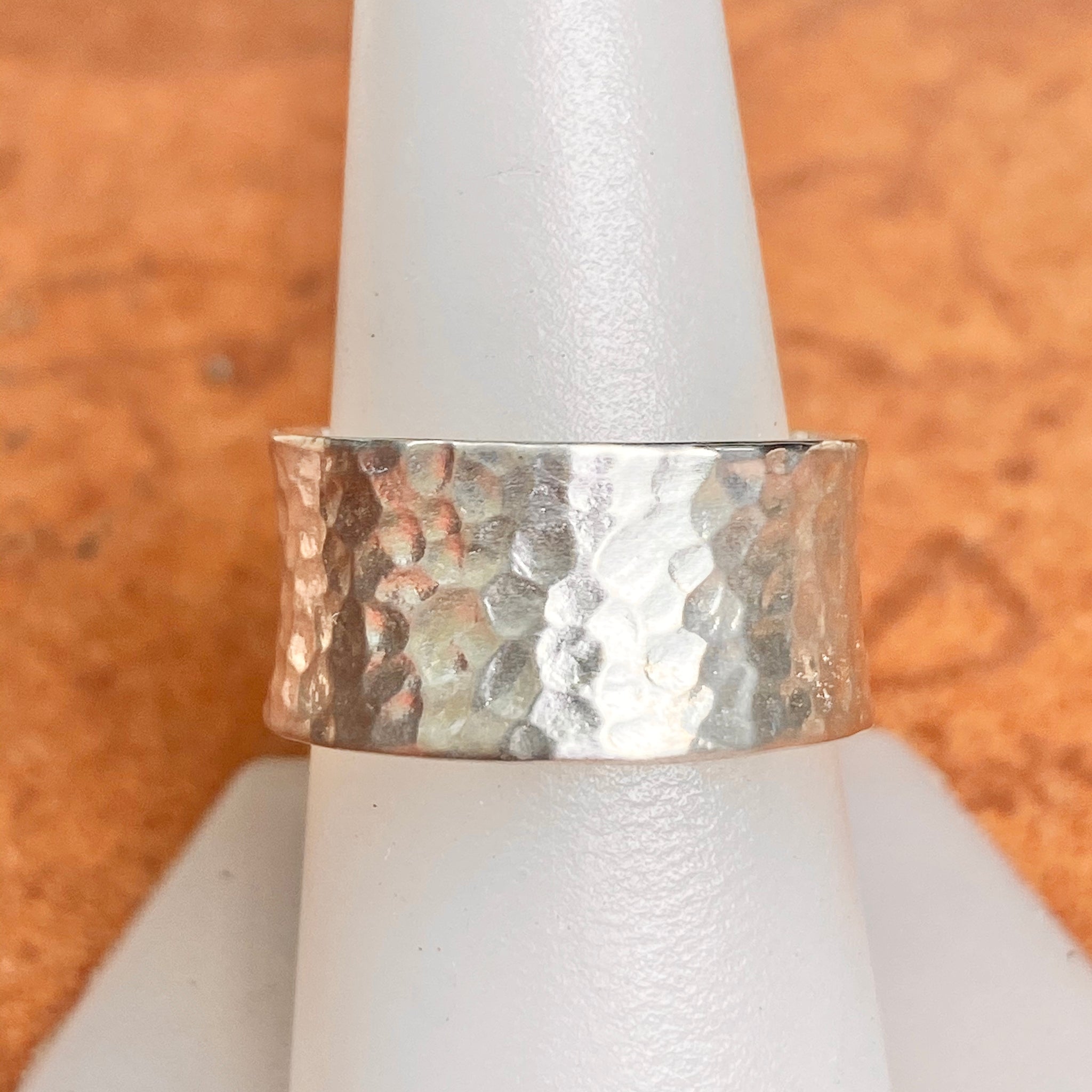 Sterling silver polished hammered-effect concave cigar band ring. Wide all the way around the ring- because of this, you may need to size up one size for best fit. What a statement this contemporary ring makes!