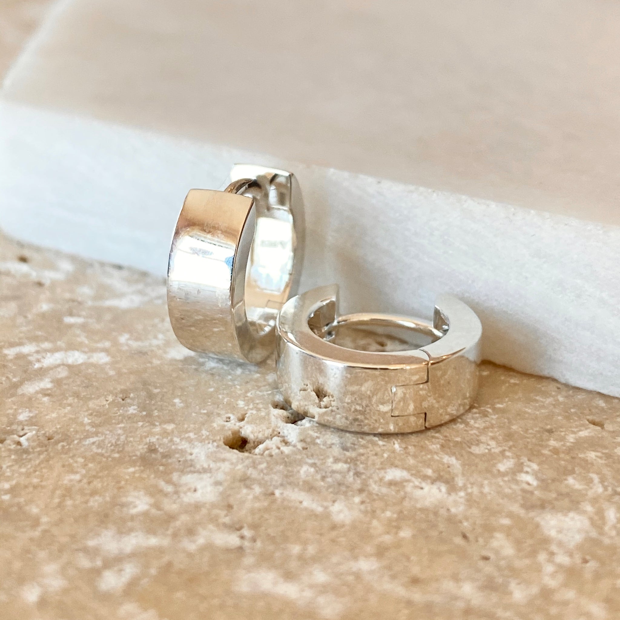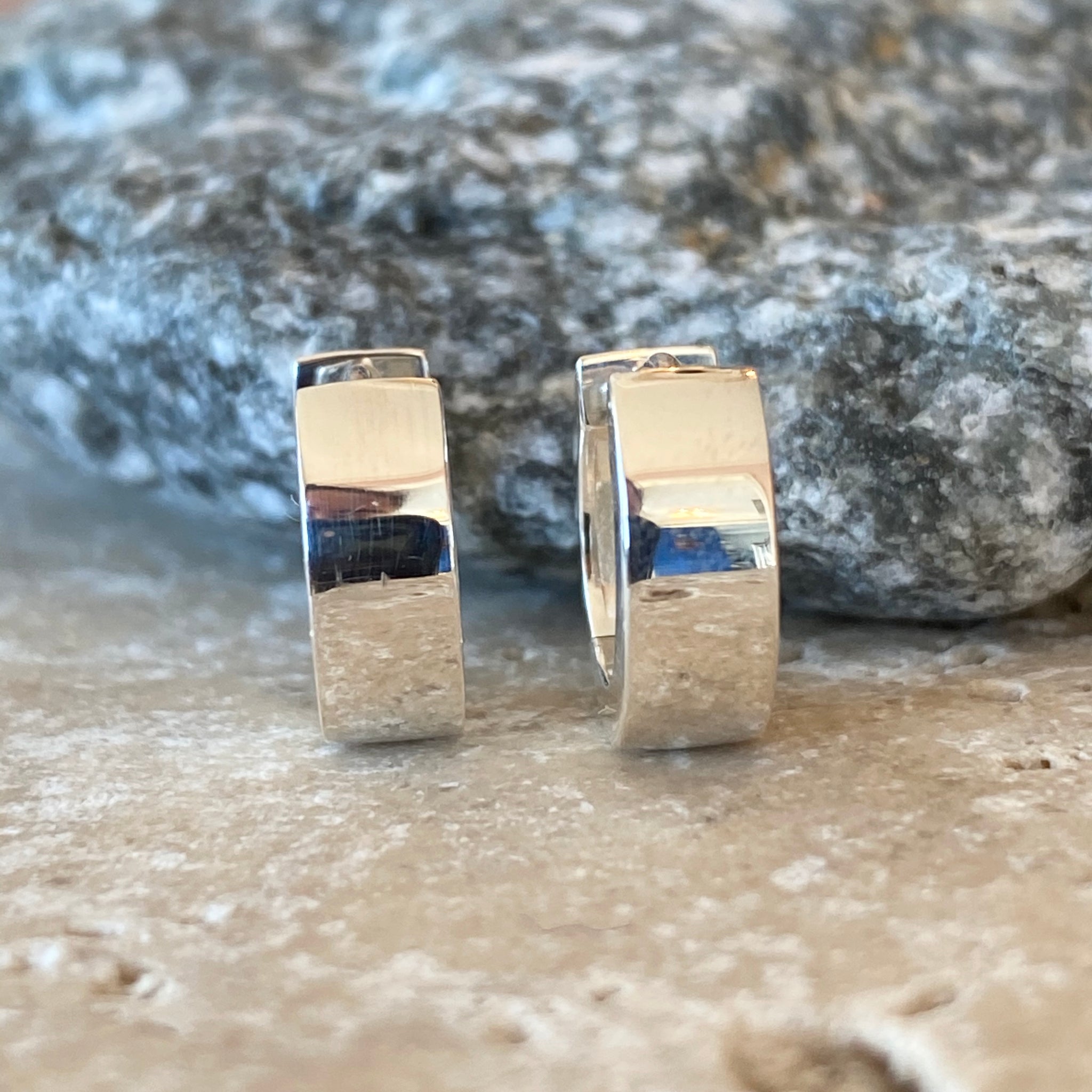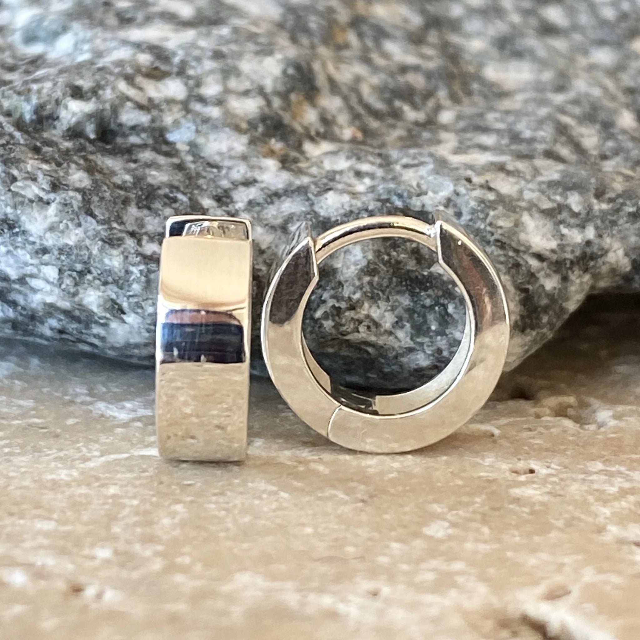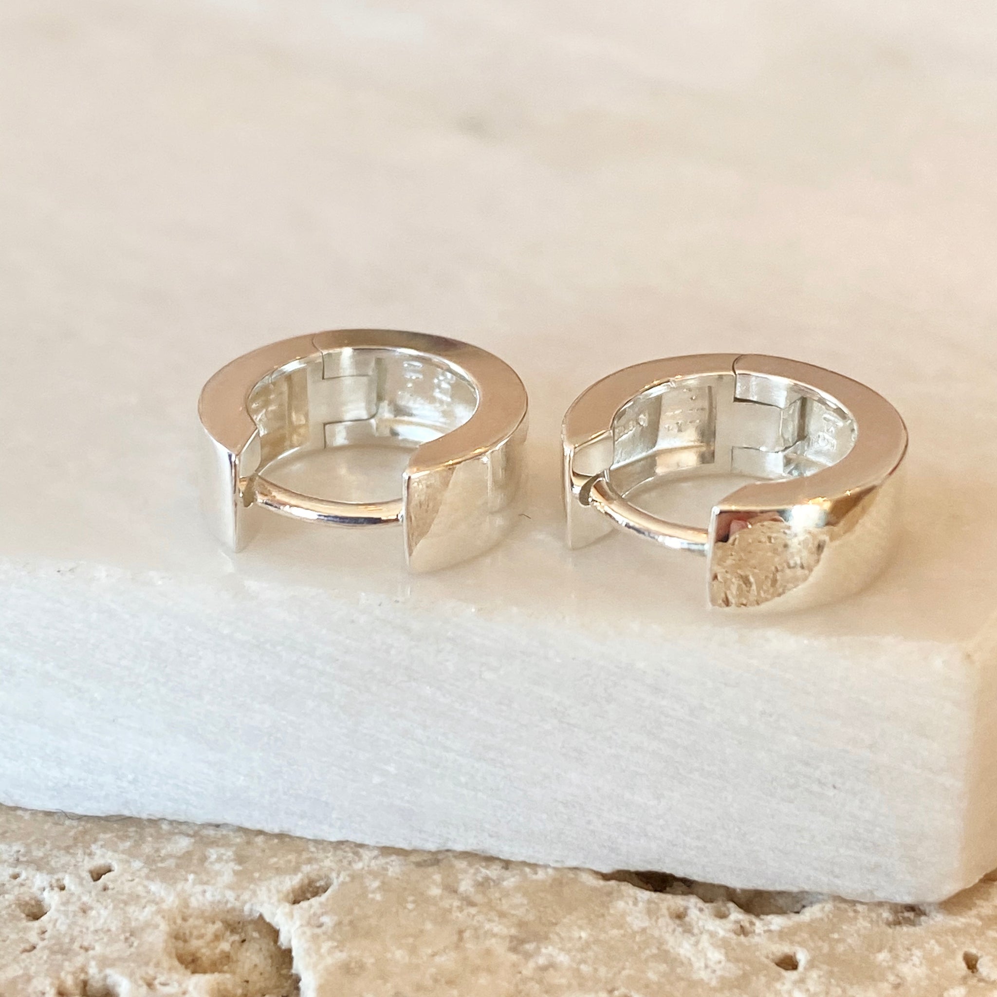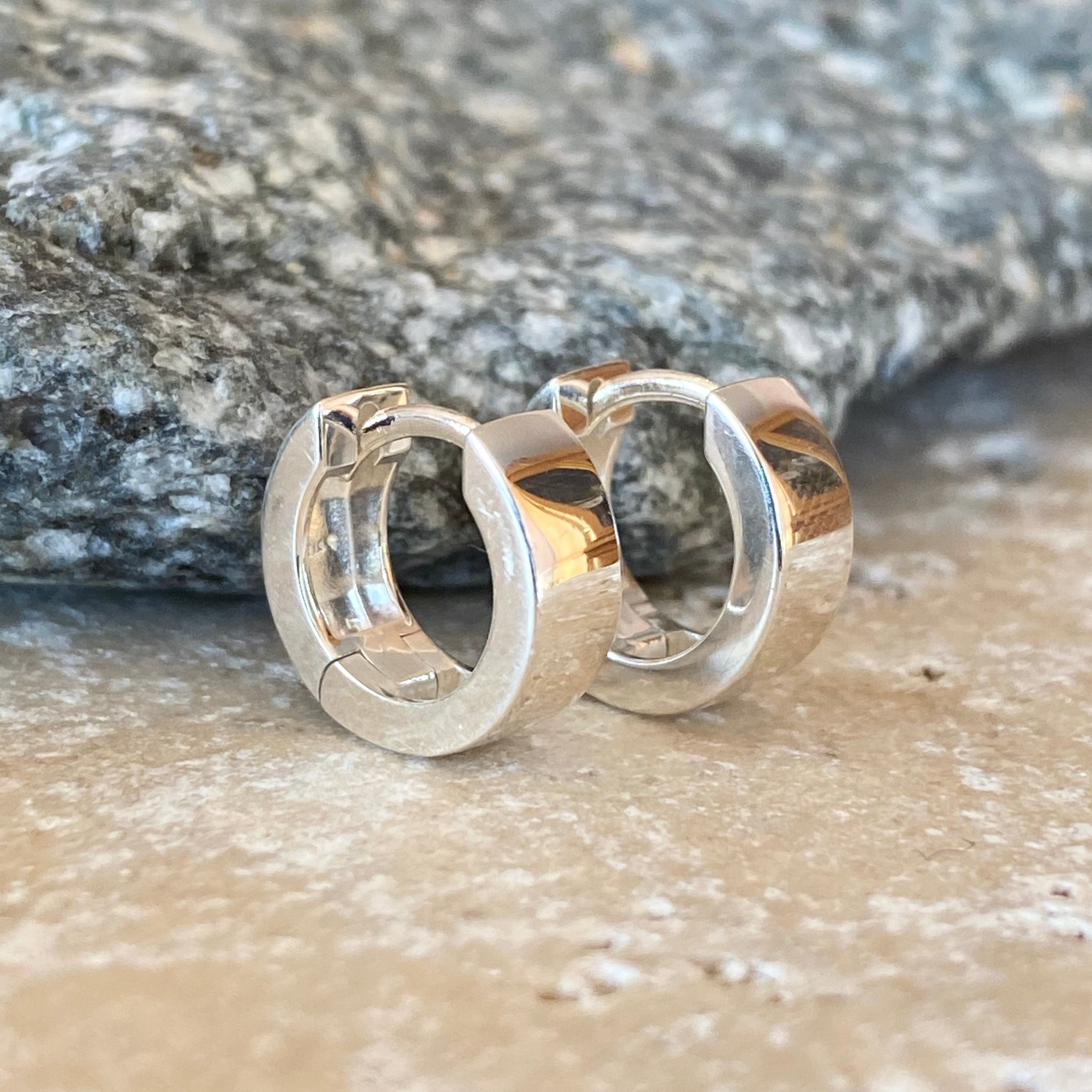 High polished sterling silver small, hinged huggie hoop earrings. The perfect little hoops you can wear with just about anything!