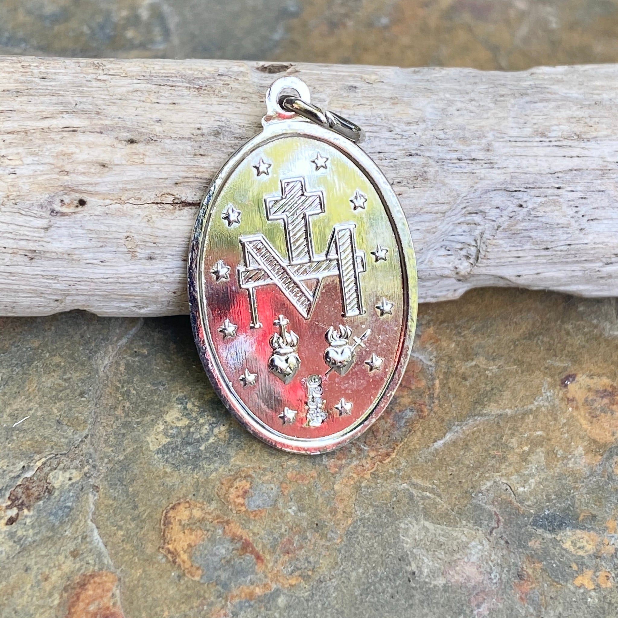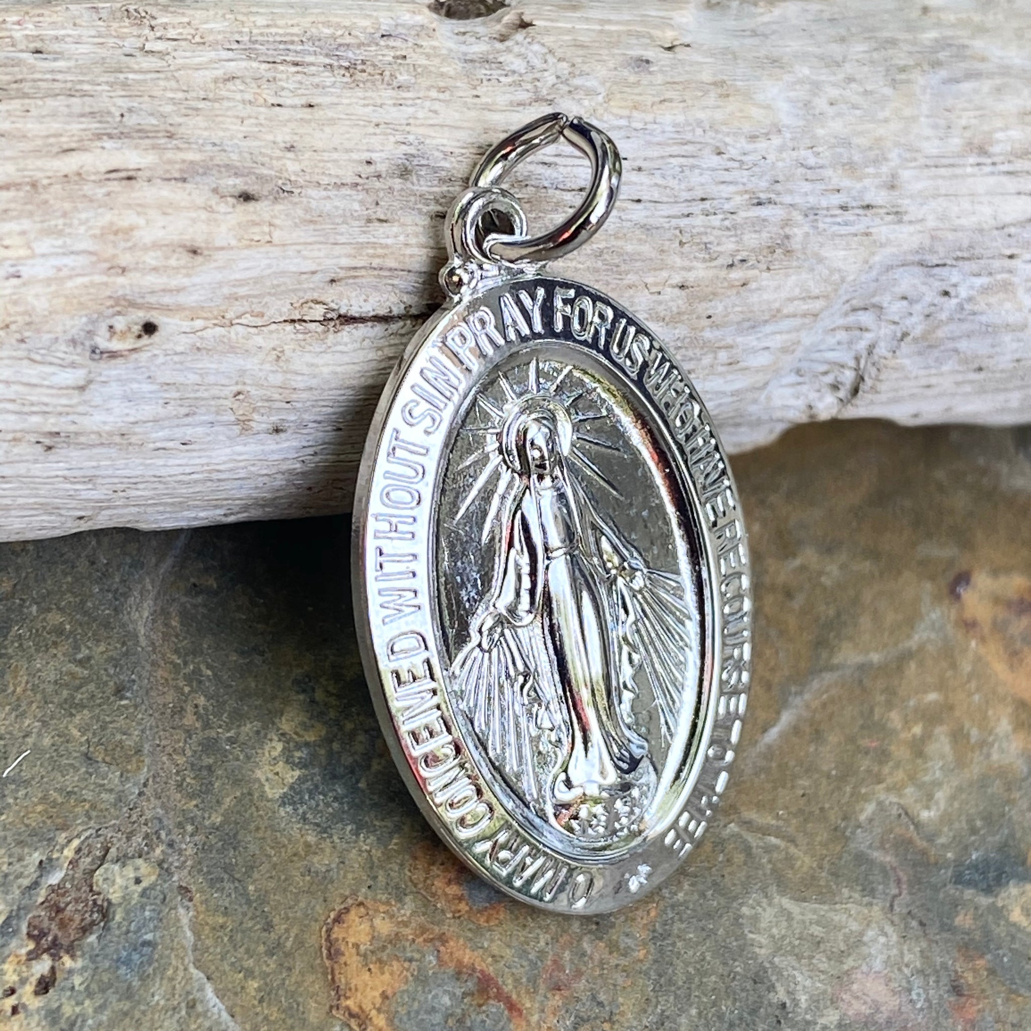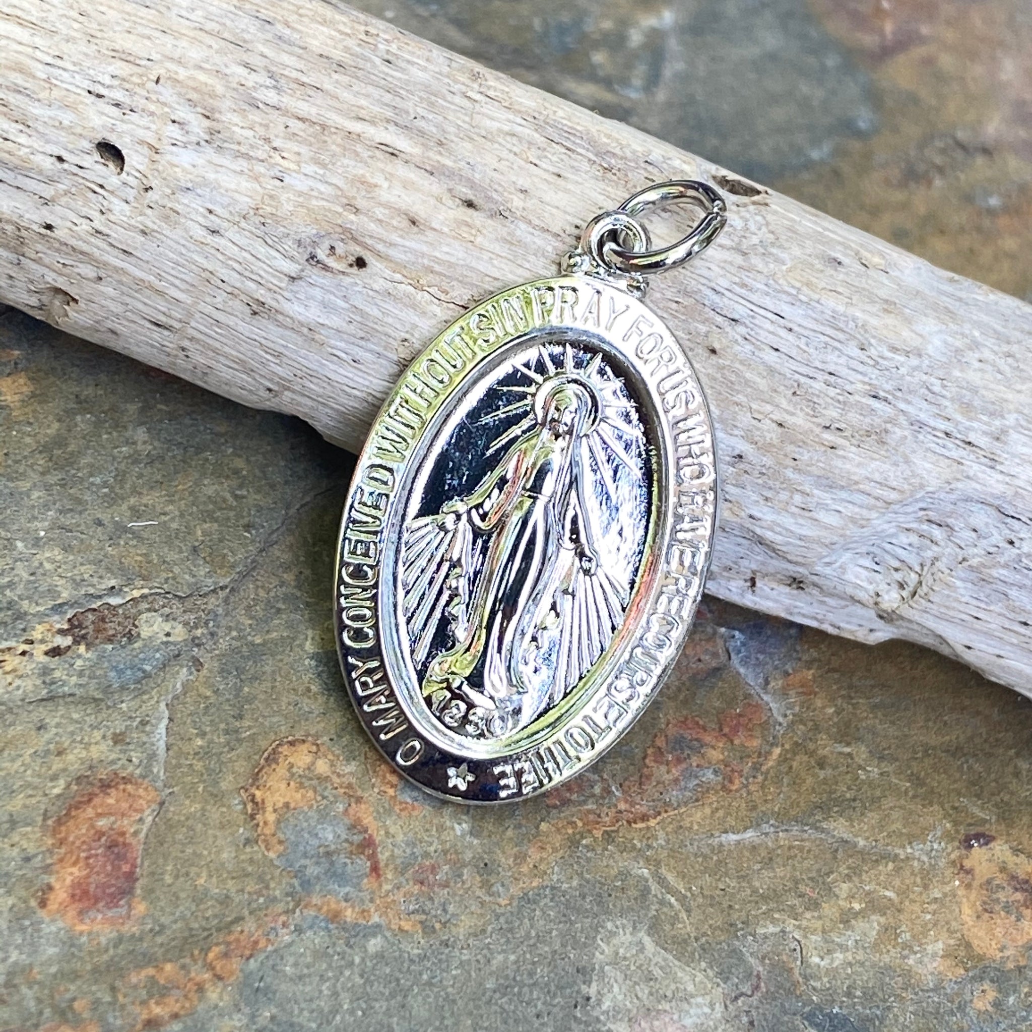 High polished, oval shaped Miraculous Medal pendant. Reversible pendant with Miraculous Medal stamping on the backside. Simply pair it with one of our sterling silver chain necklaces!