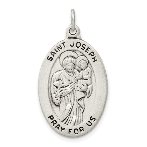 Polished sterling silver St. Joseph "Pray for Us" oval pendant. St. Joseph is the patron saint of families, workers, and the universal church. Simply pair it with one of our sterling silver chain necklaces!